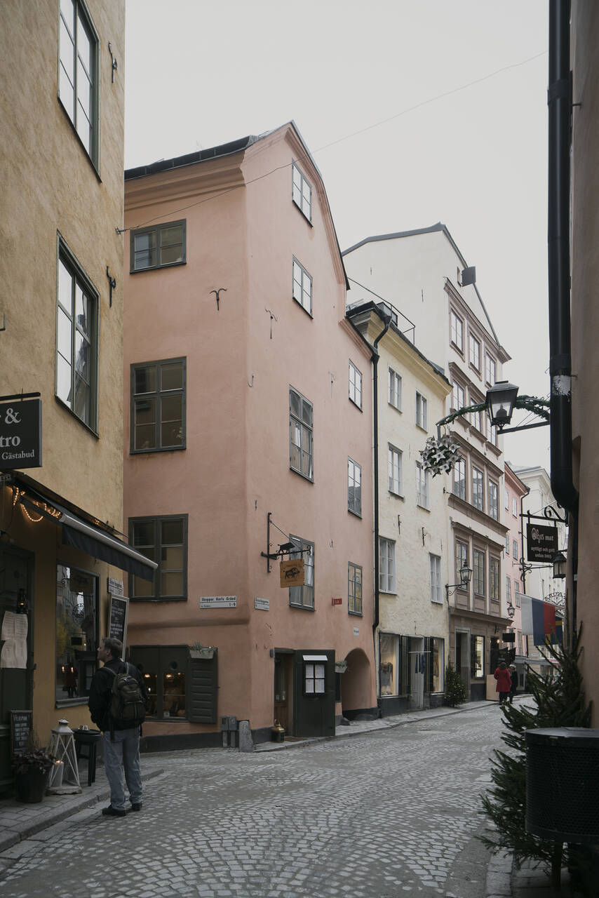 “The Wichman House” is one example of the old medieval brick houses in Stockholm Old Town. The old walls of the main part of the building rise from street level and include the third floor. In the café in the ground floor (previously used for different purposes, such as shop, storage - even for animals - and as a tavern) the original wooden raftered ceiling can be seen, probably as old as from the 1480’s.