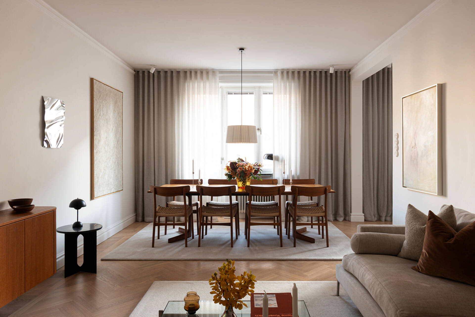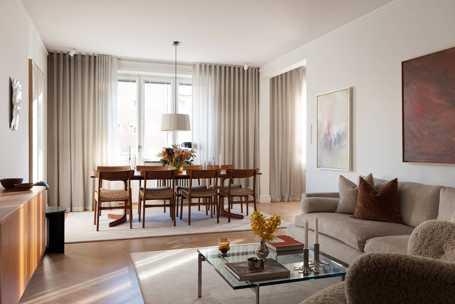 Omsorgsfullt renoverad och optimalt planerad våning om 115 kvm disponerat över 4 rum och kök. Bostaden har renoverats smakfullt till en mycket hög standard som tar hänsyn till originaldetaljer och funkisattribut. Våningen erbjuder ett ljust vardagsrum med matsal, balkong och öppen spis. Utsökt platsbyggt kök från Nordiska Kök med köksö och arbetsytor i kvartsit samt högkvalitativ maskinell utrustning från Miele. Master bedroom med platsbyggda garderober och två mindre sovrum med bra förvaring varav ett med utgång till balkong. Två badrum varav ett med badkar samt separat gästtoalett. Balkongerna har sydvästläge och sol hela dagen. Tvättrum. Praktiskt plejdsystem för all el. Bra och stabil förening. Med Tessinparken samt Gärdets vidder inom kort promenadavstånd finns allt man kan önska. Fältöversten och Karlaplans tunnelbana samt extensivt bussnät inom ett par minuters promenad. Varmt välkomna på bokad visning.