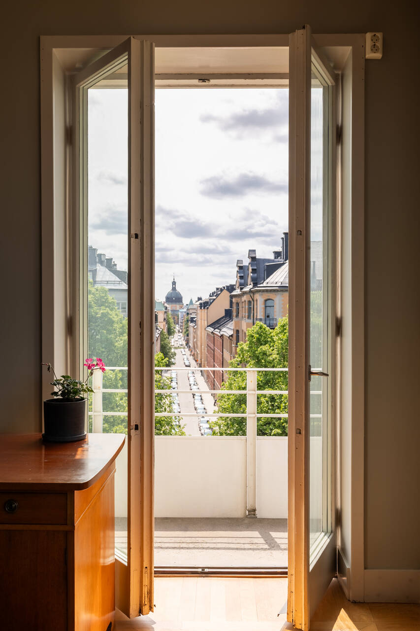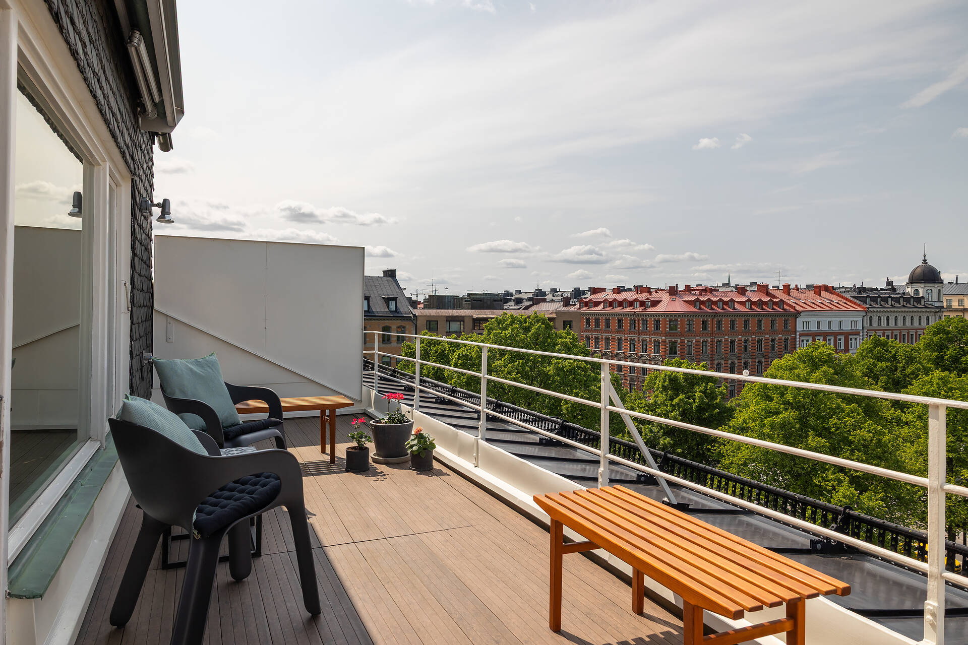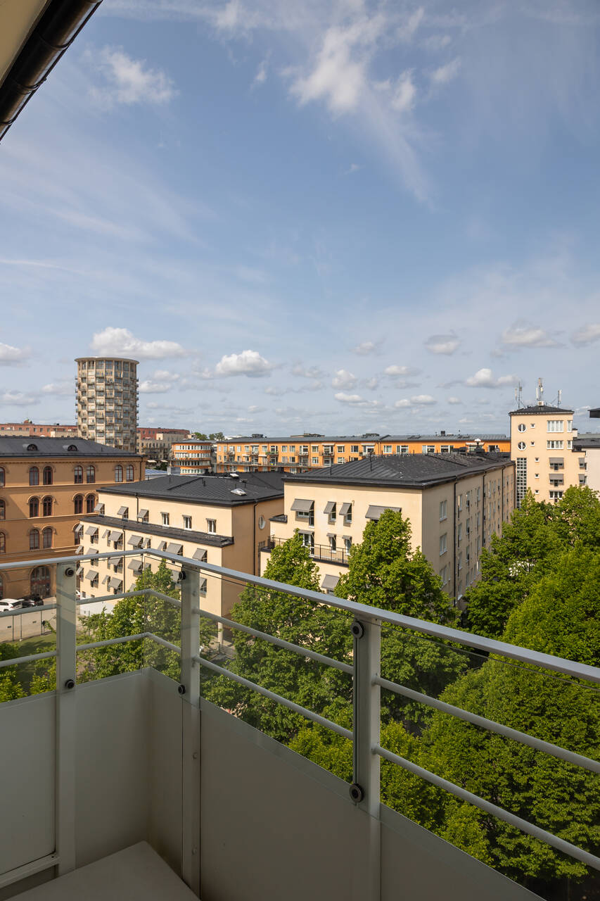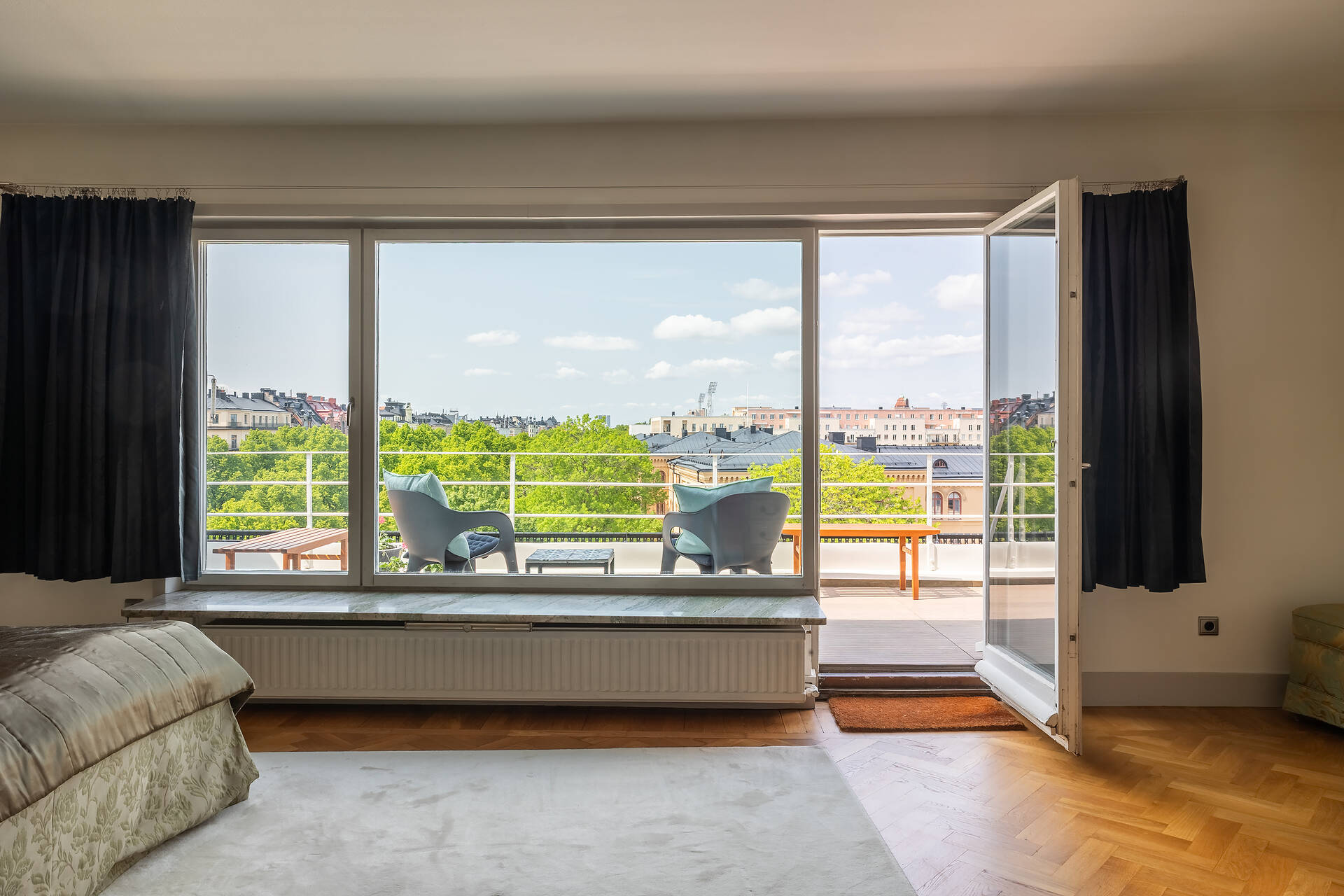 På plan sex finns ytterligare en öppen spis samt master bedroom med platsbyggda garderober i anslutning. Vaxad fiskbensparkett. Terrass i väster med vatten och eluttag. Badrum från 2015 med takfönster och exklusiv sten på väggar och golv. Dusch, vägghängd toalett och handfat. På detta plan finns även ett förråd.