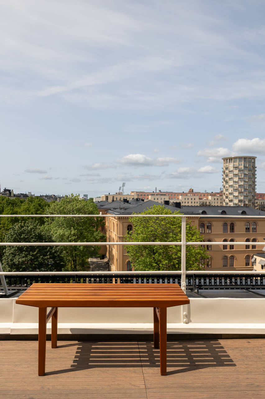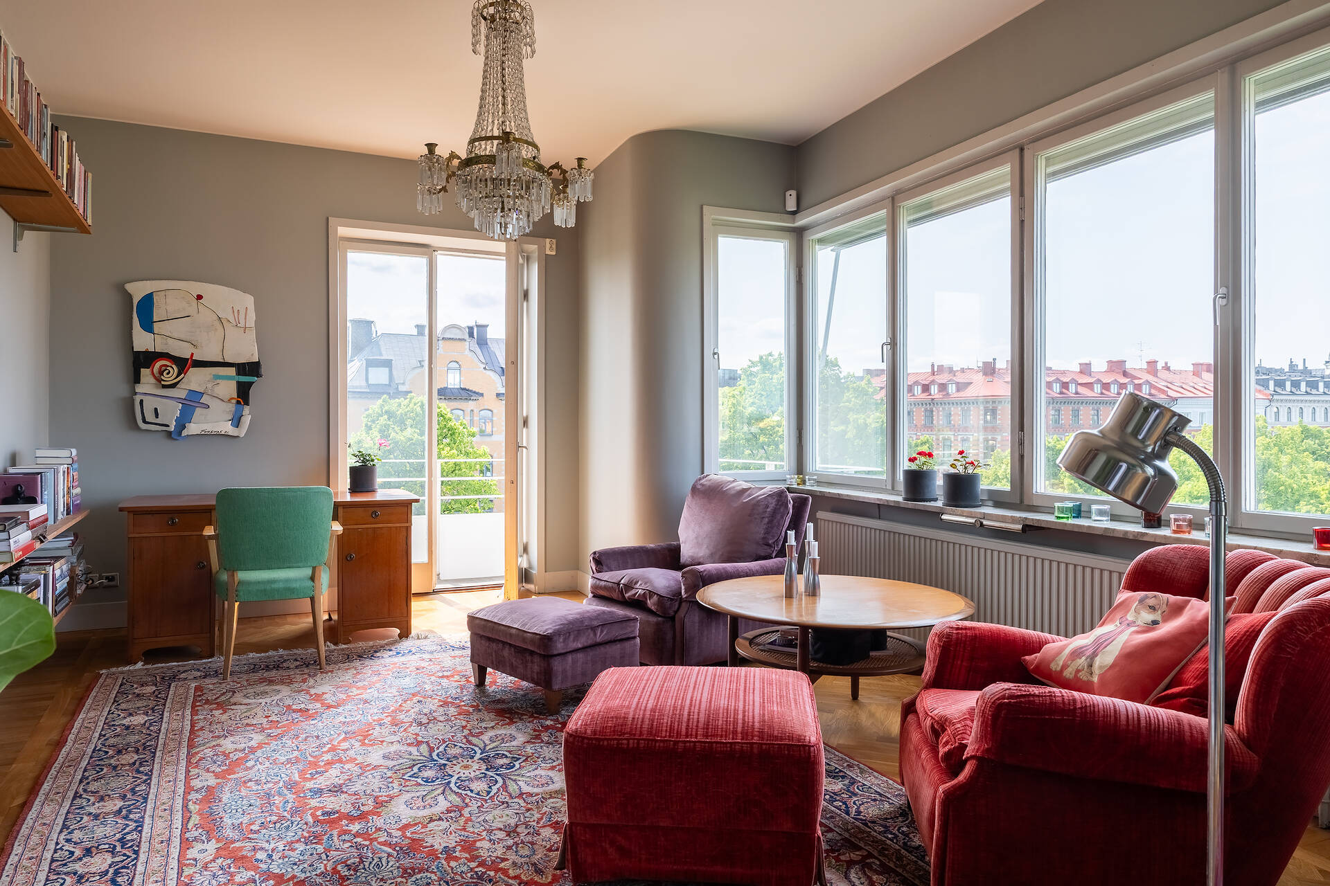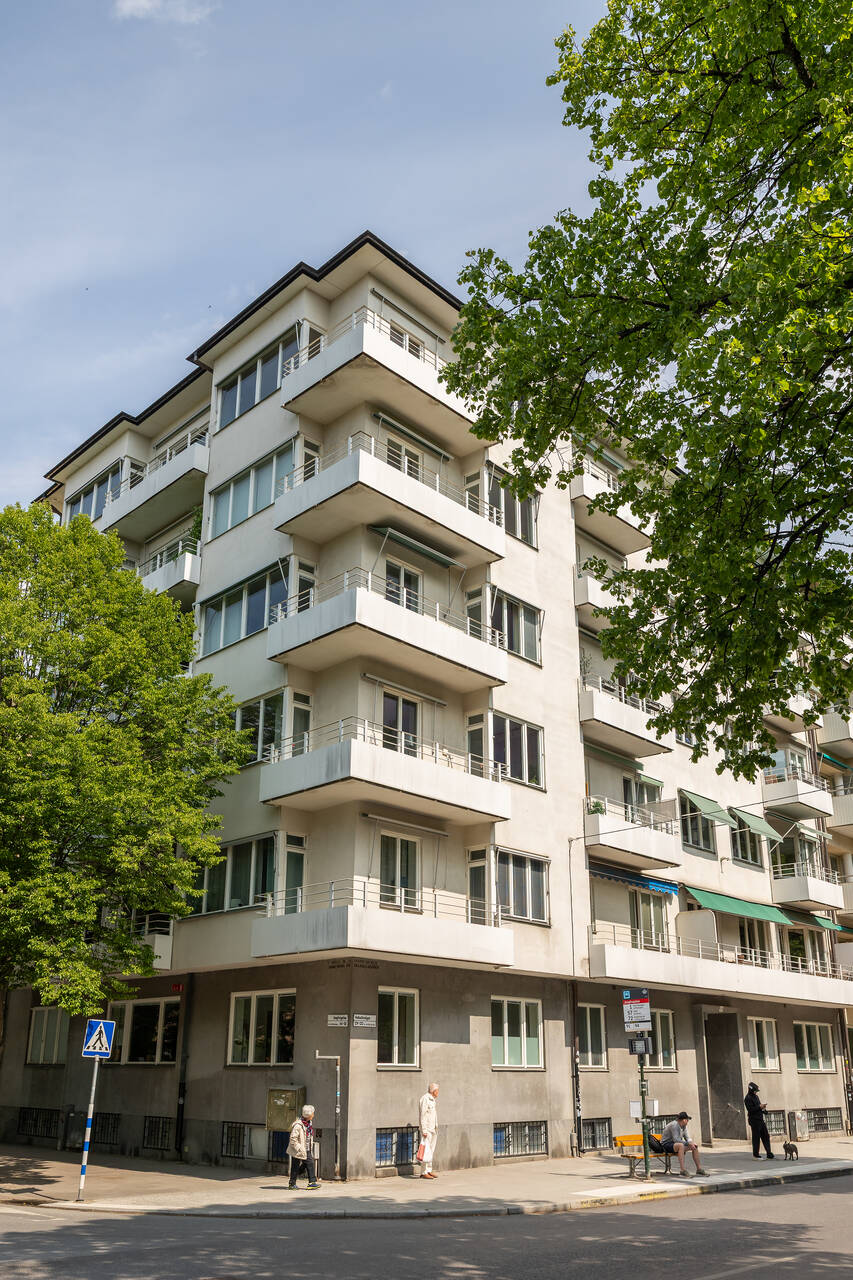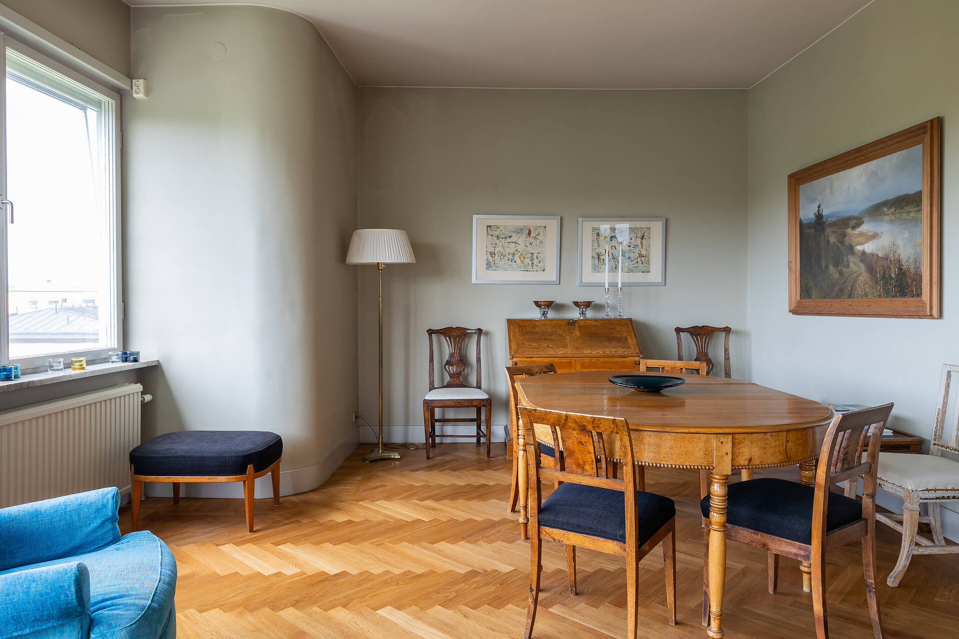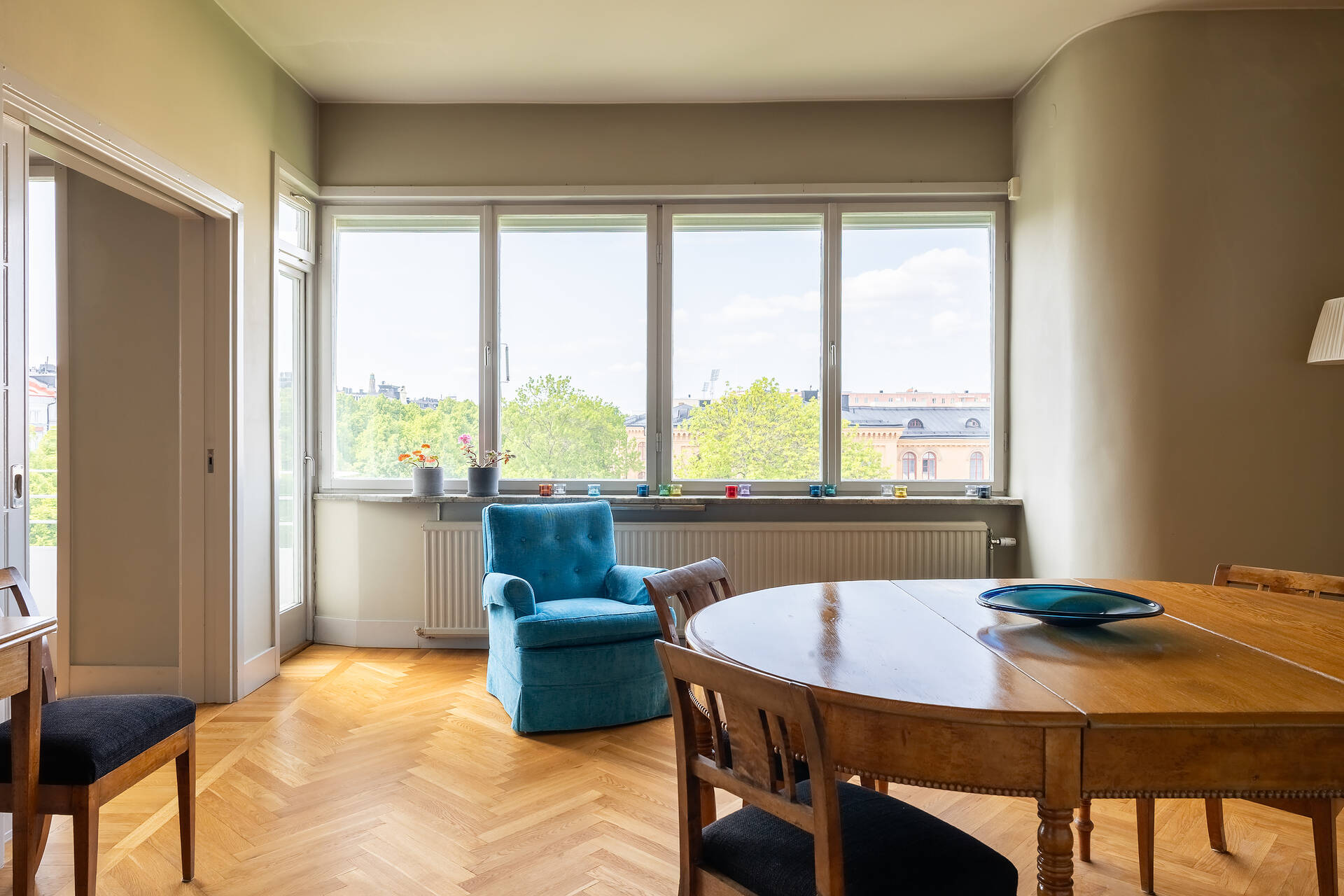 Med attraktivt och högt läge på Östermalm/Gärdet ligger denna ljusa och härliga hörnétagevåning om 193 kvm med terrass i väster, två öppna spisar och tre balkonger i söder, väster samt norr med fri sikt. Våningen är väl underhållen samtidigt som originaldetaljer och charm bevarats. Generösa och vackra sällskapsrum i fil med stora fönsterpartier ger skön rymd och flödande ljus. Stilrent kök med köksö i rostfritt. Tre till fem sovrum samt två badrum. Vacker trappa binder ihop våningsplanen. Föreningen har en parklik innergård med fontän och utemöbler. Låg avgift samt stabil förening. Ett mycket eftertraktat boende i funkisfastighet ritad av arkitekt Albin Stark anno 1937.
