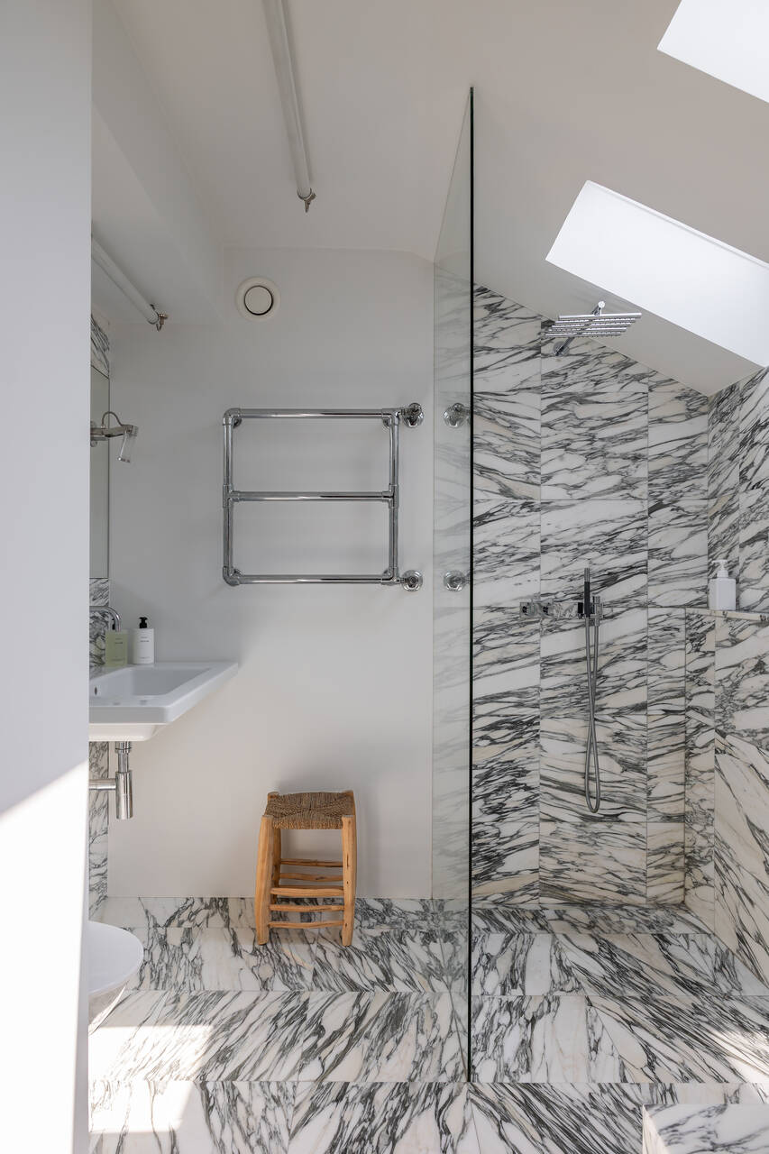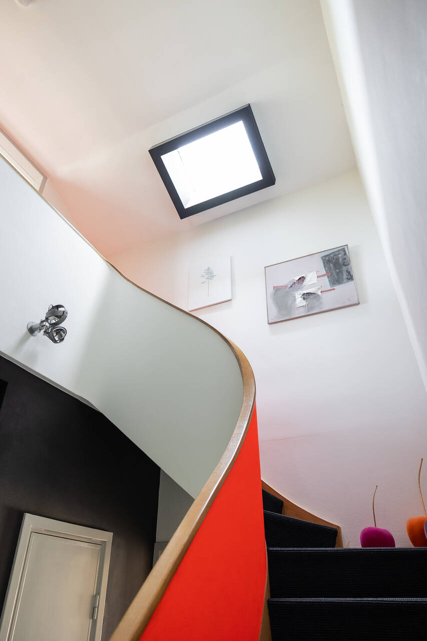 I hallen återfinns den svängda trappan vackert accentuerad av ett takfönster som leder upp tilll våningens övre plan högst upp i fastigheten.