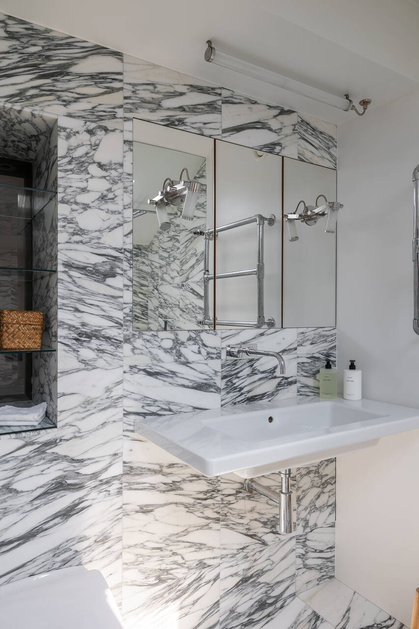 Välkomnande rymlig hall med avhängning och golv i kolmårdsmarmor. Gästtoalett.
