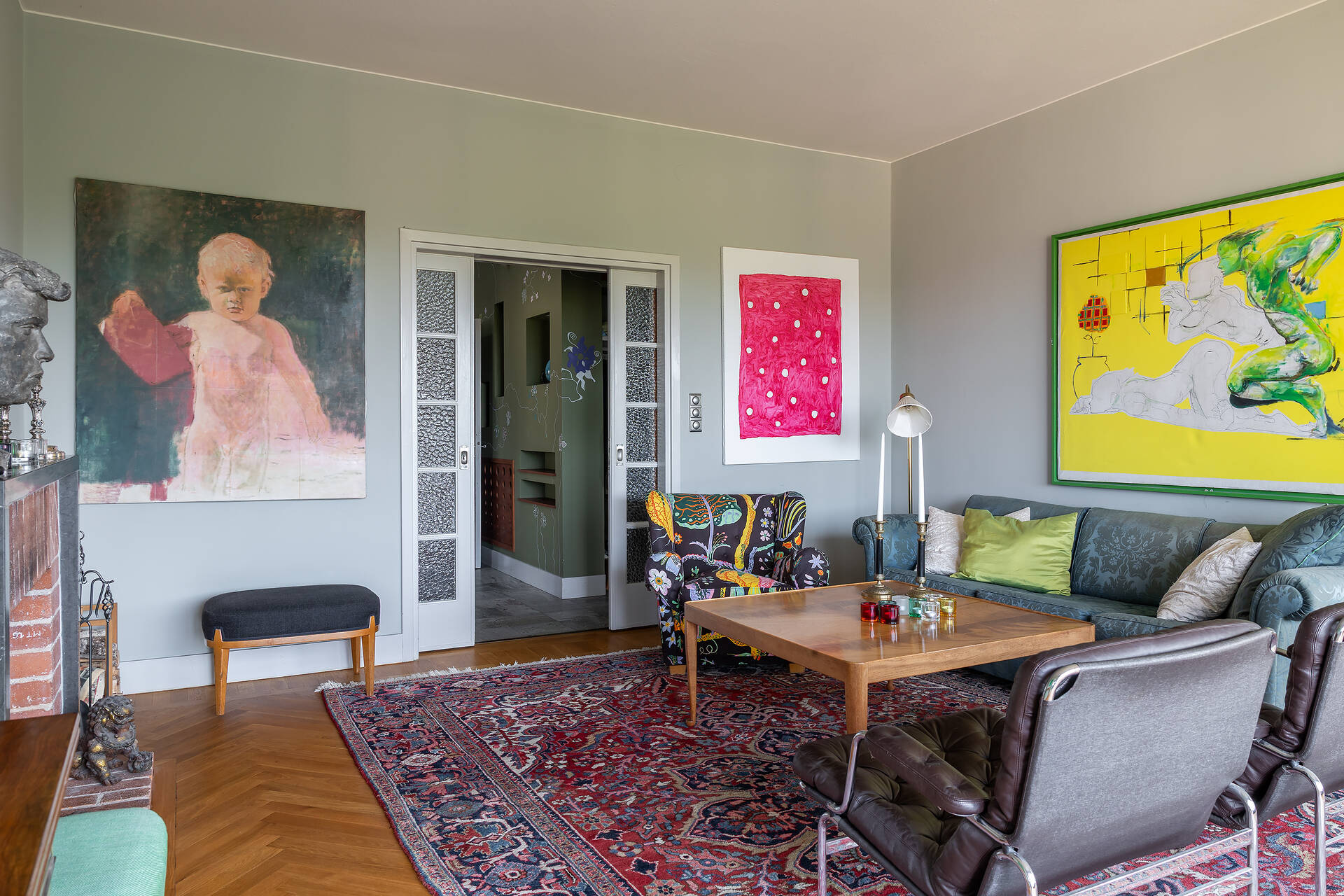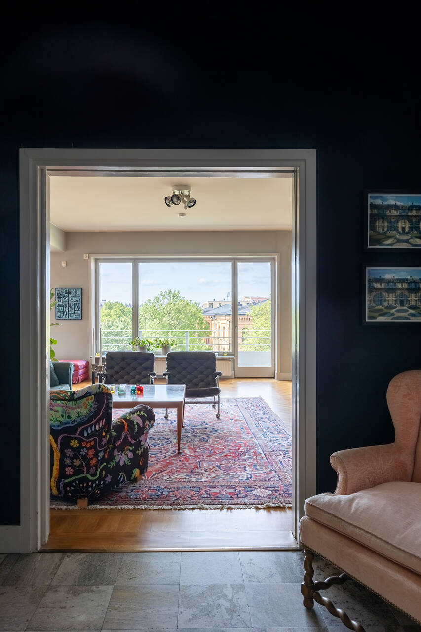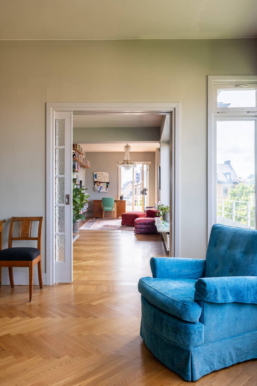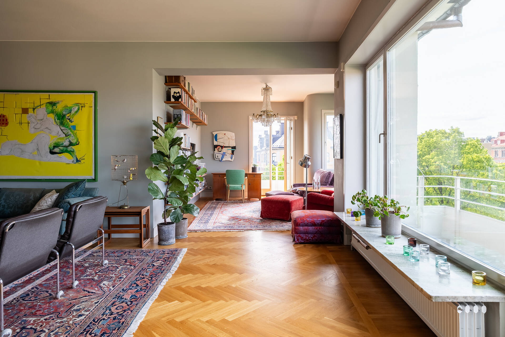 Hallen öppnar upp mot ett ljust vardagsrum med stort fönsterparti, öppen spis och utgång till balkong i väster. Ytterligare en salong i fil med vardagsrummet med balkong i söder. Vaxad fiskbensparkett.
