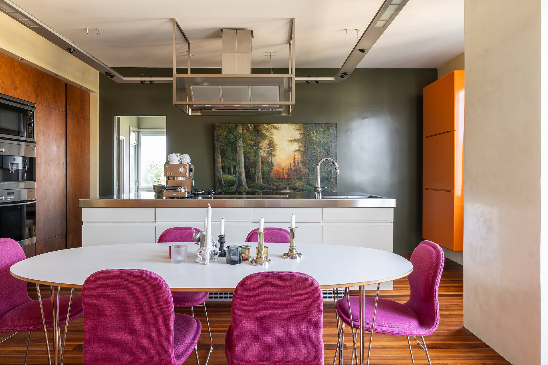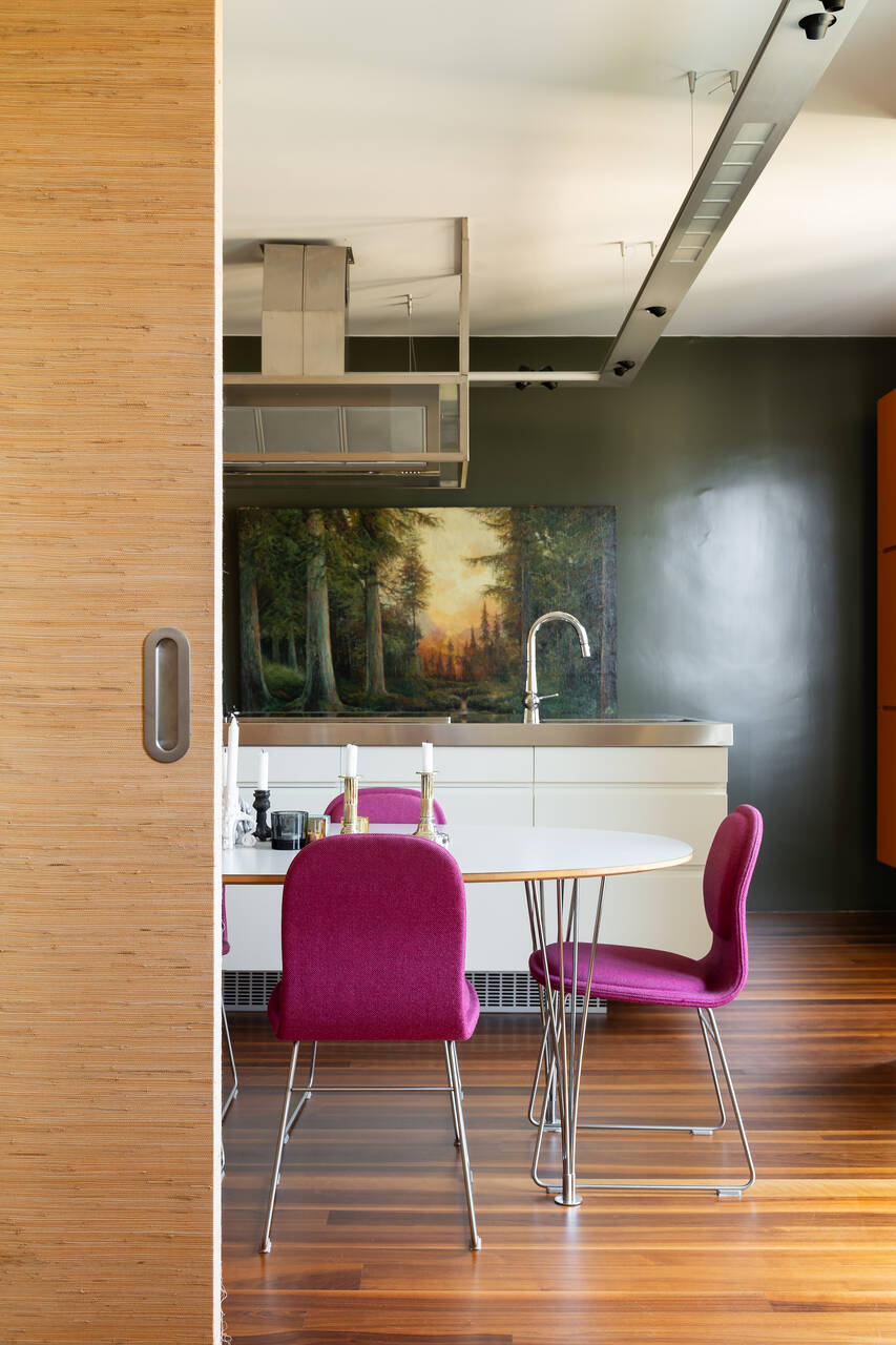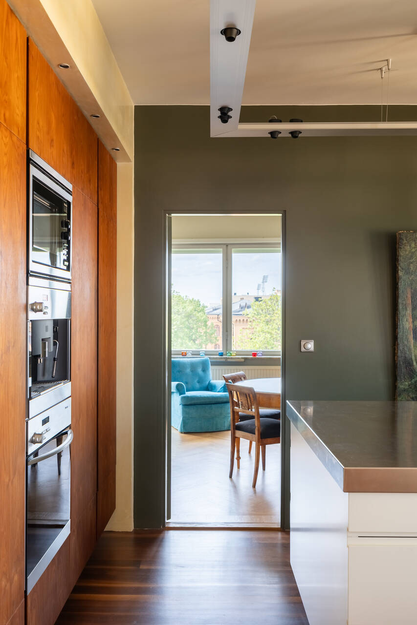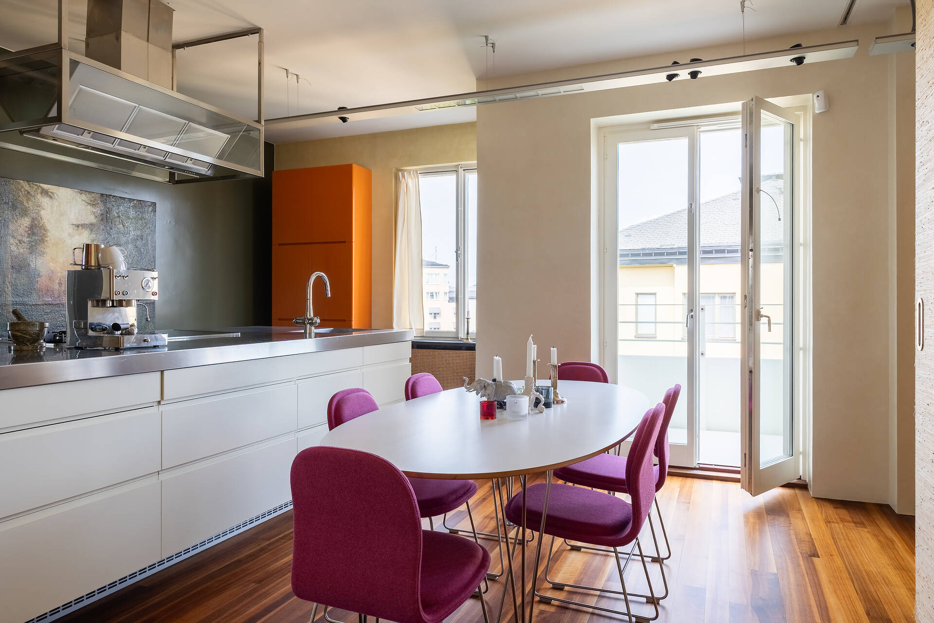 Matsalen i våningens nordvästra hörn, även det med vaxad fiskbensparkett, binder ihop kök och vardagsrum. Stilrent kök med stor köksö och balkong i norr, diskmaskin, induktionshäll samt en gasspis med två brännare och ugn, microvågsugn, kyl och frys. Tvättpelare. Samtliga vitvaror från Miele. I köksdelen finns en igensatt andra utgång (lätt att ta fram). Parkettgolv i valnöt.