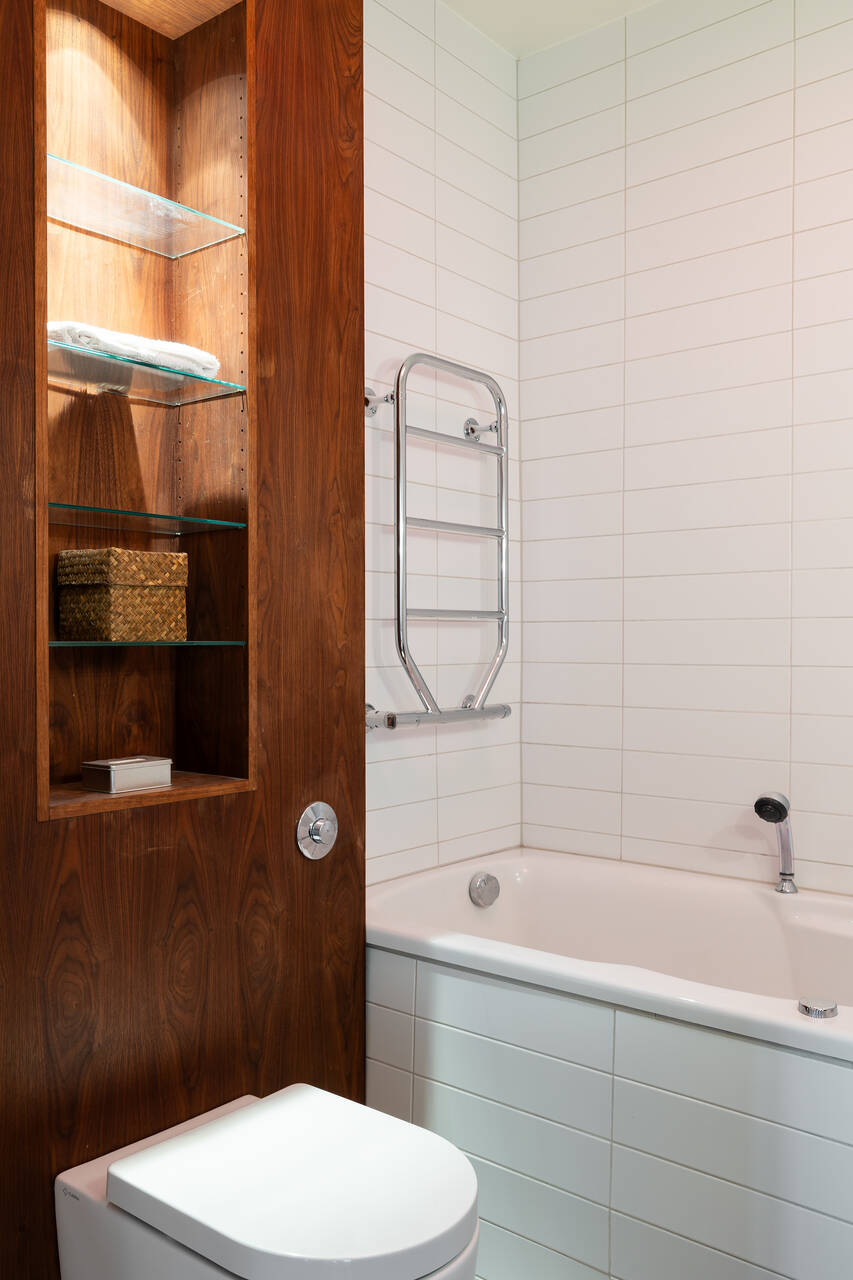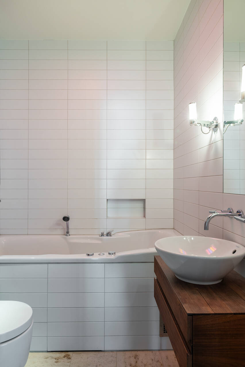 Sovrum med utgång till balkong i söder. Intilliggande badrum med badkar, vägghängd toalett från Duravit och handfat med kommod under och spegel ovan.