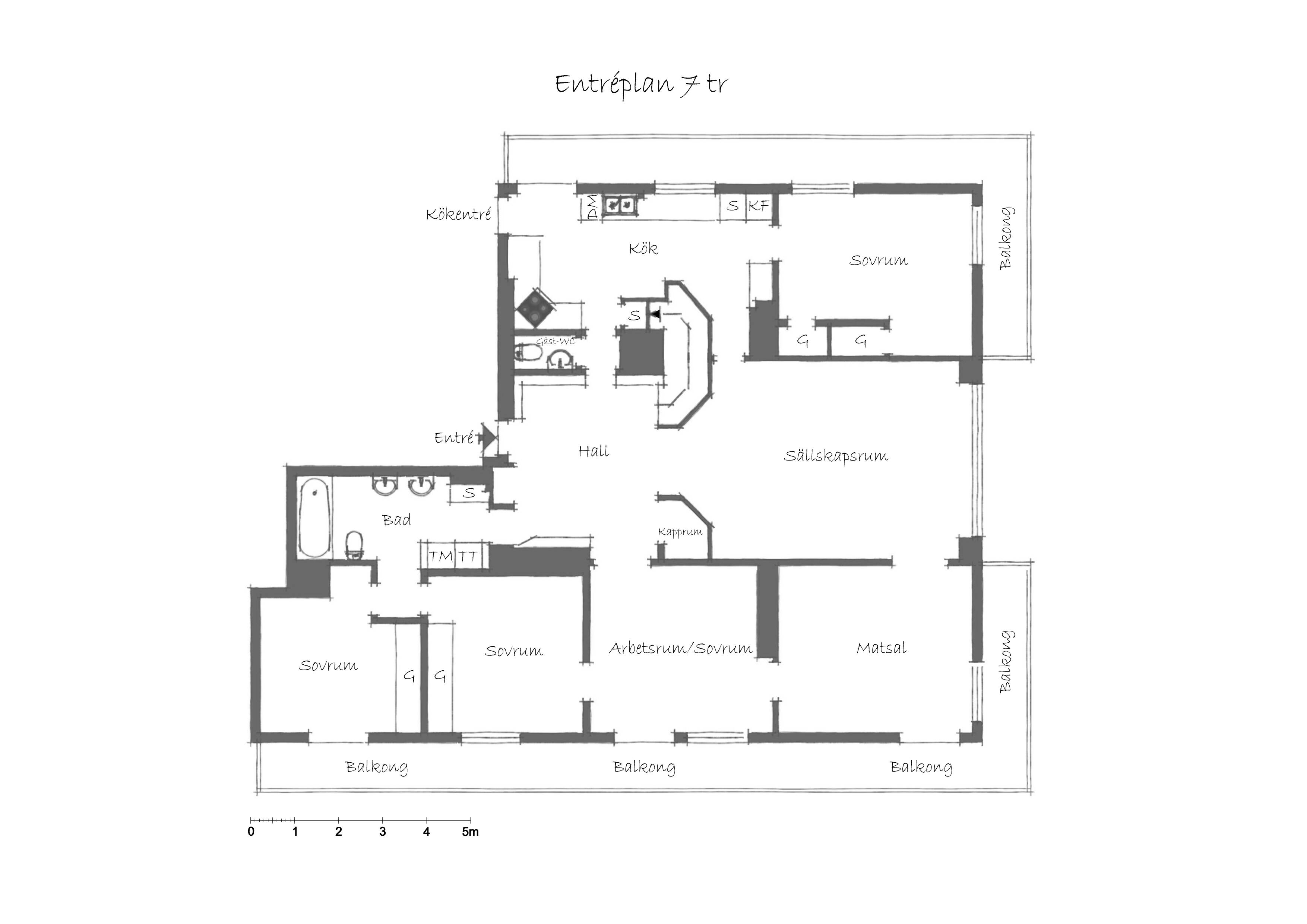 Balkonger: 7 tr. vänster ca 22 kvm och balkong höger ca 16 kvm, enligt ritning.
