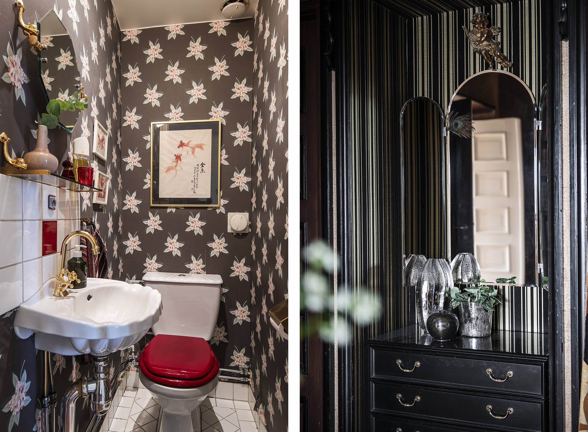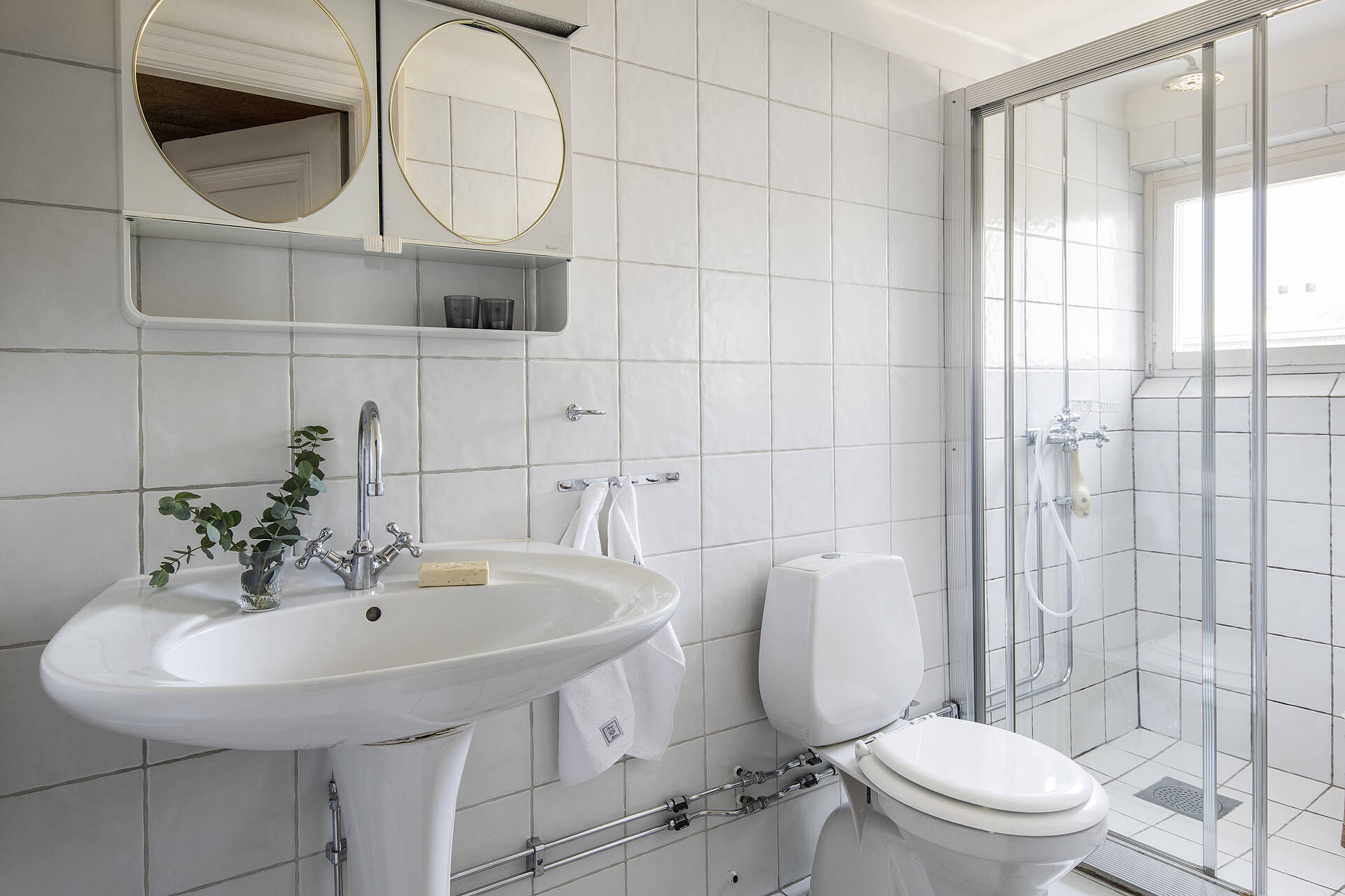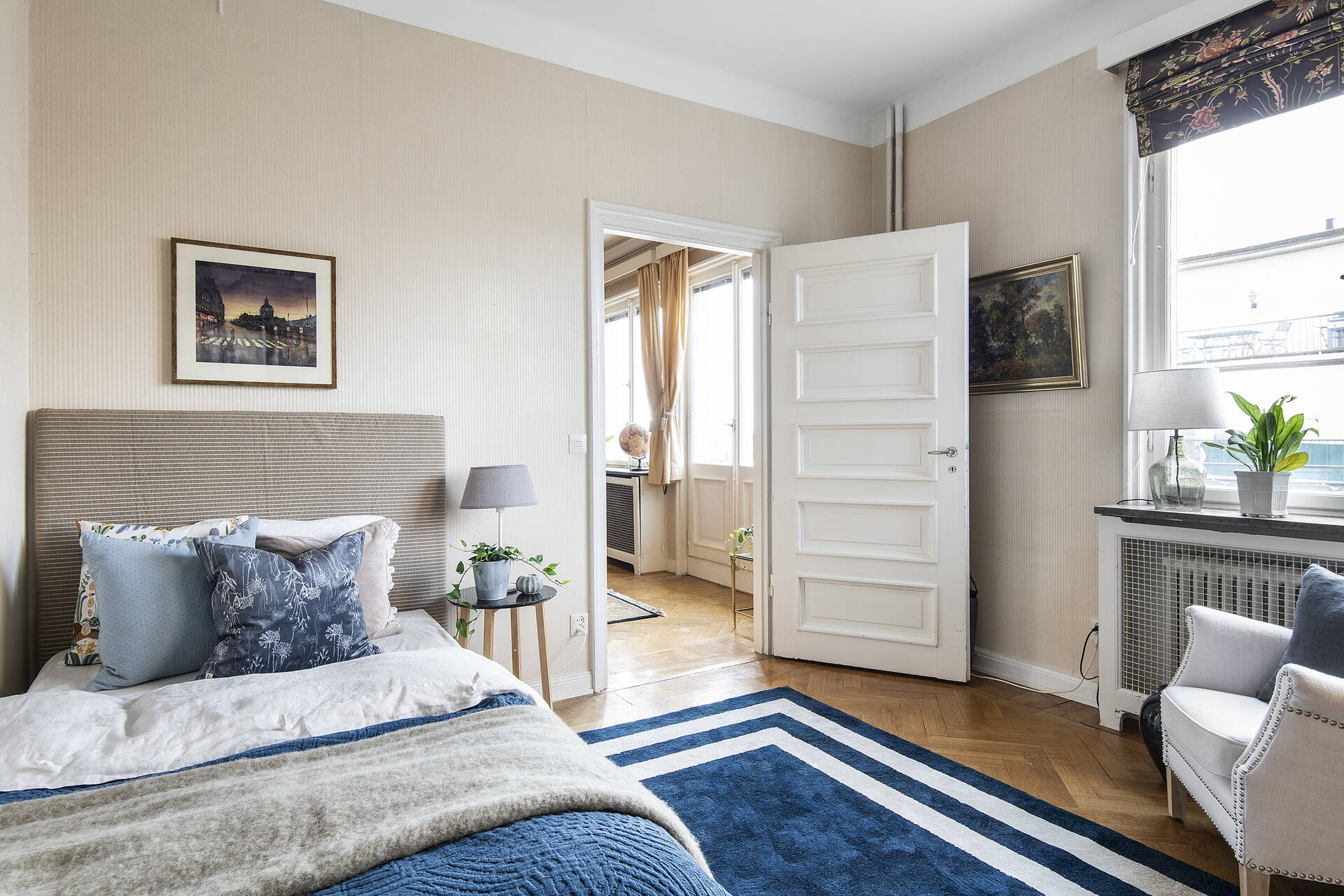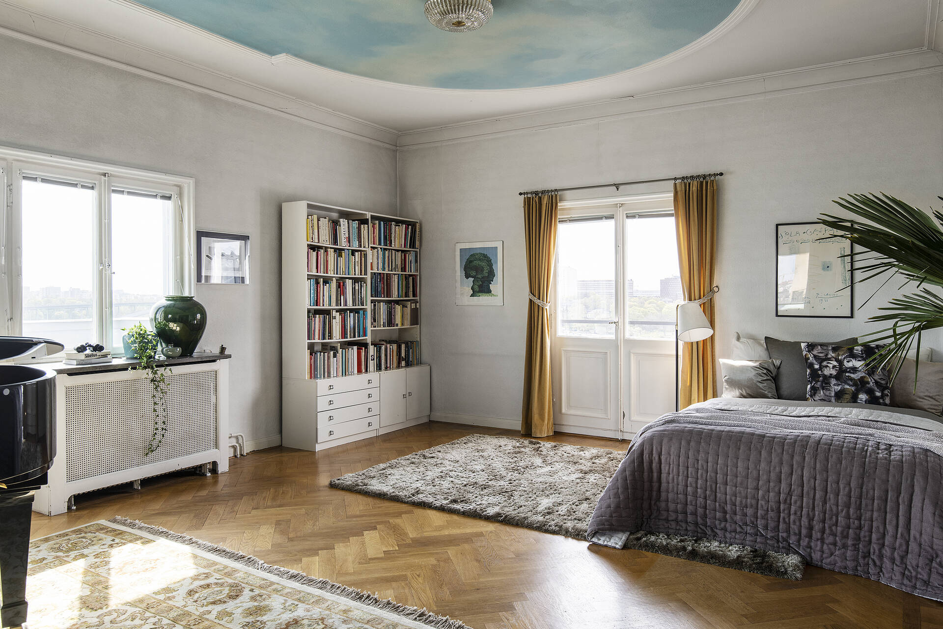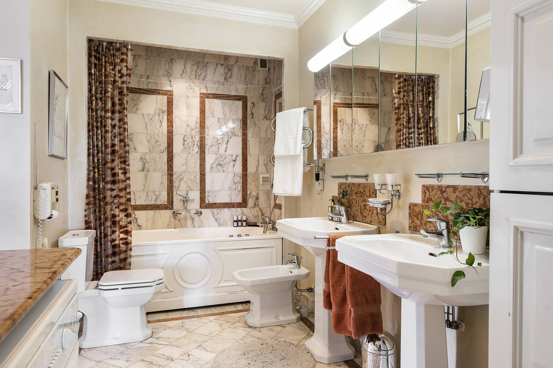 utgång till den västra kungsbalkongen mot Västerbron. Det angränsande arbetsrummet nås även från hallen via pardörrar. Två sovrum med hel garderobsvägg och badrum ensuite. Två av rummen har dörrar ut till kungsbalkongen. Badrummet har badkar Adazzo, dubbla handfat, toalett, bidé och marmorgolv med värme, tvättmaskin och torktumlare från Miele samt plats för tork och förvaring.