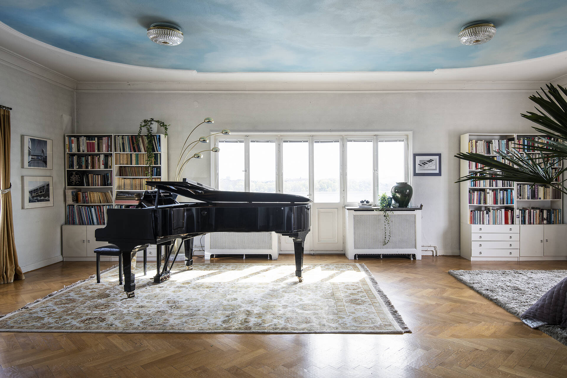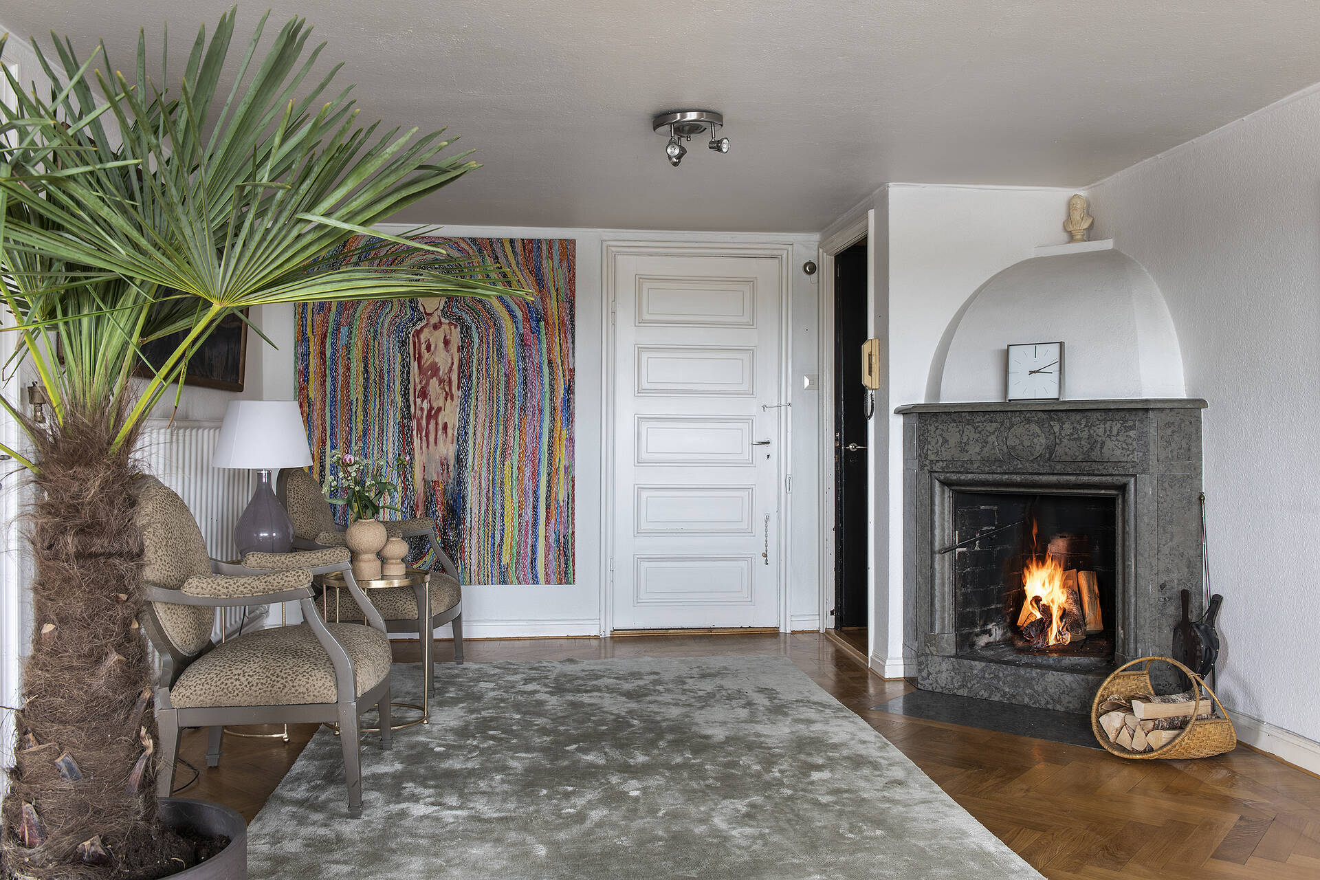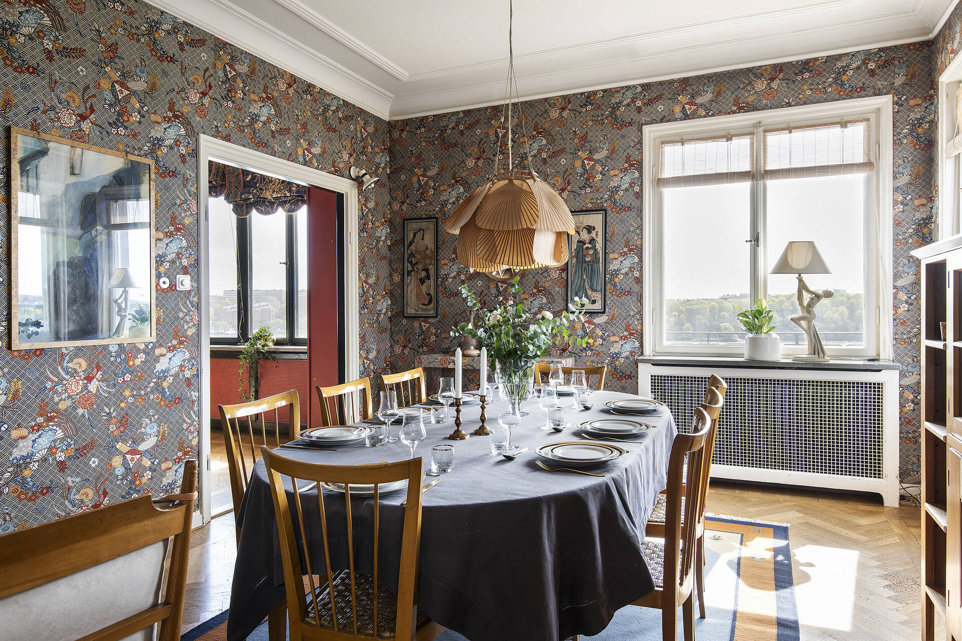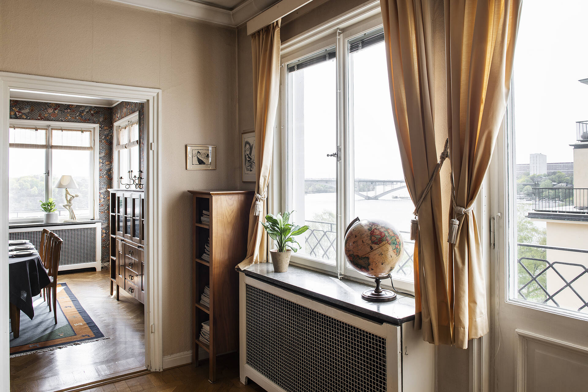 Huvudentré på 7 tr: Möblerbar hall med kalkstensgolv, bokhyllor och kapprum. Gästtoalett. Pardörrar leder in till det stora ljusa vardagsrummet med alla fönster mot Riddarfjärdens vatten. I fil ligger matsalen med tygklädda väggar och