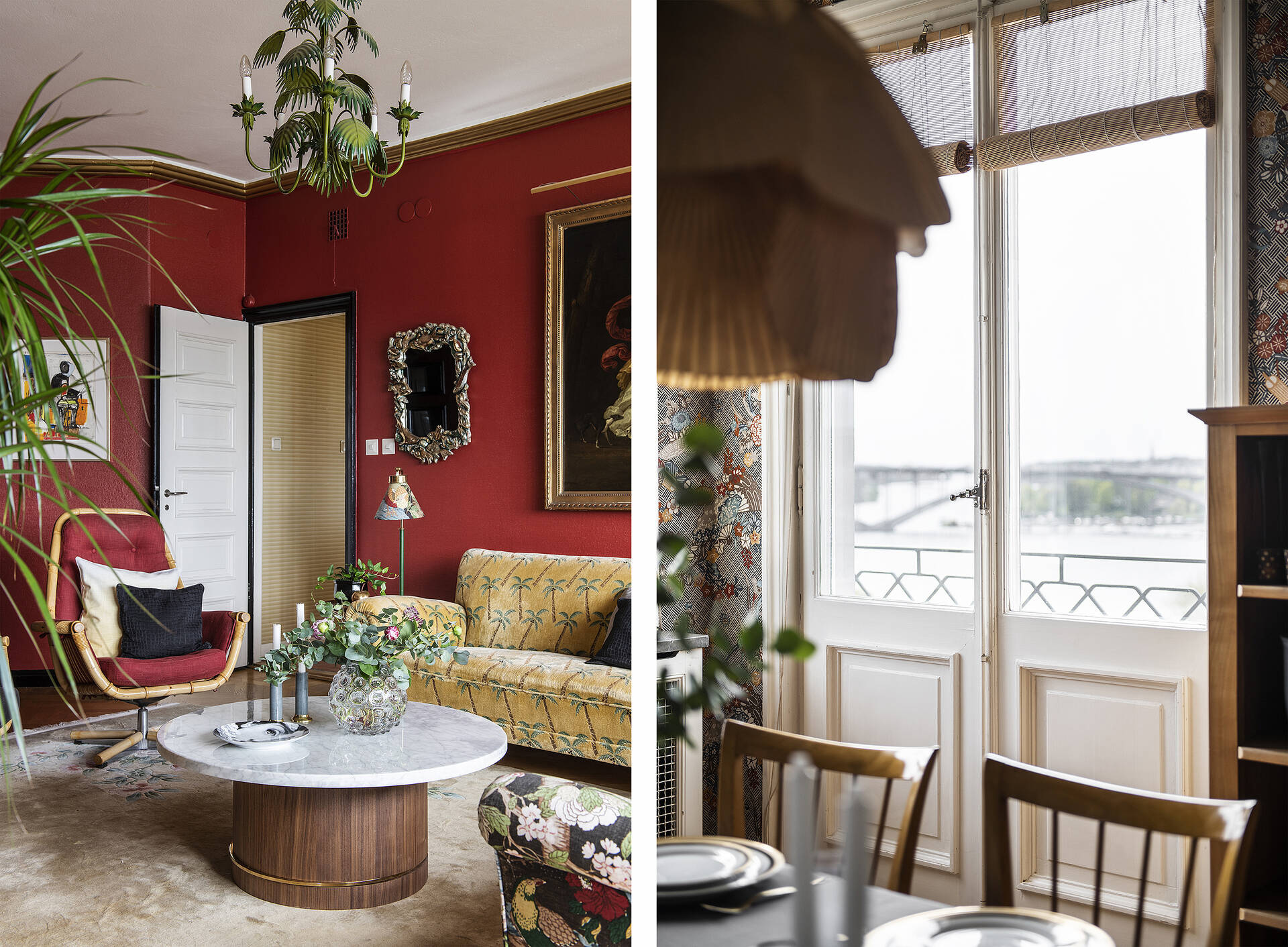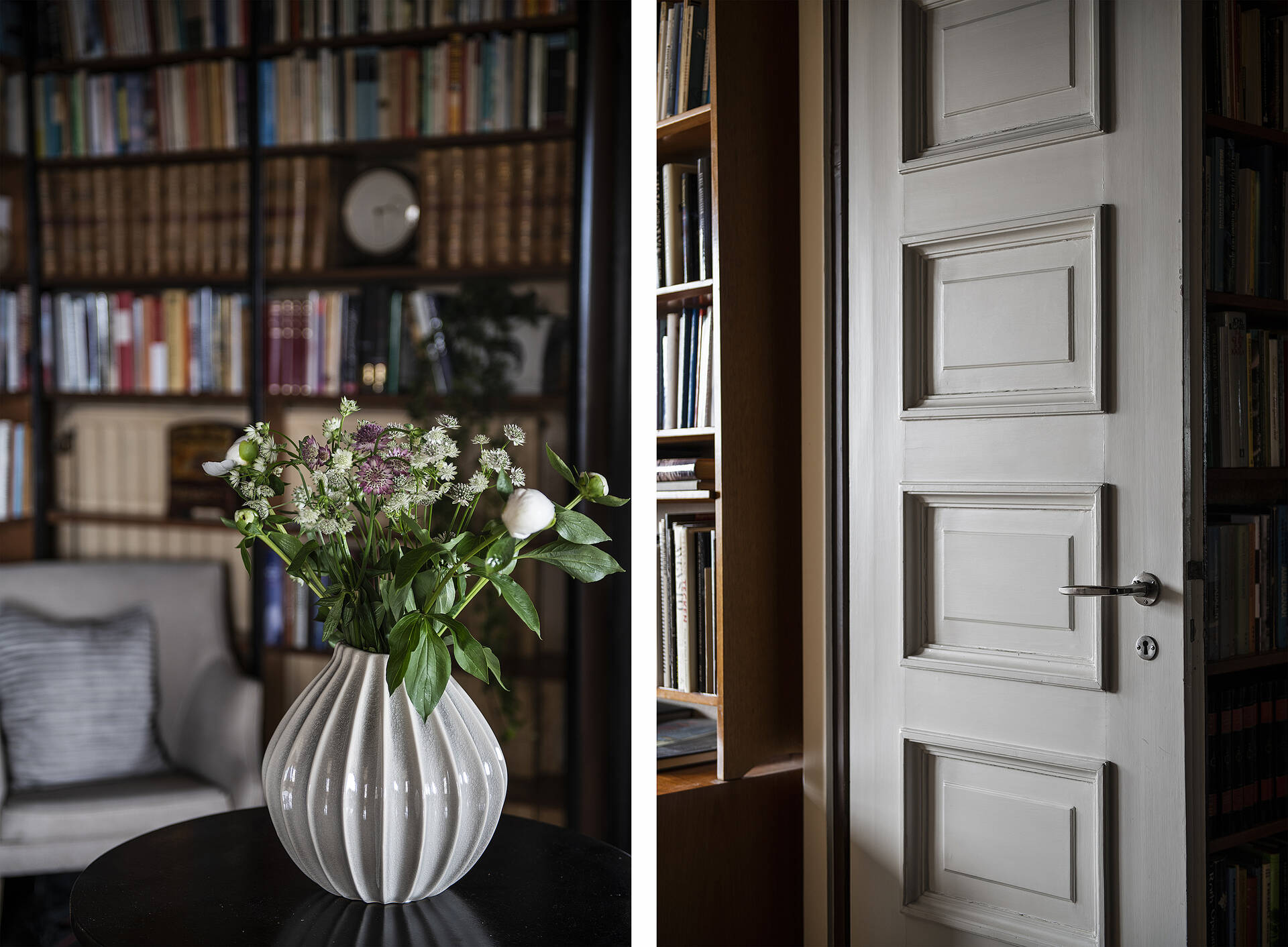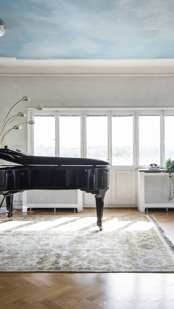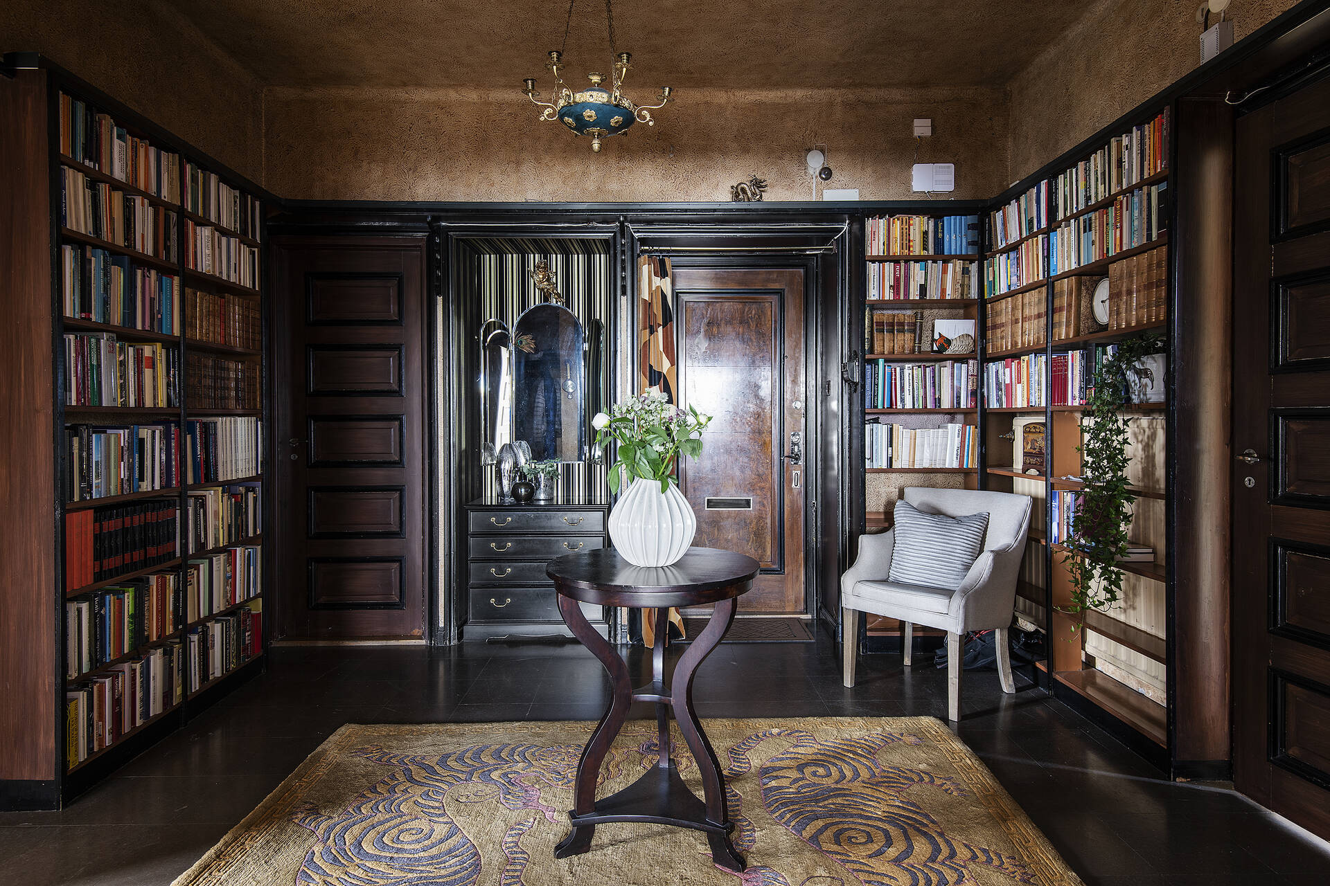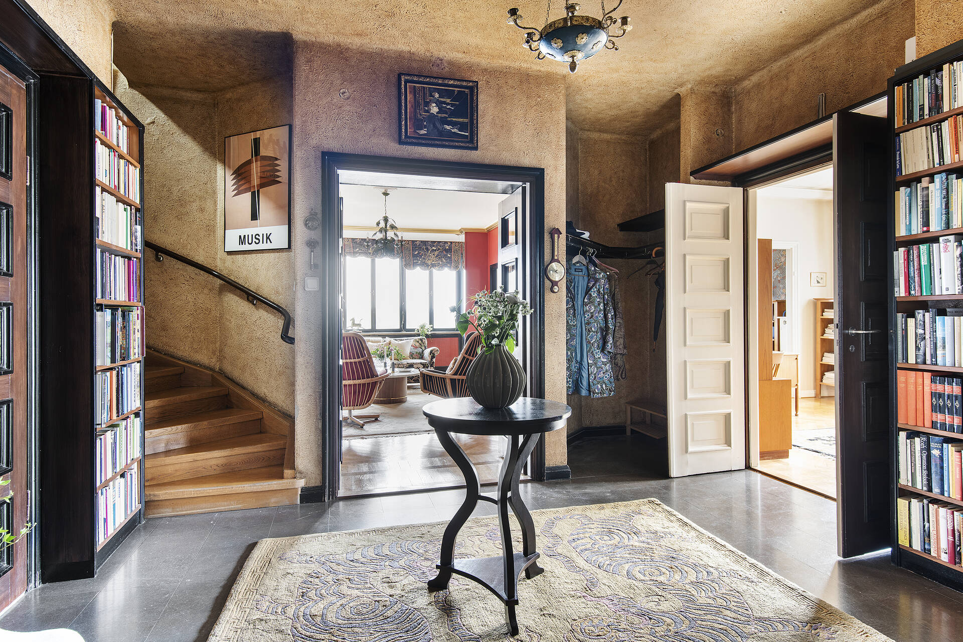 Huvudentré på 7 tr: Möblerbar hall med kalkstensgolv, bokhyllor och kapprum. Gästtoalett. Pardörrar leder in till det stora ljusa vardagsrummet med alla fönster mot Riddarfjärdens vatten. I fil ligger matsalen med tygklädda väggar och