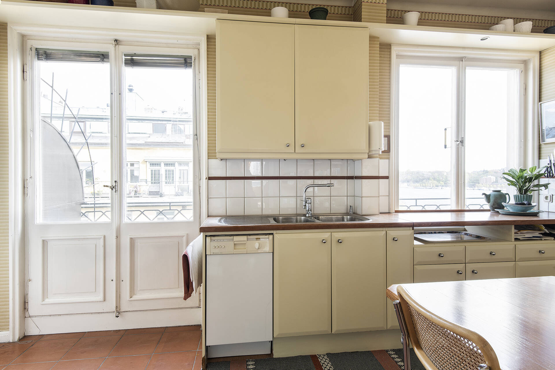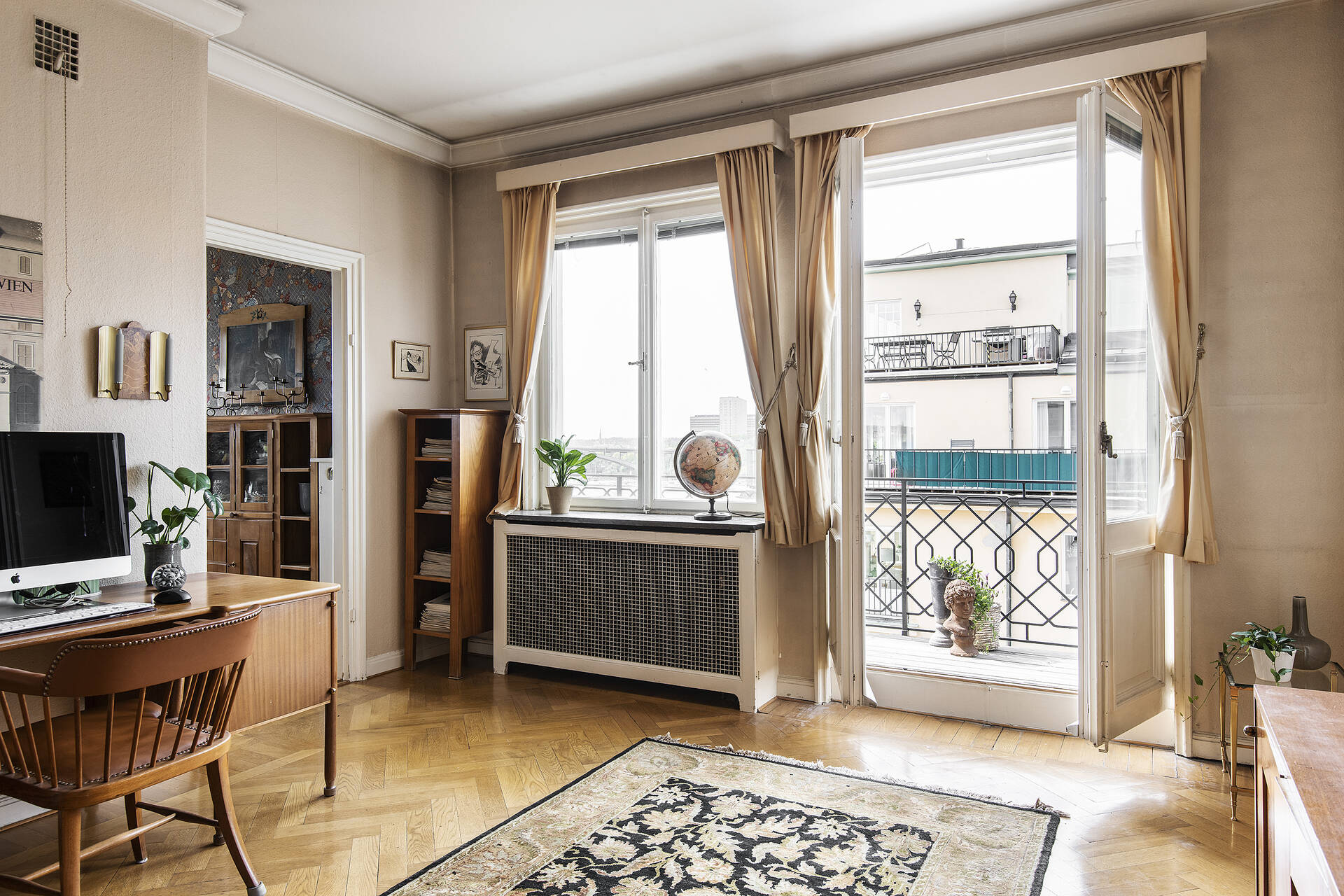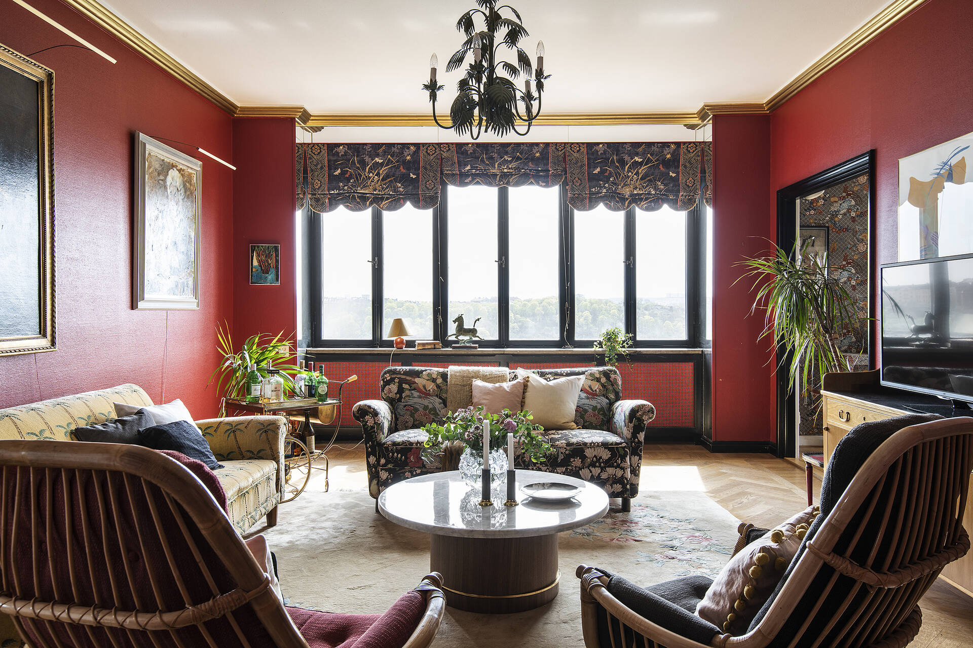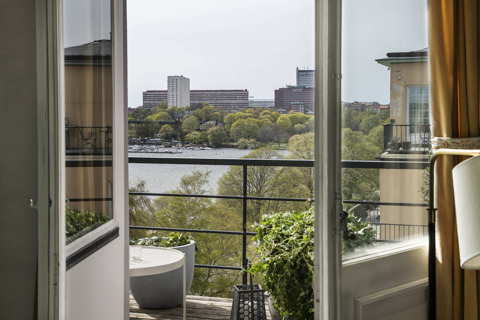 Högst upp i huset finns detta unika penthouse med magnifik och vid utsikt över såväl Riddarfjärden, Marieberg som Mariaberget och Söders höjder. Våningen består av två plan med fyra sovrum och stora sällskapsutrymmen. Dessutom två kungsbalkonger i tre väderstreck på entréplan och tre terrasser på övre plan. Fiskbensmönstrad ekparkett, stor öppen spis med kalkstensomfattning och flera andra vackra detaljer finns bevarade i denna fantastiska bostad. Stabil och lågt belånad bostadsrättsförening i välhållen och vacker fastighet byggd 1931, ritad av arkitekt TE Lindberg. Våningen har visst upprustningsbehov.