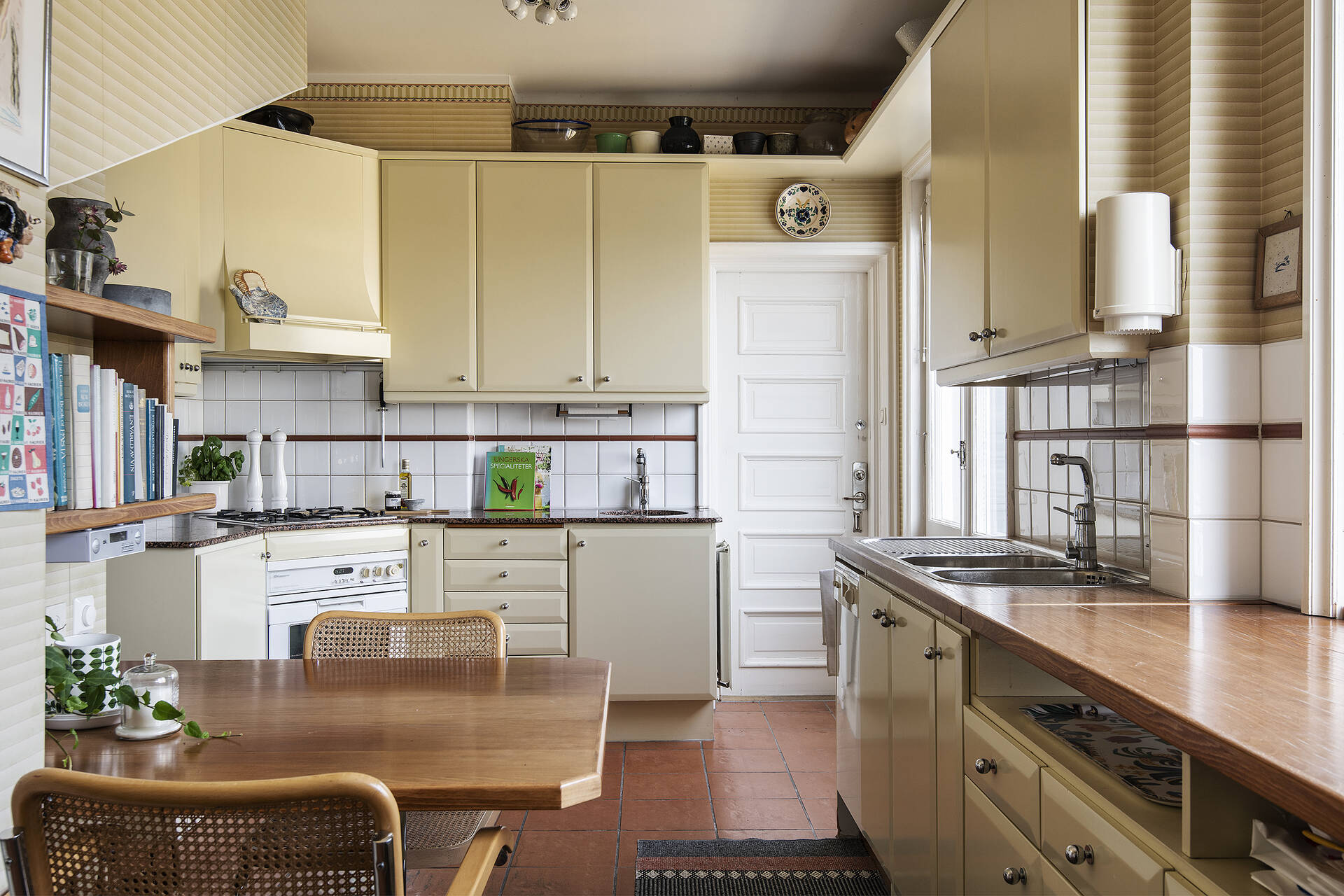 Det trevliga köket har liten matplats, klinkergolv, platsbyggd inredning med förvaring även i golvsocklarna, elugn och gasspis från Husqvarna, kyl/frys och diskmaskin. Förråd.