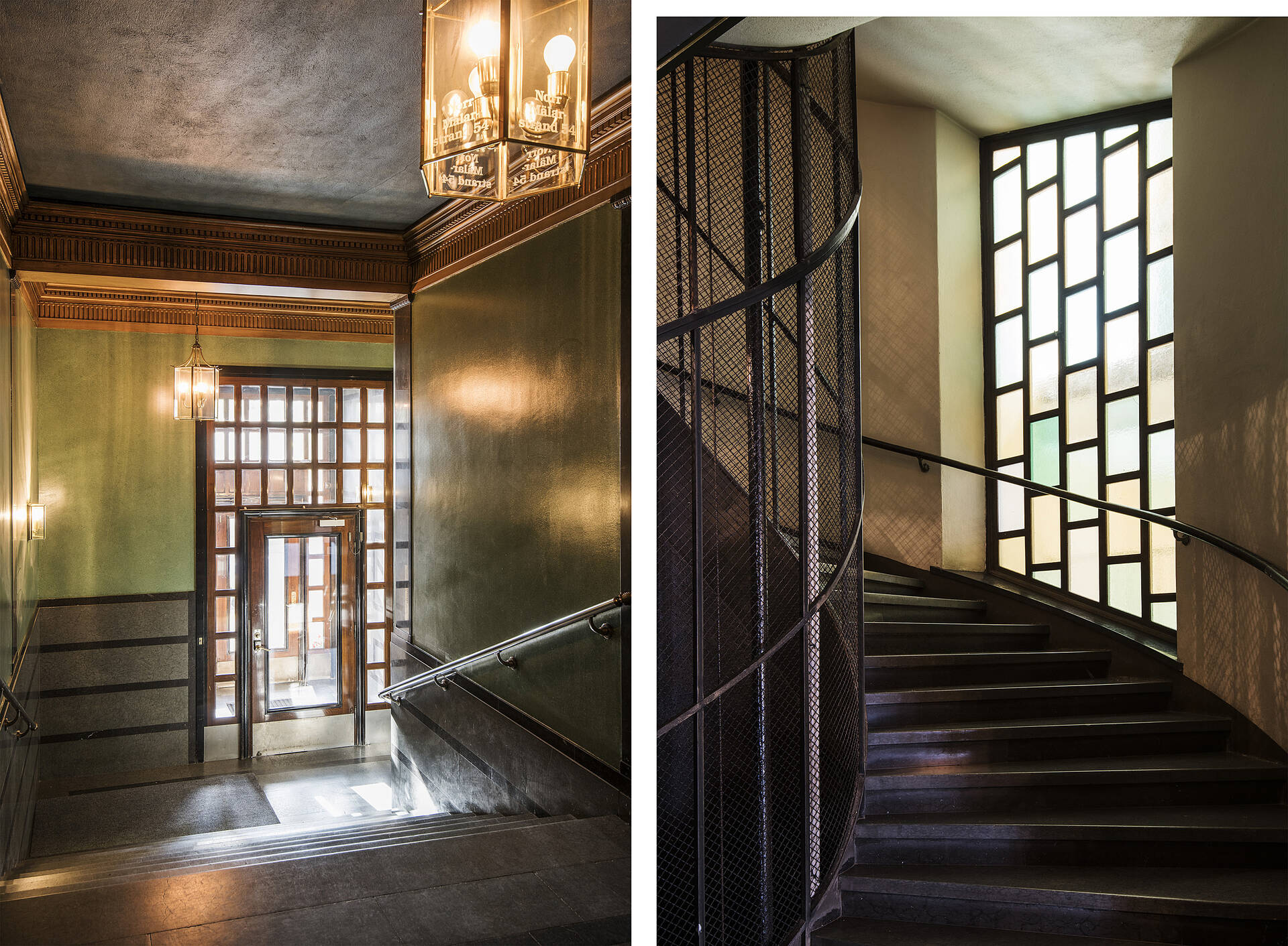 Exteriören är funktionalistisk medan entrén och trapphuset är klassicistiska.