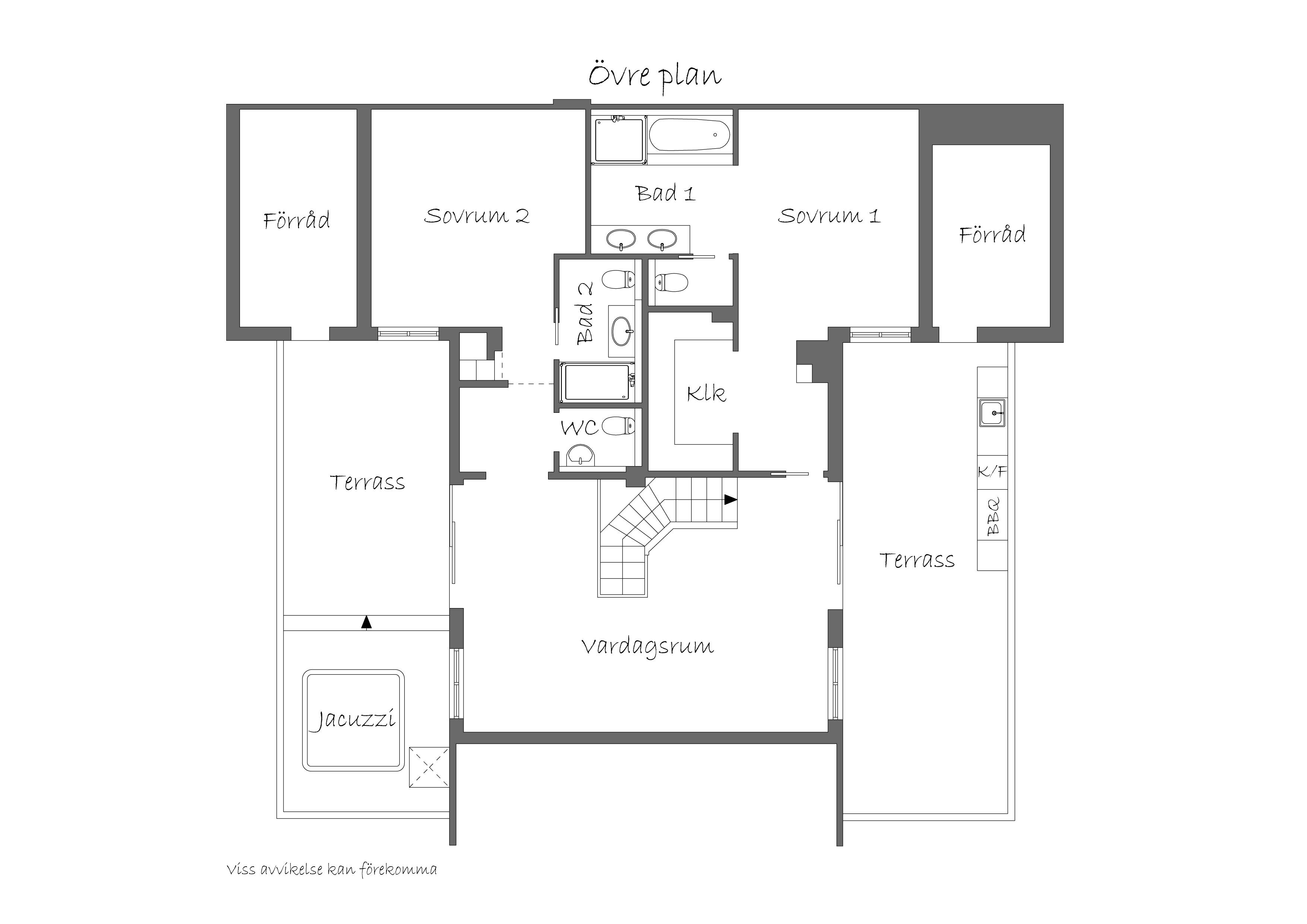 Terrasserna är utformade för att maximera det privata utomhuslivet. Här finns ett utekök med grill samt en privat jacuzzi, strategiskt placerad för att ta tillvara på den storslagna utsikten. Övre terrassen erbjuder en intim loungedel, väl lämpad för avkoppling eller diskret umgänge. Våningens sovrum präglas av hög komfort och sofistikerad design, där master bedroom tillför ytterligare exklusivitet med en walk-in closet och ett påkostat badrum en suite.
