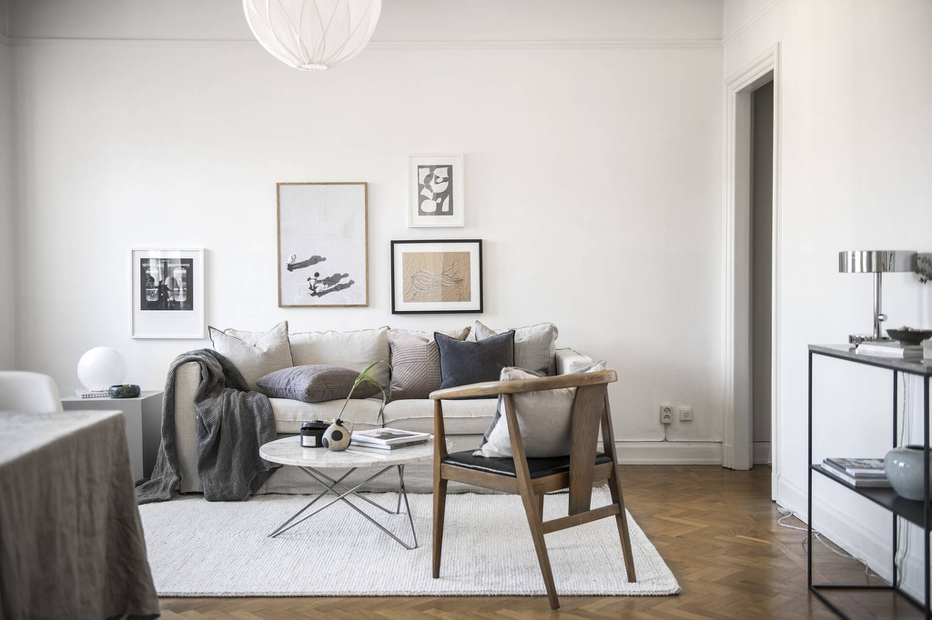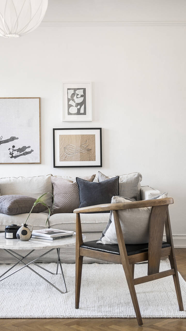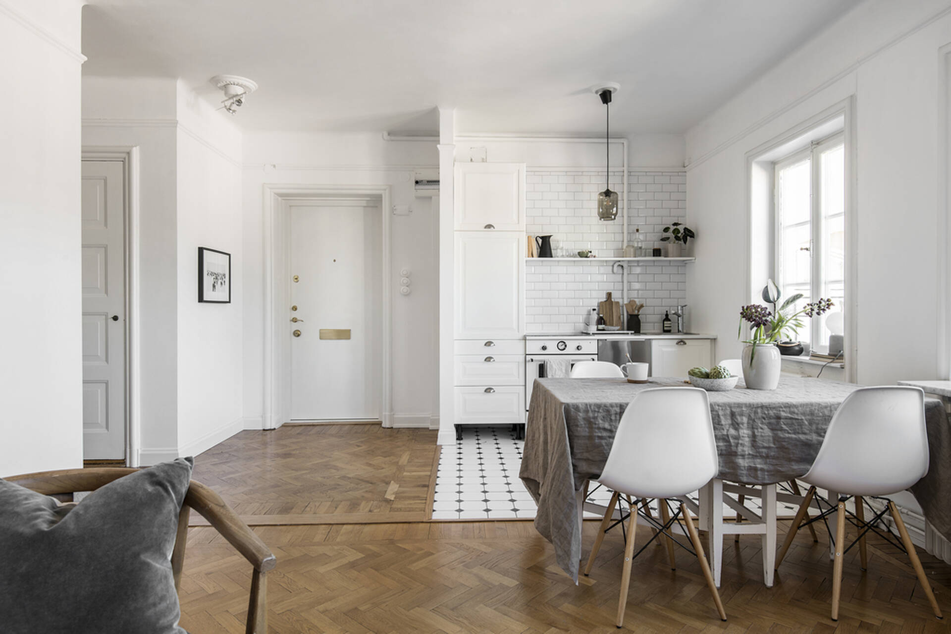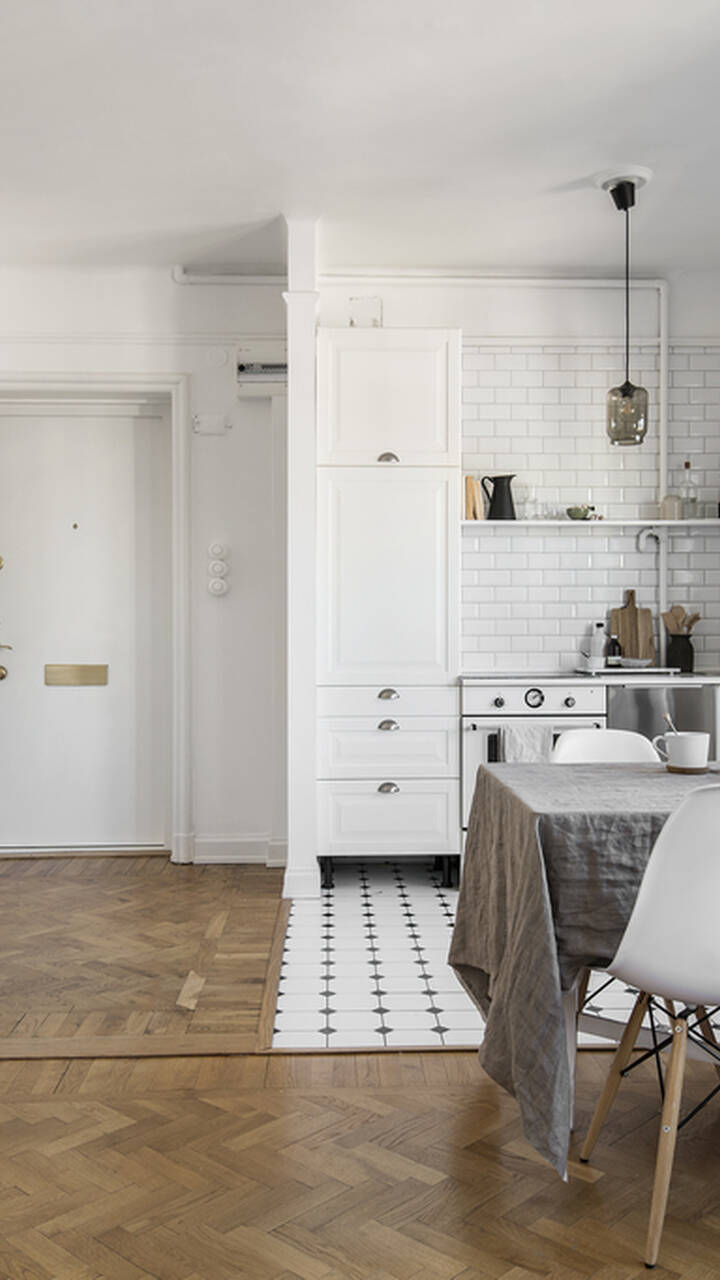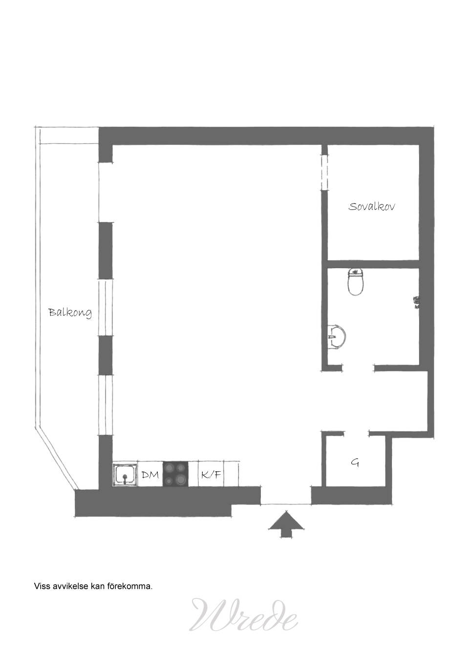 Genomgående ekparkett, vitmålade väggar och fönster med fantastiskt ljusinsläpp. Mindre kök med full maskinell utrustning. Svartvitt kakel på golvet för att markera köksavdelning. Mysig sovalkov med plats för en 160cm säng. Vardagsrummet erbjuder möblering med soffgrupp och matmöbel för sex till åtta personer. Badrummet är kaklat, stambytt och välfungerande.