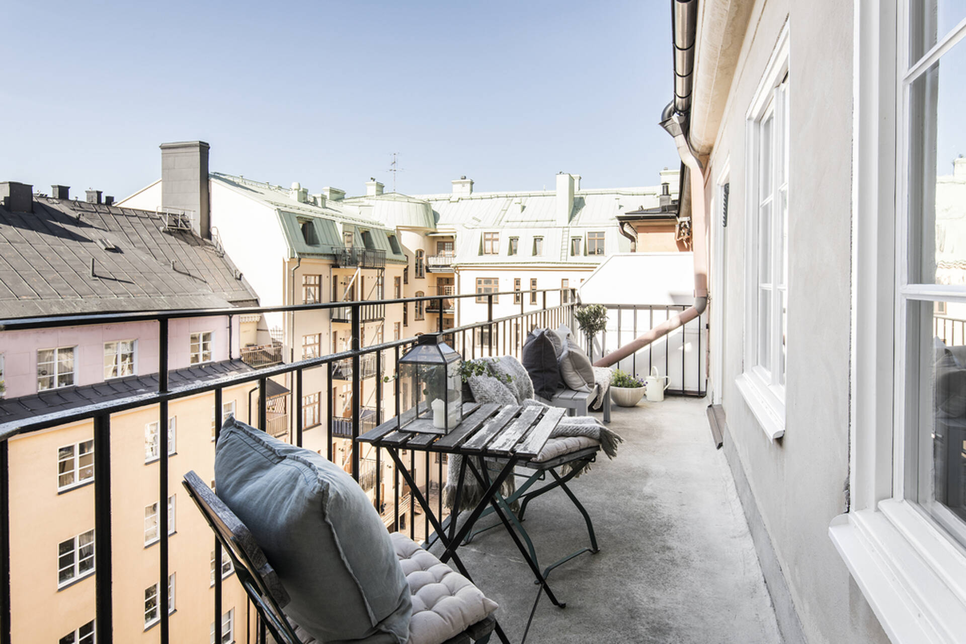 Med ett högt och fritt läge återfinns denna ljusa minitvåamed en sex meter lång balkong som löper utmed ytterväggen mot lugn och fin innergård. Här kan solen avnjutas från förmiddag till kväll.