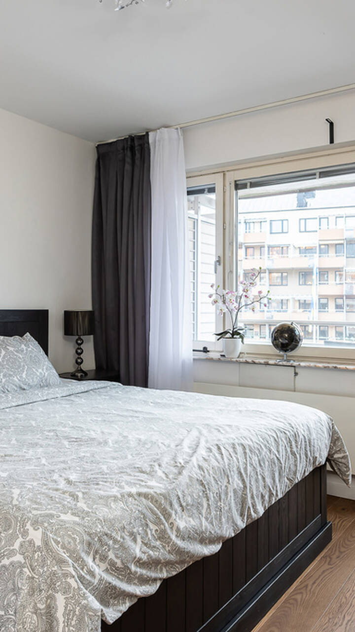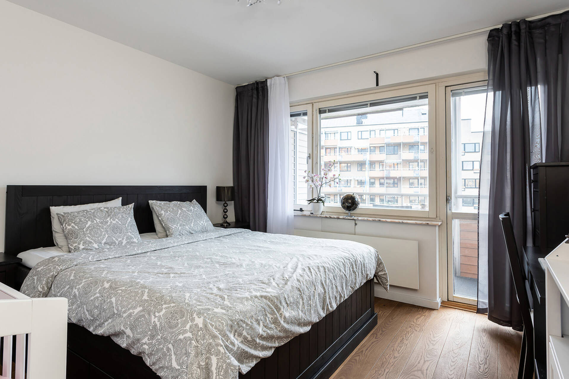 Trivsamt och rymligt sovrum, tyst och lugnt beläget och med fri utsikt över gården. Fönster längs hela yttervägen samt utgång till den stora balkongen i syd/öst.