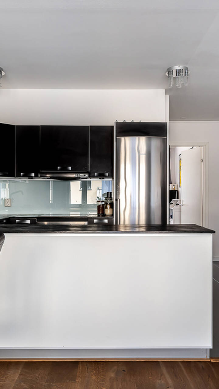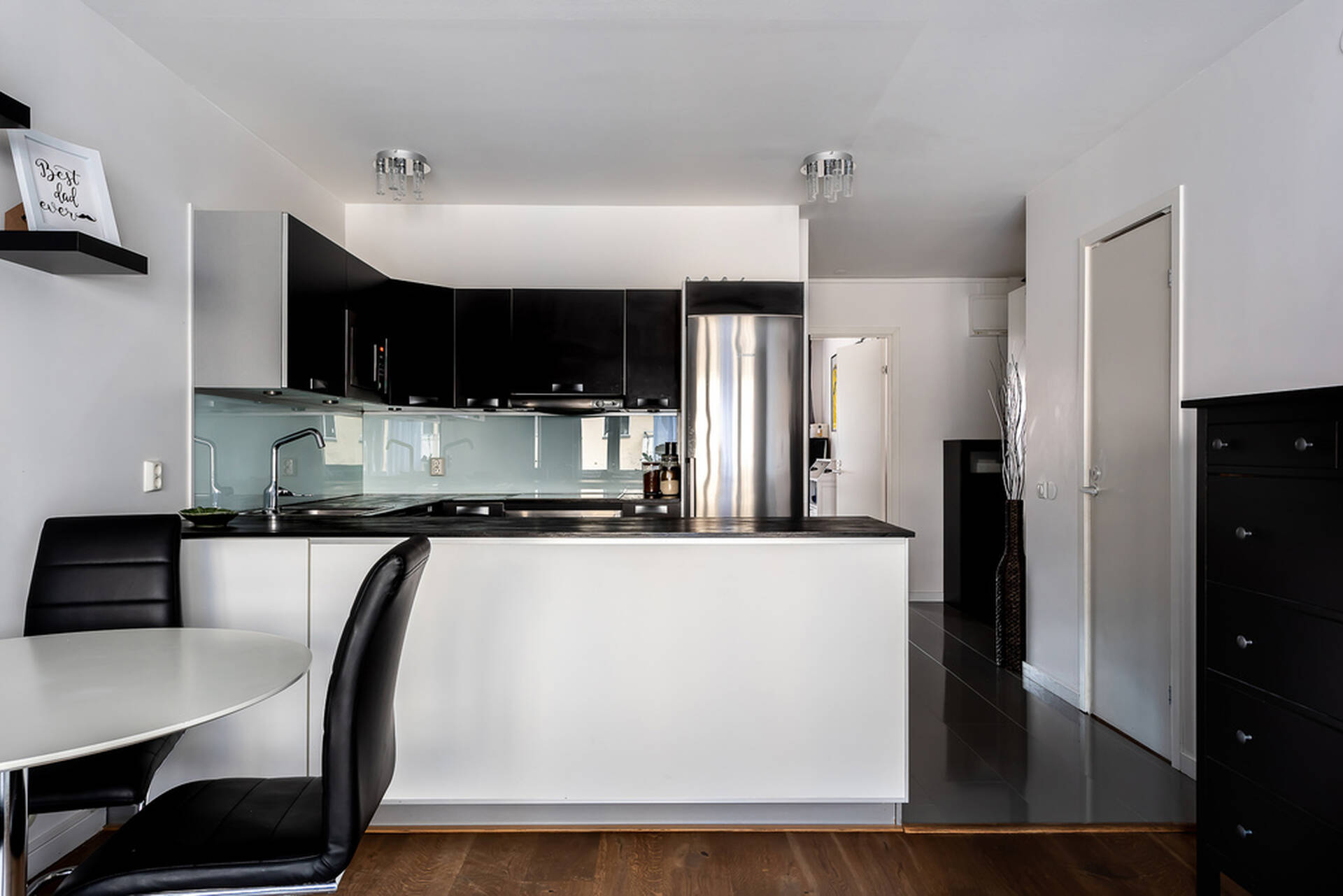 Kök, matplats och sällskapsrum i öppen planlösning med gott om ljusinsläpp genom fönster längs hela ytterväggen mot Värtavägen. Köket har gott om förvaring bakom mörkgrå luckor samt integrerade vitvaror såsom kyl/frys, diskmaskin, spis, ugn och microvågsugn. samtliga från Bosch. Arbetsbänkytor i målat trä samt stänkskydd i glas.