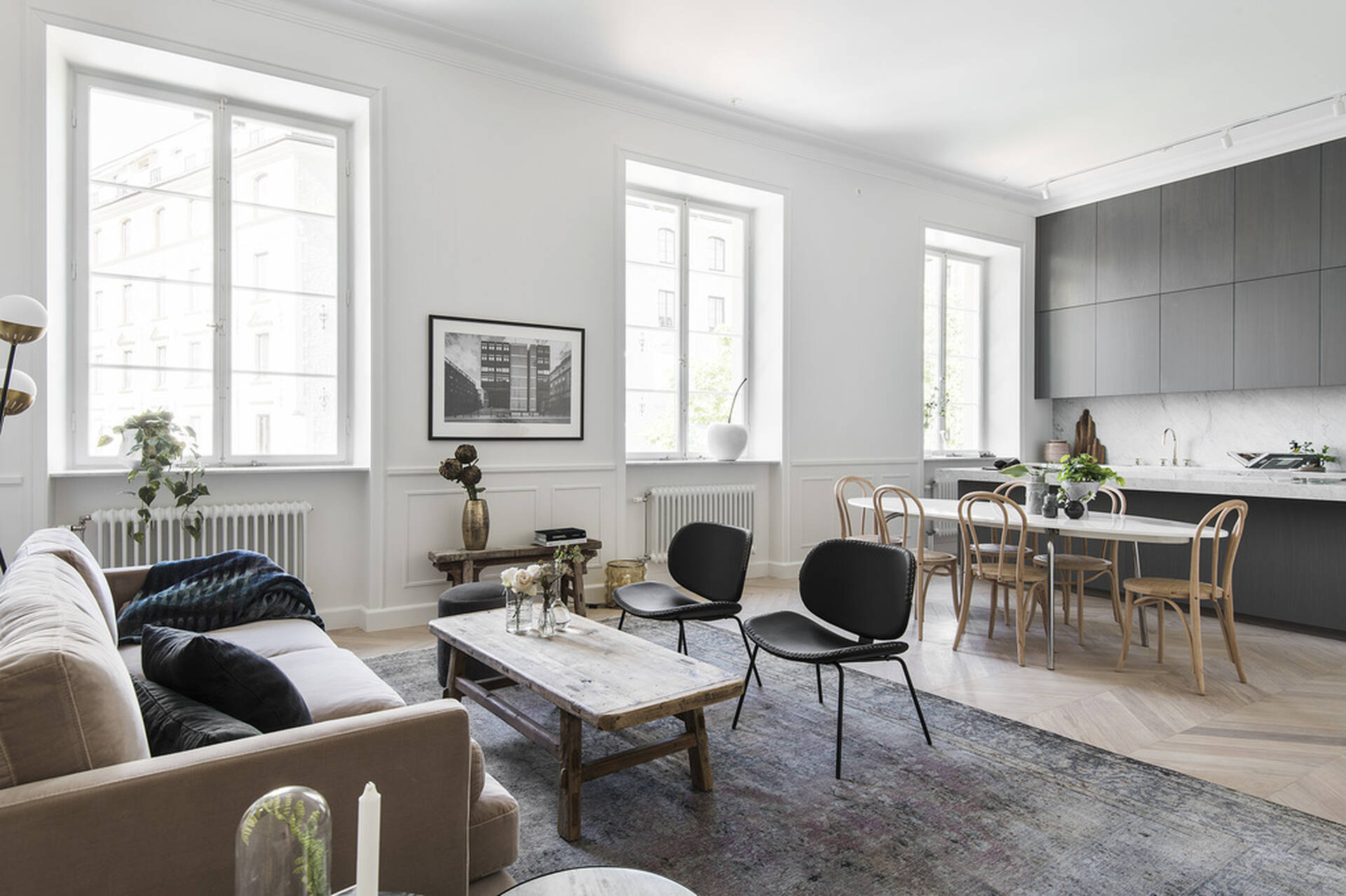 Kök, matplats och sällskapsrum i öppen planlösning, med fantastisk rymd och underbart ljusinsläpp från de tre stora vackra fönstren med fri utsikt längs Kommendörsgatan.