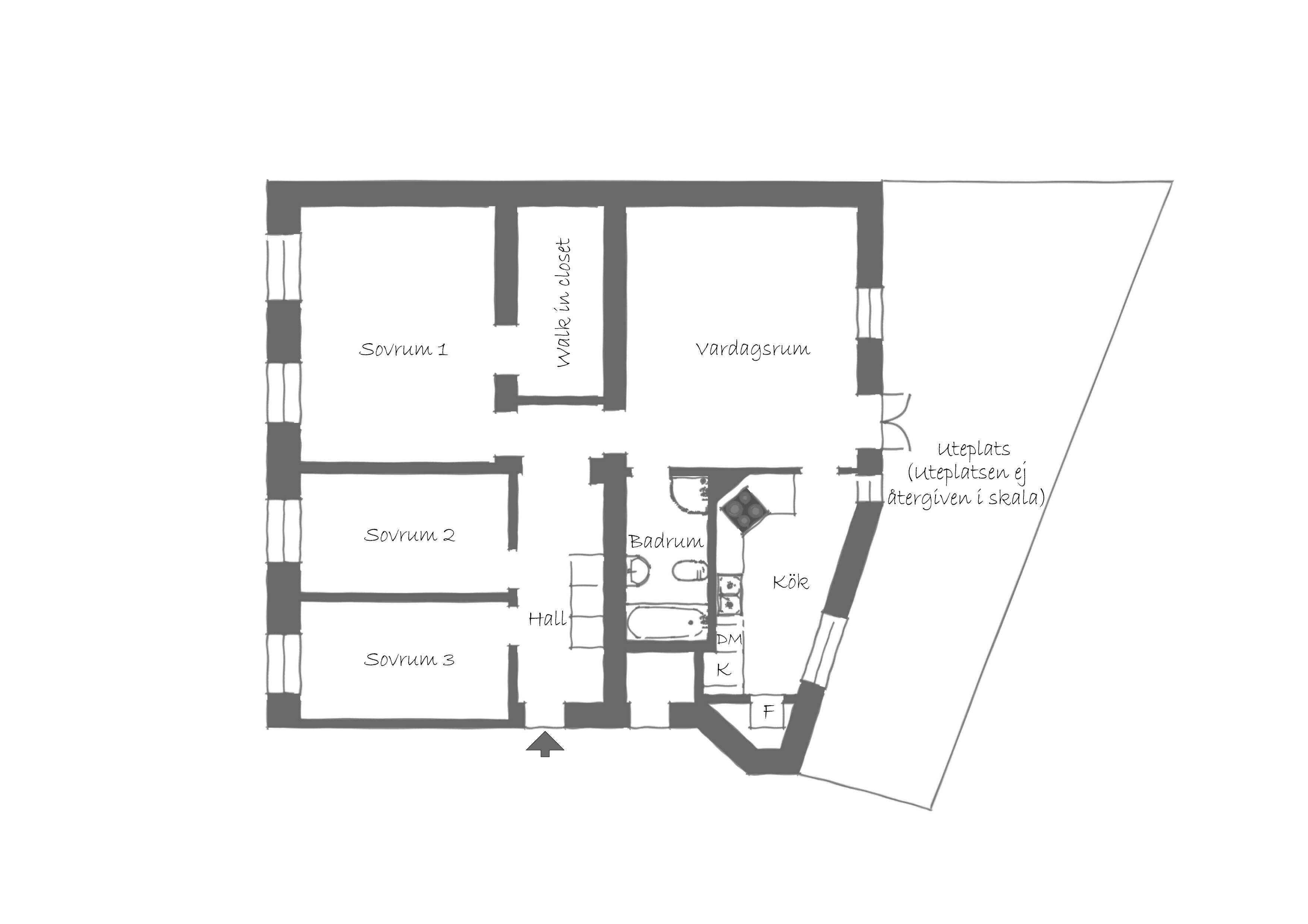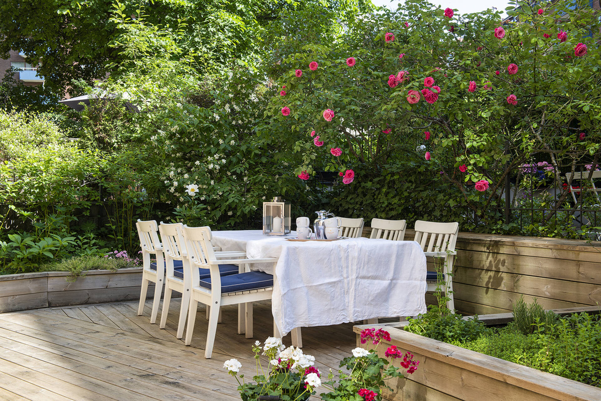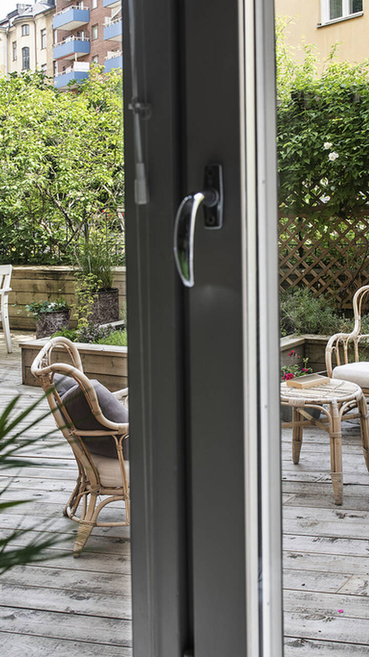 Stort och ljust sällskapsrum med gott om plats för sittgrupp, rymlig matplats samt utgång till den fantastiska egna terrassen om ca 75 kvm. Terrassen har trädäck samt omges av fina, välskötta upphöjda planteringar med bl a etablerade rosenbuskar, syren, clematis och jasmin. I sällskapsrum finns eventuellt möjlighet att installera kakelugn eller öppen spis om en äldre befintlig skorstenskanal kan tas i bruk.
