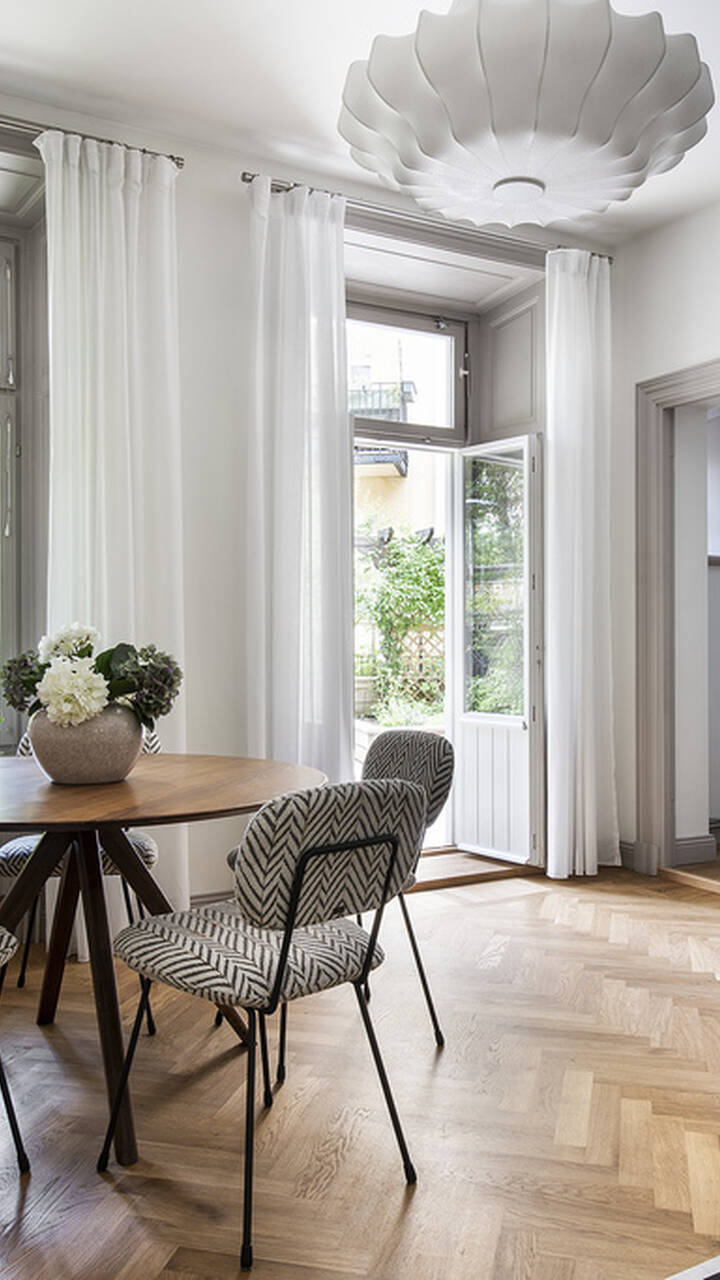 Detta gemytliga hem är genomgående ljust och idealiskt lugnt beläget mellan två innergårdar på en av Östermalms absolut mest eftertraktade adresser.