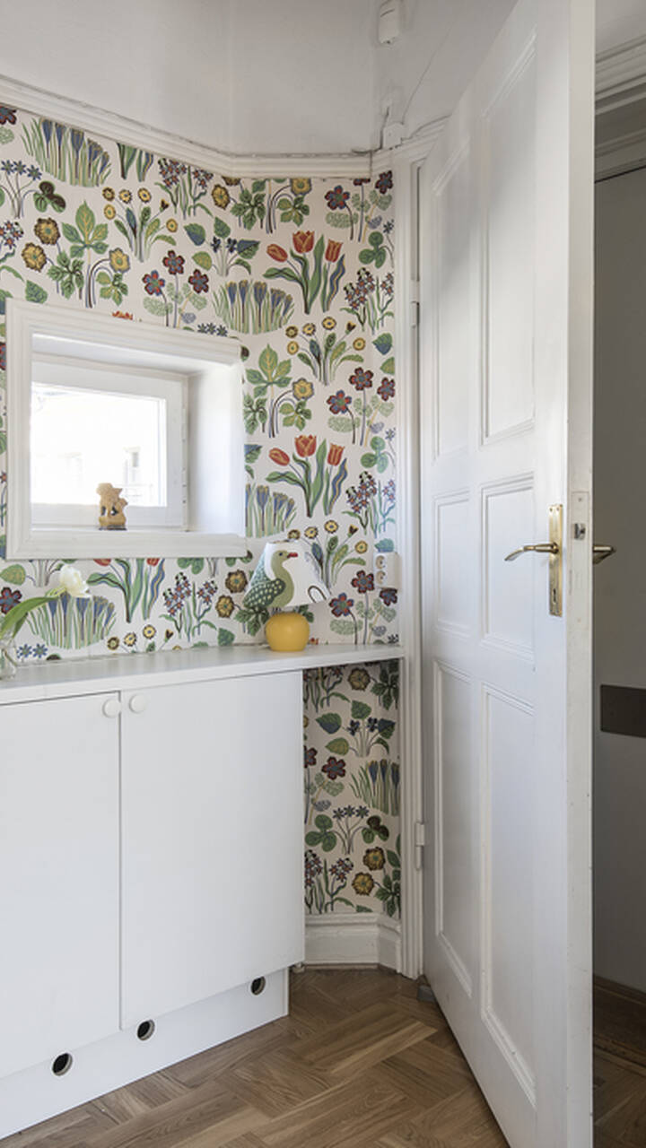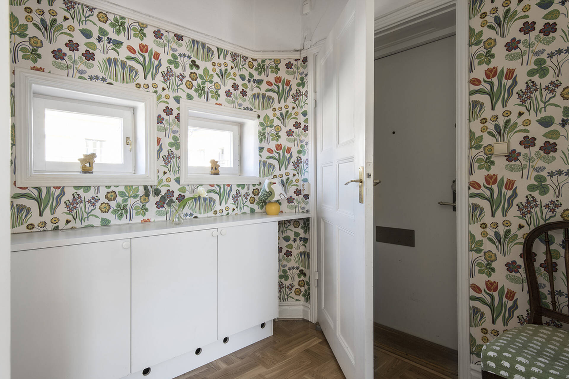 säkerhetsdörr i turkosgrönt. Hall med garderob med spegeldörrar, liten klk, parkettgolv och Franktapet. Två små öppningsbara fönster mot den gård, som vetter mot Grevturegatan och med vy över Edelweisskapellet. Duschrum med kakel. Handdukstork. Tvättmaskin. Handfat. Skjutdörr till toalett. Vardagsrum med parkettgolv. Sovrum med gott om plats för dubbelsäng och garderober.