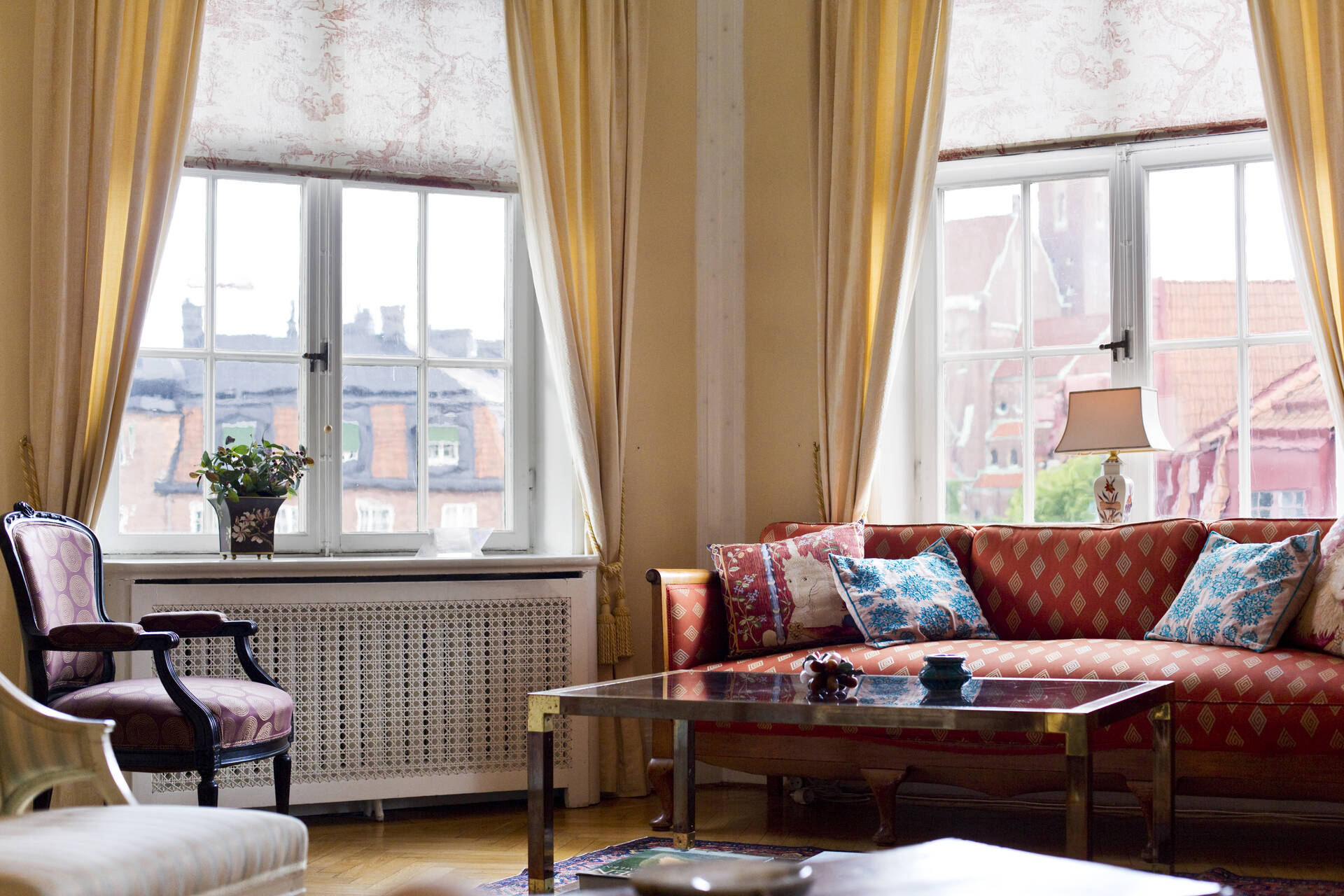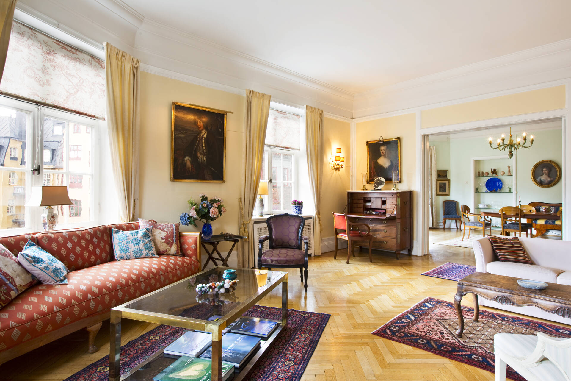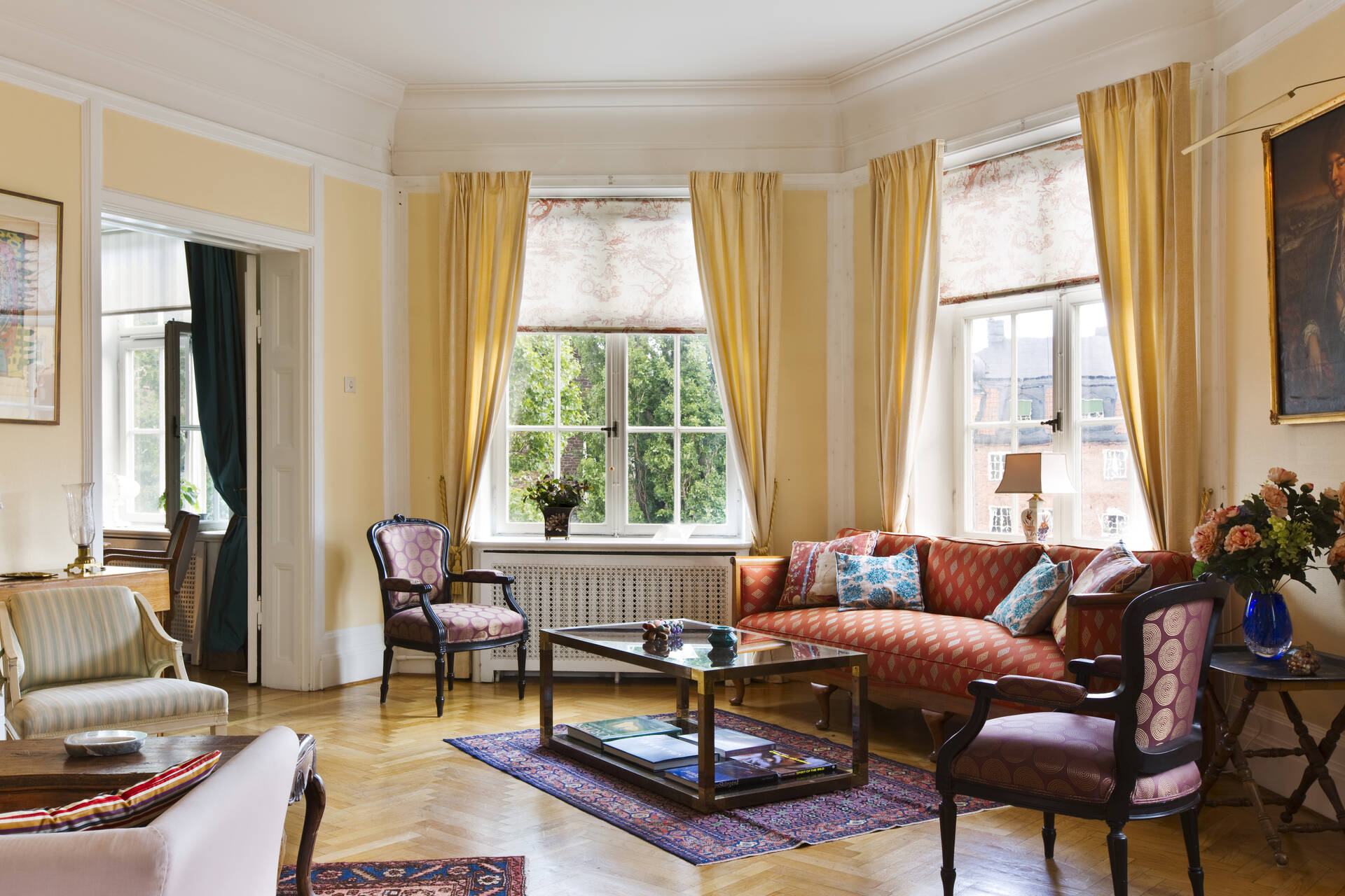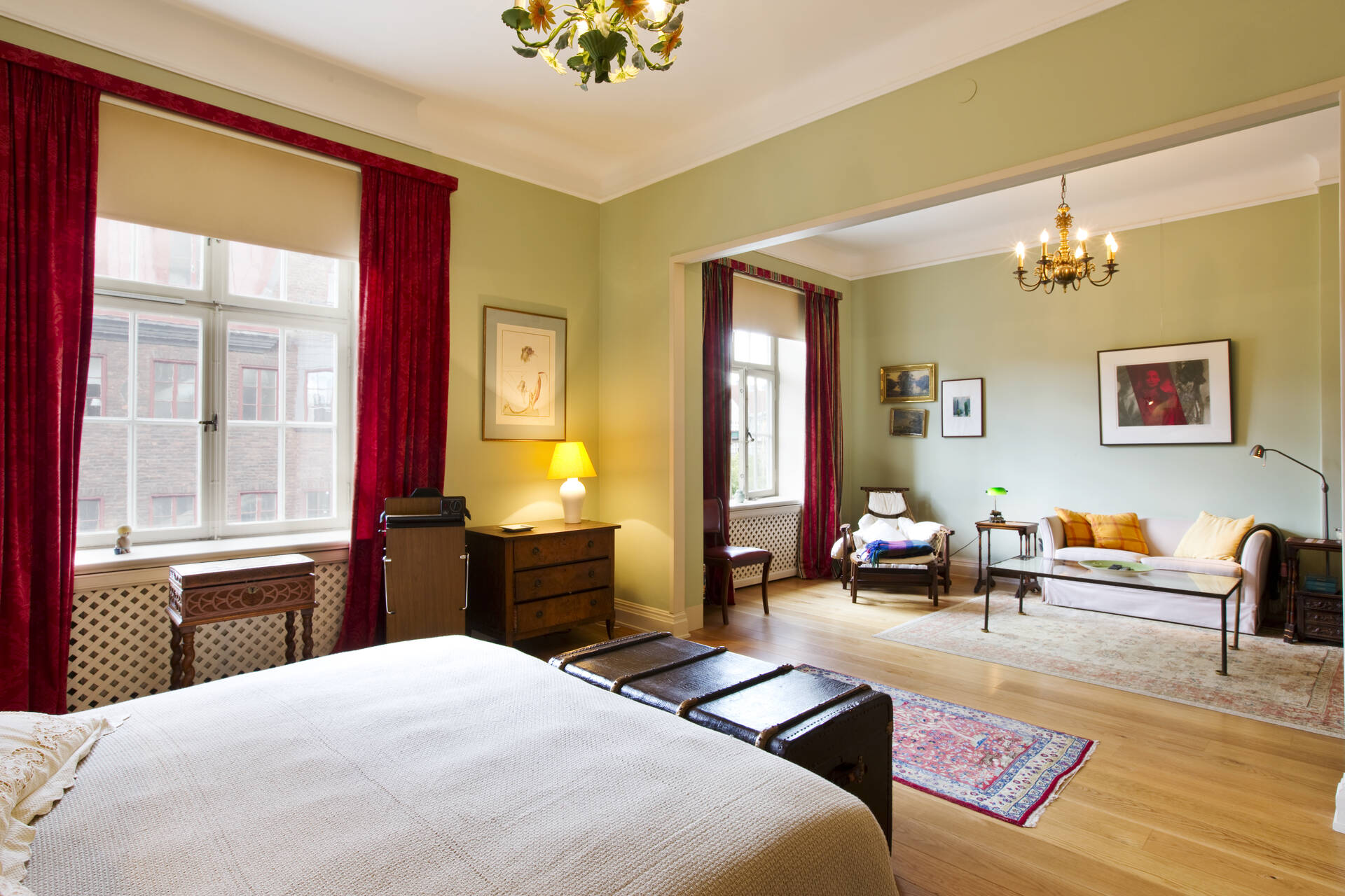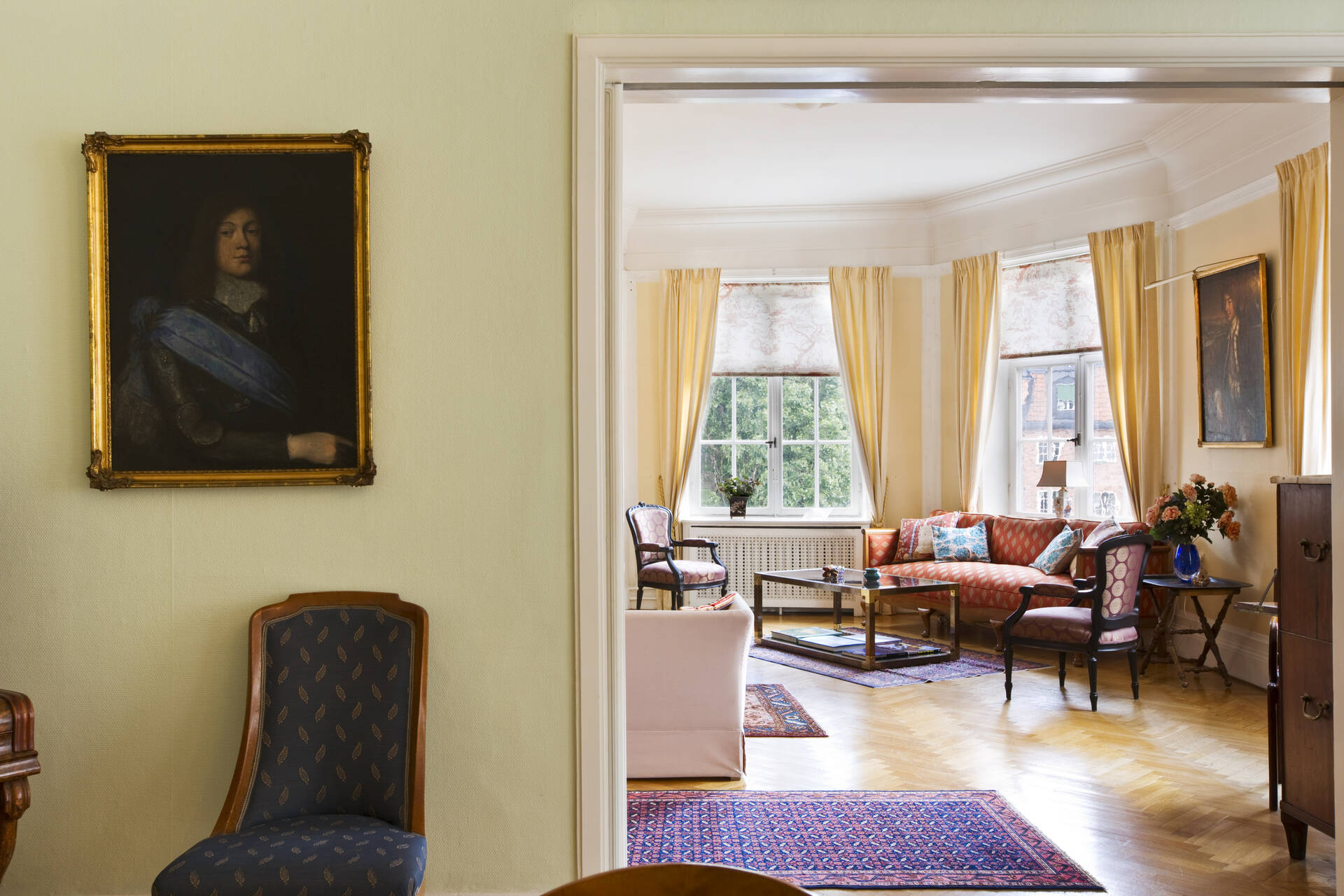 Våningen har en välkomnande hall med gäst-wc, och en liten balkong. Social del i form av bibliotek/arbetsrum, vardagsrum med öppen spis och matsal. Därefter följer serveringsgång som leder till stort kök, egen köksentré med hiss, samt stor balkong mot rofylld innergård. Privat sfär intill med två utmärkta sovrum, varav det ena består av två sammanslagna rum med biblioteksdel och kakelugn. Även klädkammare och två fräscha badrum. Vid behov kan biblioteket omvandlas till sovrum med möjlighet till badrum en suite.
