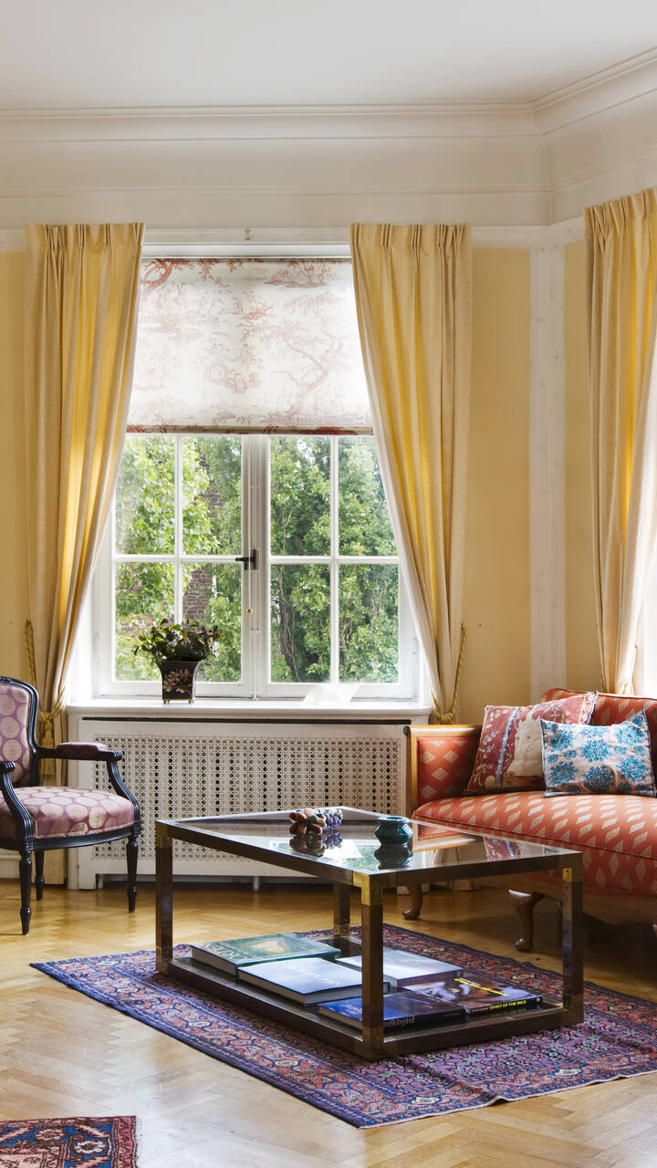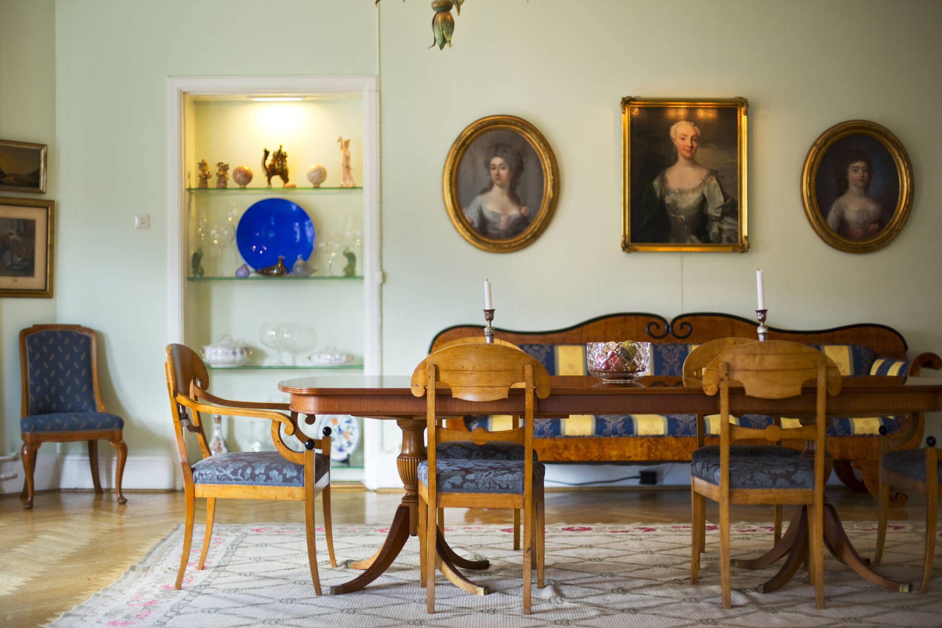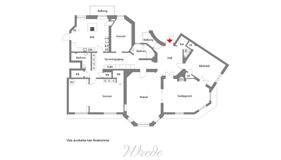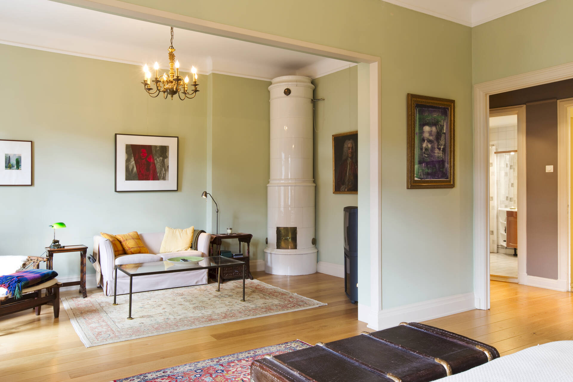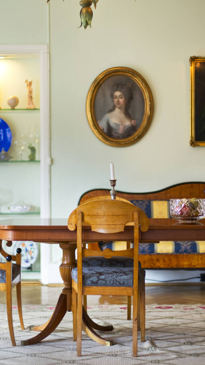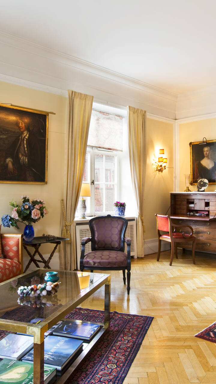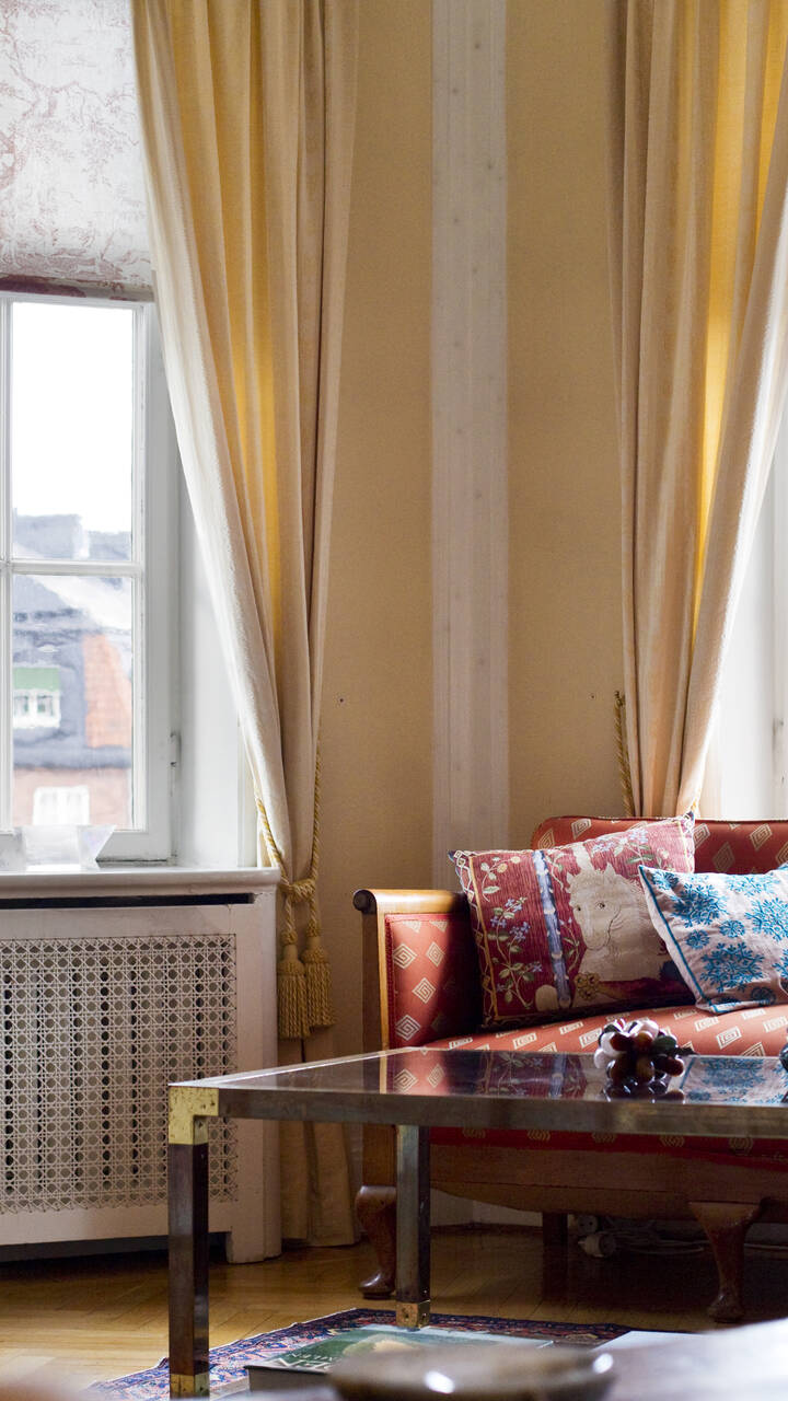 Våningen har en välkomnande hall med gäst-wc, och en liten balkong. Social del i form av bibliotek/arbetsrum, vardagsrum med öppen spis och matsal. Därefter följer serveringsgång som leder till stort kök, egen köksentré med hiss, samt stor balkong mot rofylld innergård. Privat sfär intill med två utmärkta sovrum, varav det ena består av två sammanslagna rum med biblioteksdel och kakelugn. Även klädkammare och två fräscha badrum. Vid behov kan biblioteket omvandlas till sovrum med möjlighet till badrum en suite.