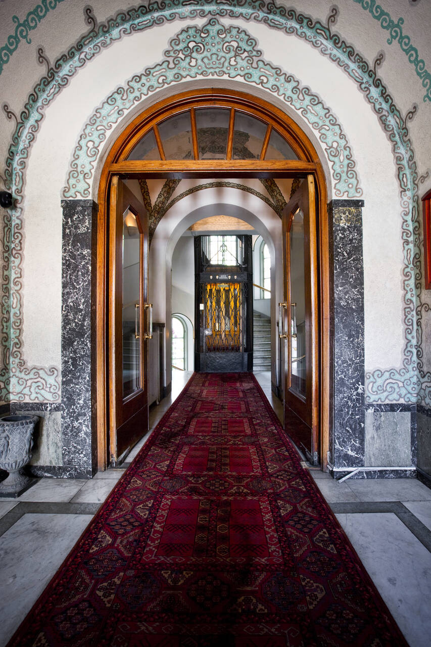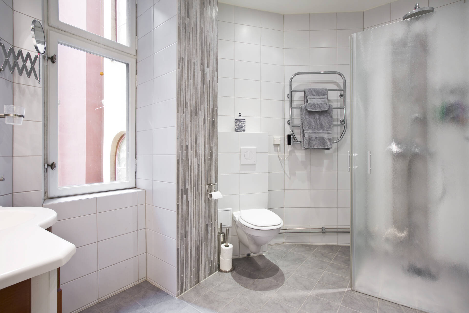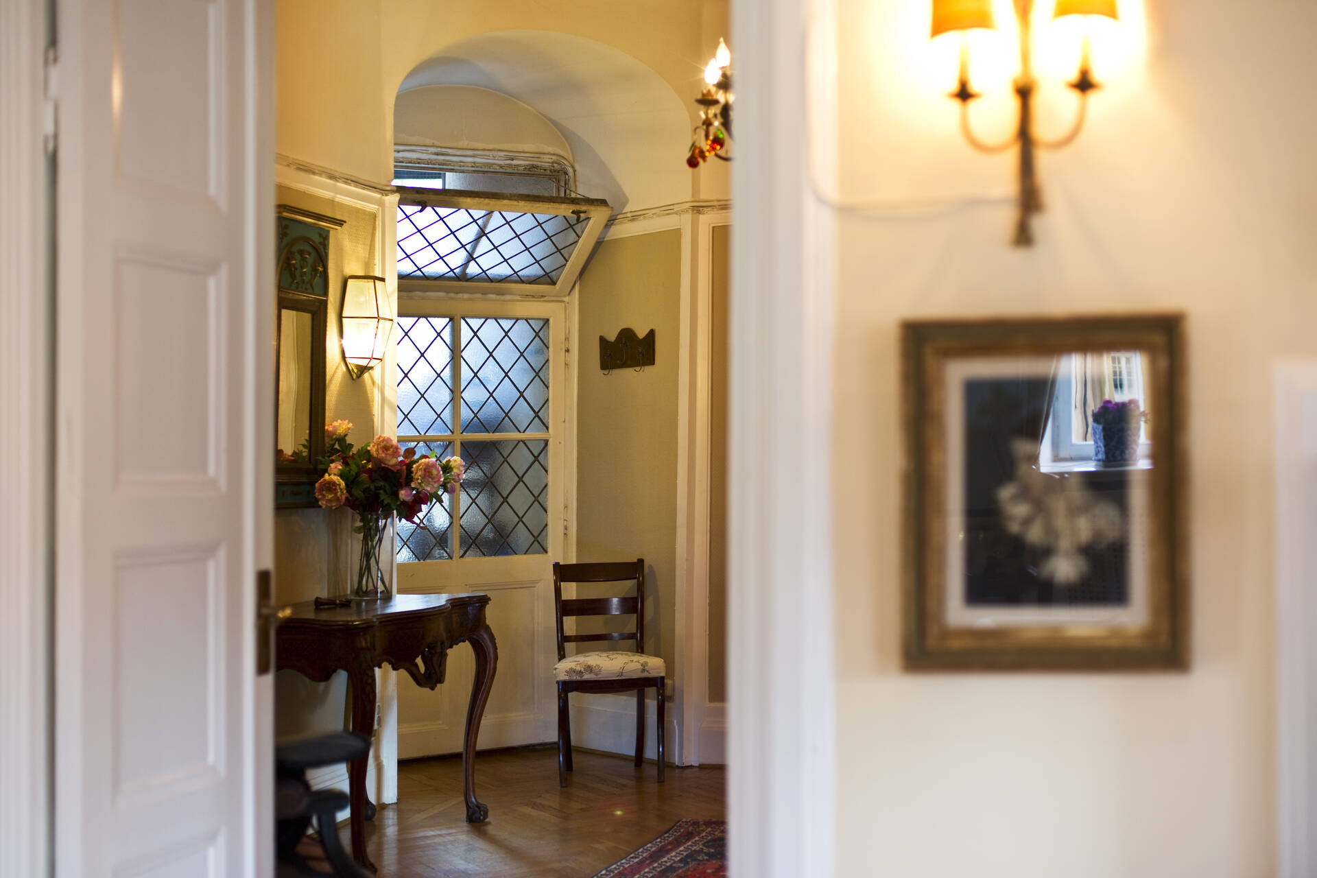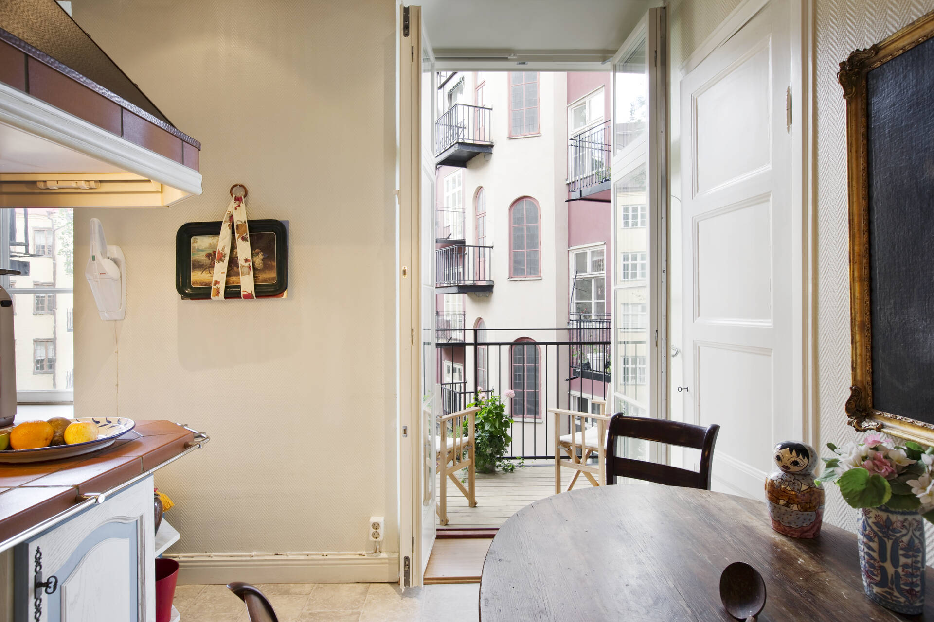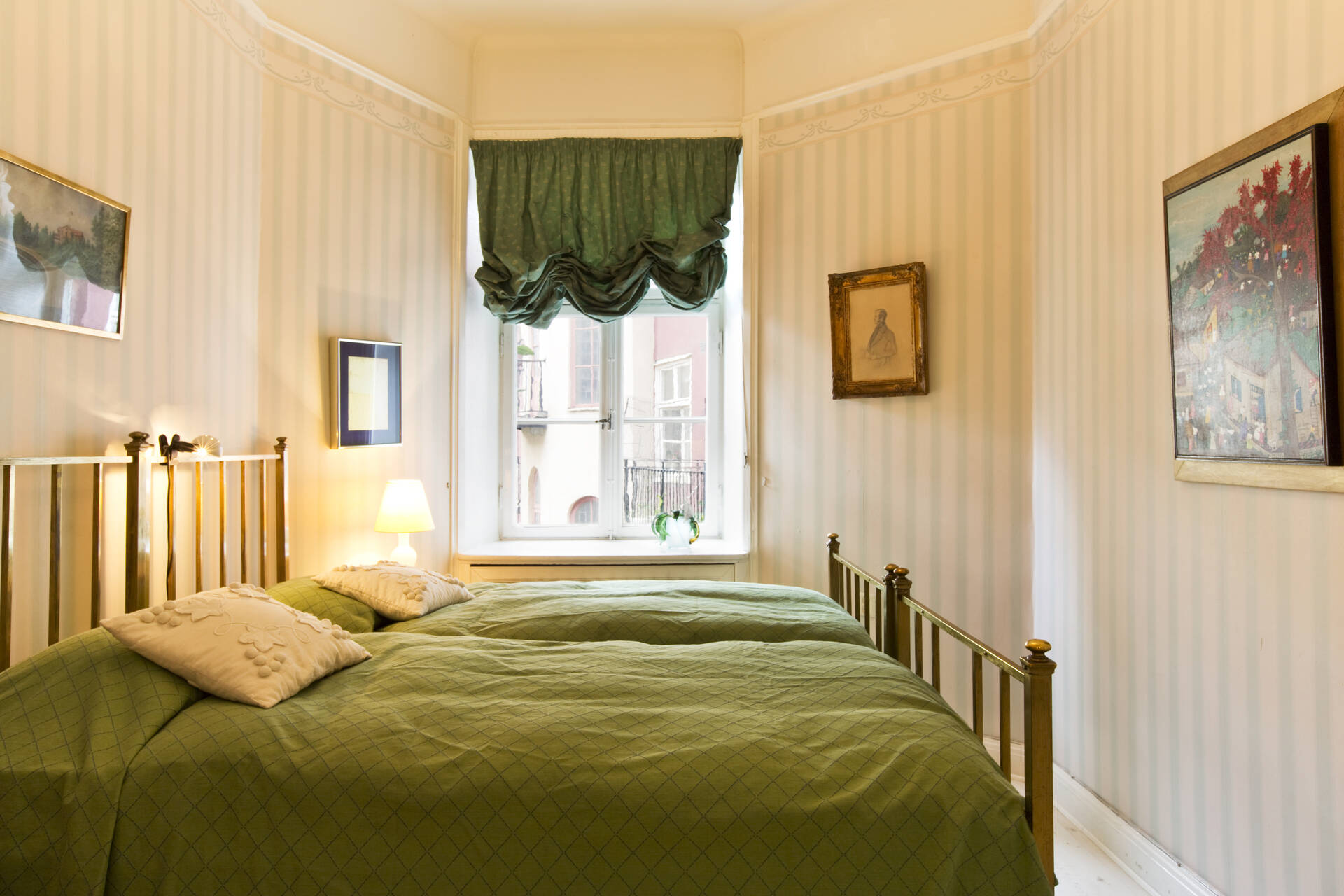 Våningen har en välkomnande hall med gäst-wc, och en liten balkong. Social del i form av bibliotek/arbetsrum, vardagsrum med öppen spis och matsal. Därefter följer serveringsgång som leder till stort kök, egen köksentré med hiss, samt stor balkong mot rofylld innergård. Privat sfär intill med två utmärkta sovrum, varav det ena består av två sammanslagna rum med biblioteksdel och kakelugn. Även klädkammare och två fräscha badrum. Vid behov kan biblioteket omvandlas till sovrum med möjlighet till badrum en suite.