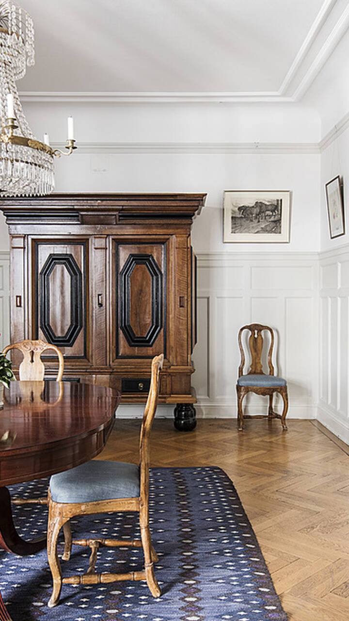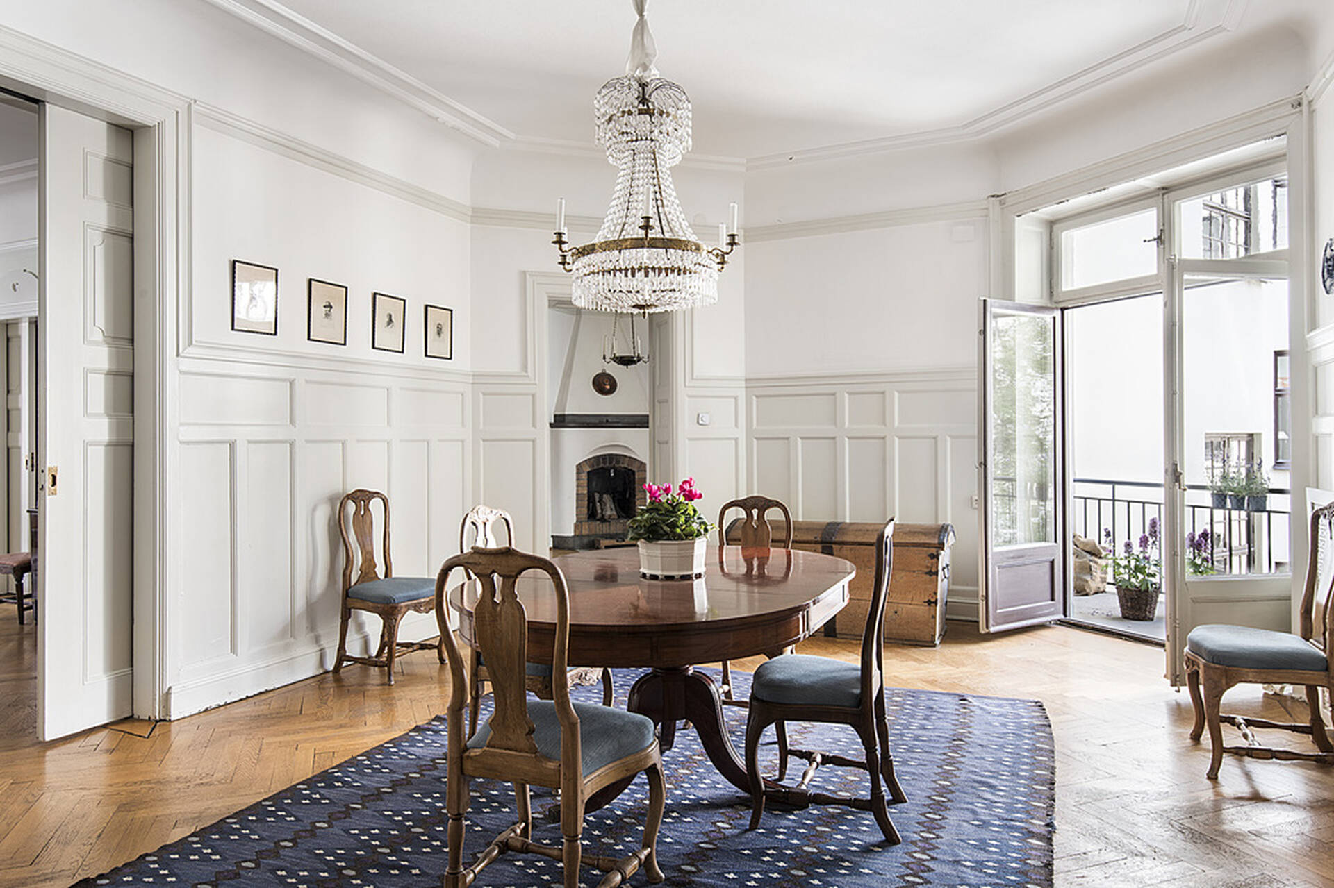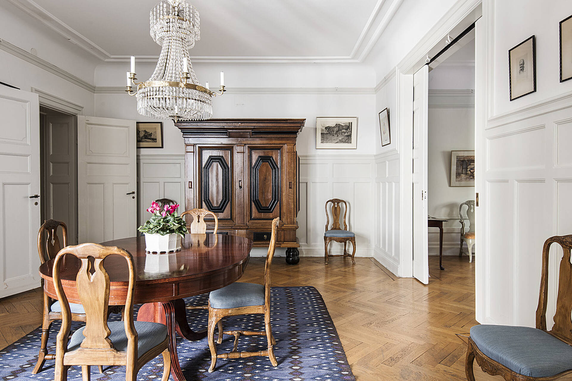 Välkommen till denna klassiska våning i hjärtat av Östermalm i vackert hus anno 1913. Våningen om 190 kvm präglas av sin tids arkitektur med högt i tak, stram stuckatur, vackra väggsnickerier, spegeldörrar, fiskbensmönstrad ekparkett och furugolv. Ett hem som med lite ny energi kan återskapas till sin forna glans. Välkomnande hall med kapprum och garderob, öppen spis och gäst wc. Med ingång från hallen ligger bibliotek/sovrum med stora fönster mot Östermalmsgatan. Skjutdörr öppnas mot det rymliga vardagsrummet bredvid. Genom vardagsrummet återfinns den generösa matsalen med plats för många sittande middagsgäster. Två skjutdörrar skiljer vardagsrum och matsal åt. Väl tilltaget sovrum och ytterligare två mindre intill köket. Samtliga sovrum mot lugn, välskött innergård. Fint ljust kök med matplats. Låg avgift i förening med exceptionellt god ekonomi. Mycket vacker, representativ och välskött fastighet nära Karlaplan i lugnt läge.