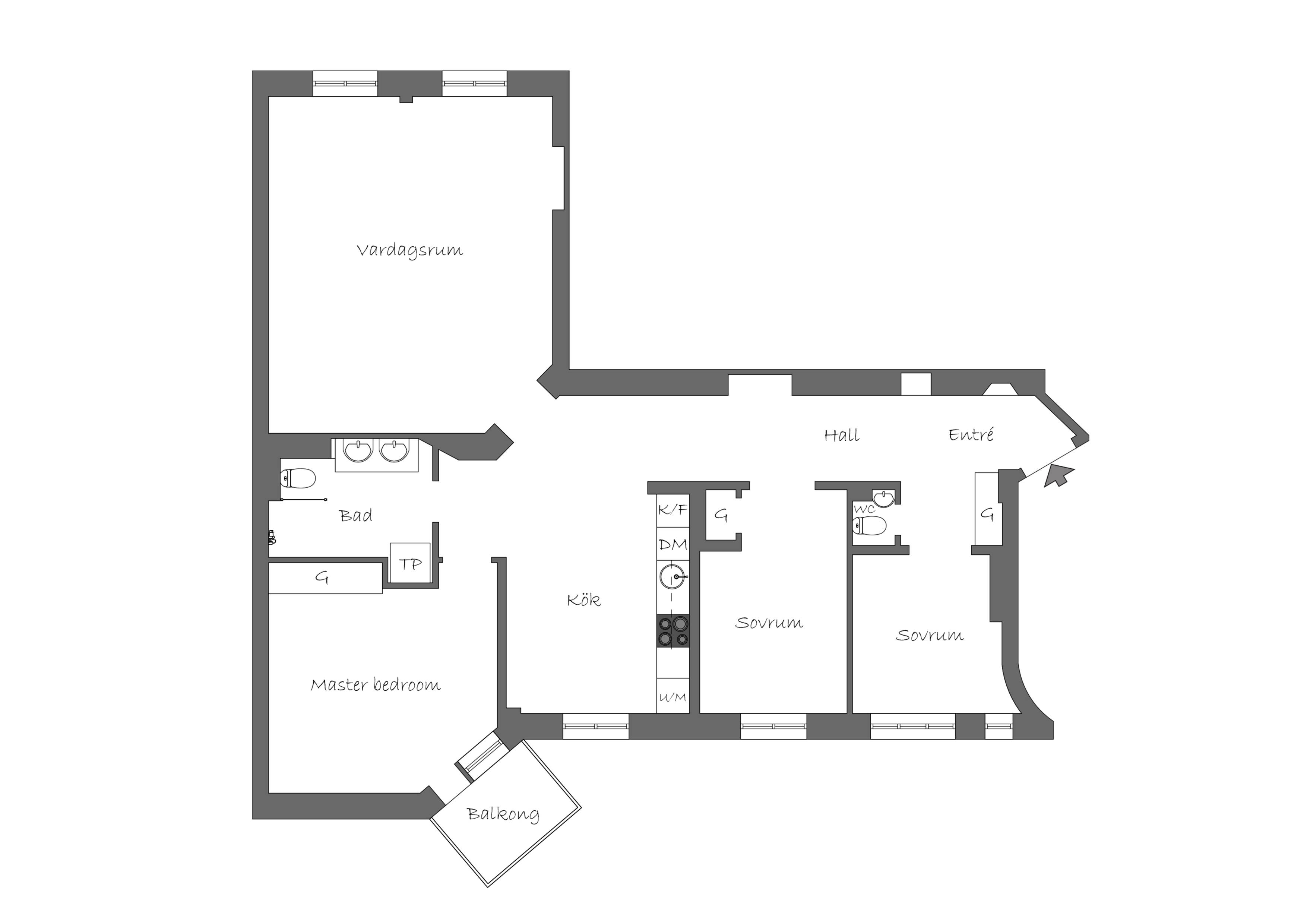 Intill köket ligger master-bedroom med platsbyggd garderobsvägg och utgång till våningens generösa balkong mot den välskötta innergården.
