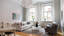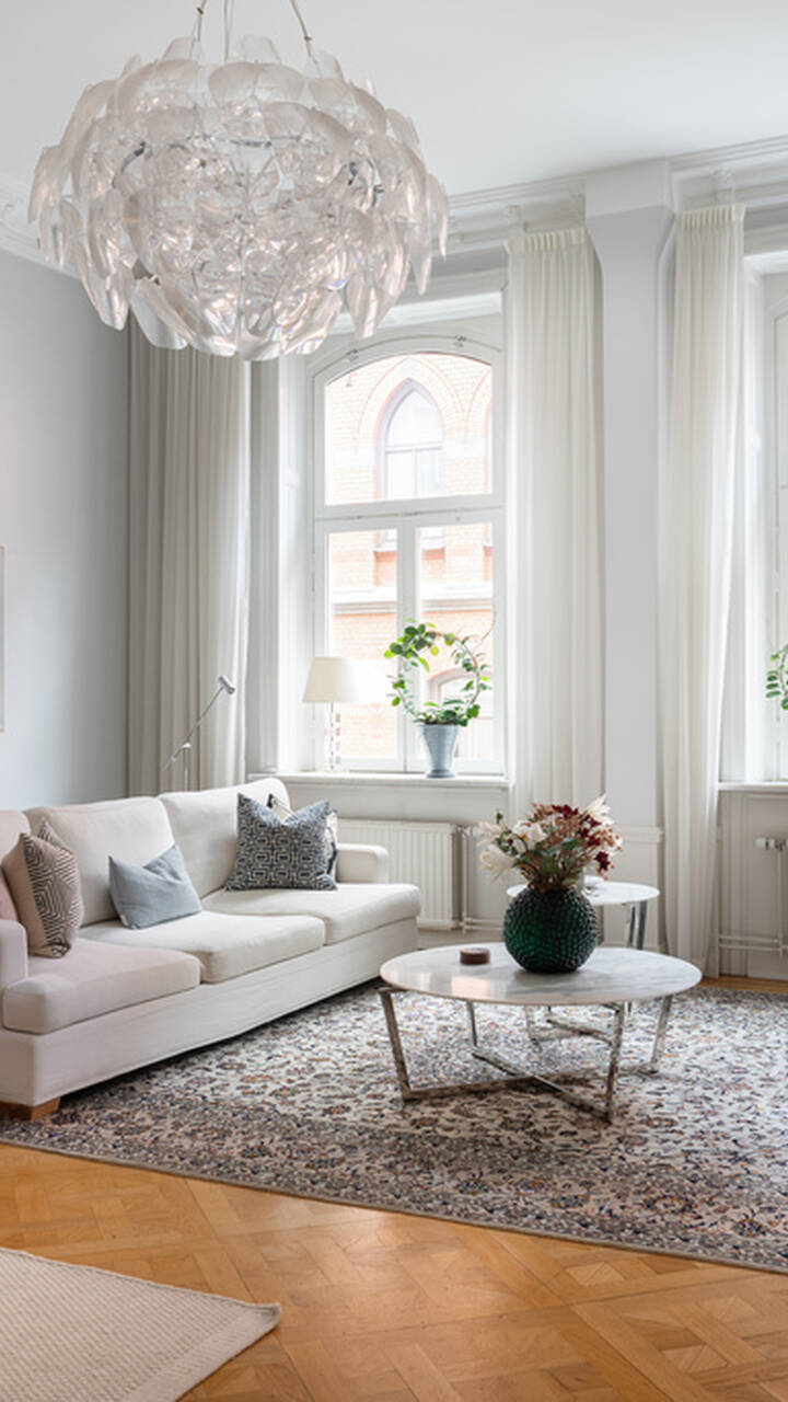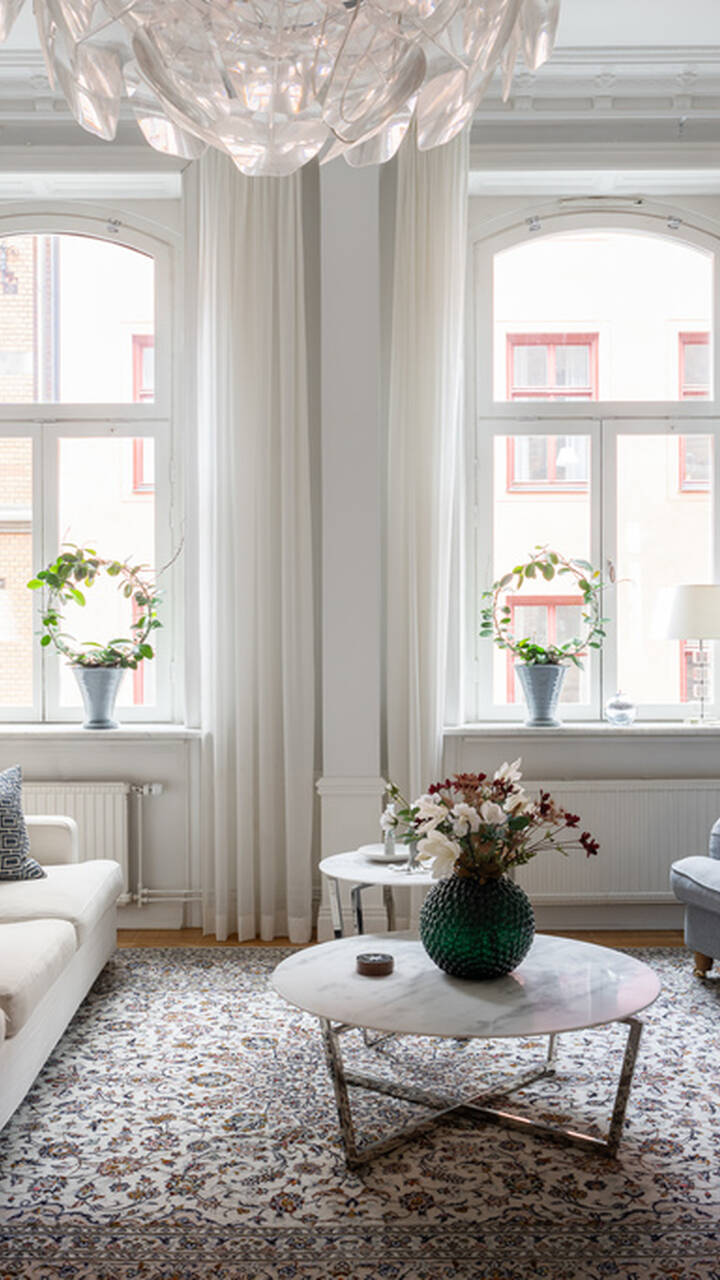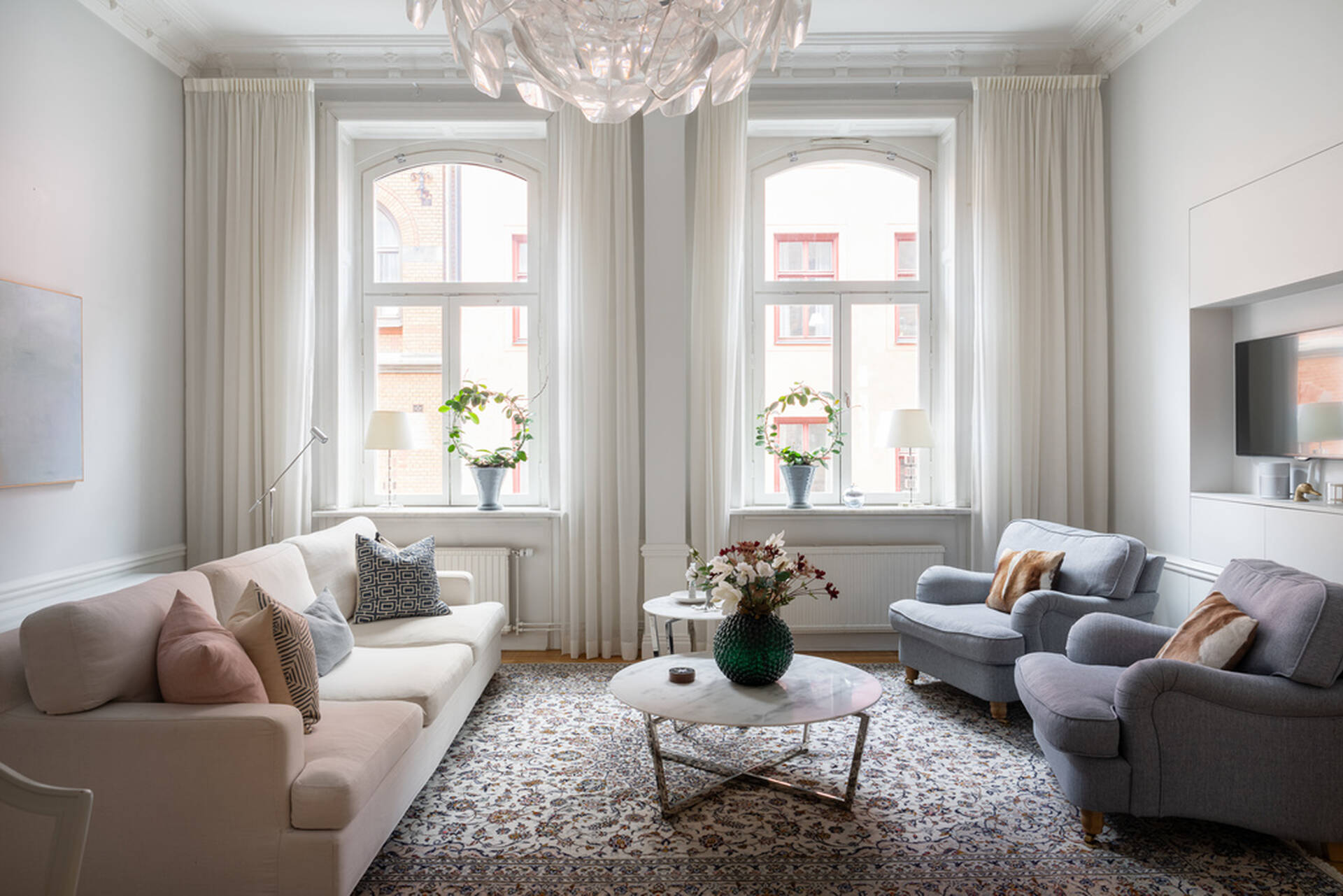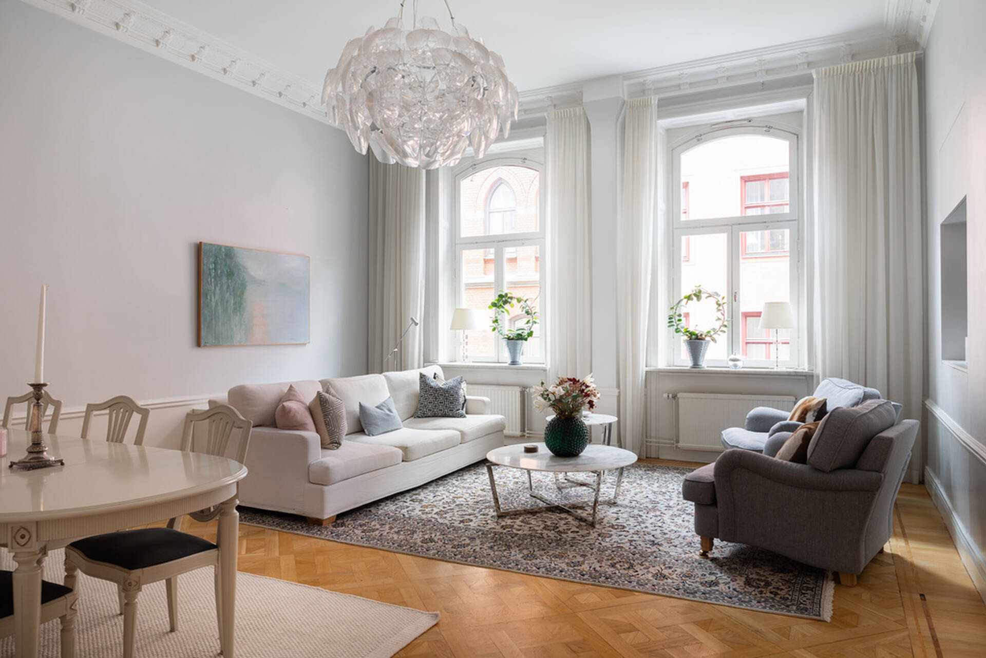 Mot Skeppargatan ligger sällskapsrummet, genom vackra pardörrar med blyinfattat glas. Här finns gott om plats för såväl matsalsdel som stor soffgrupp. Två höga fönster med djupa nischer och fönsterbänkar i carrara marmor. Smarta inbyggda förvaringsskåp och nisch med plats för vägghängd TV.