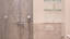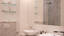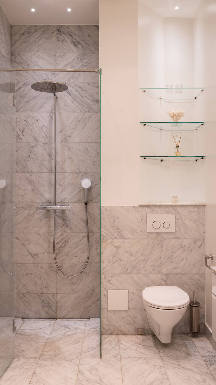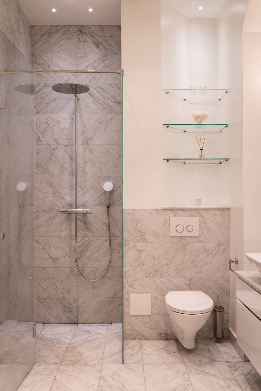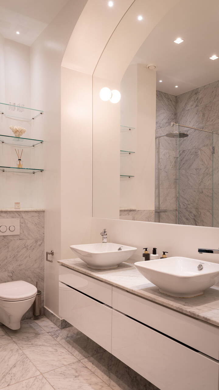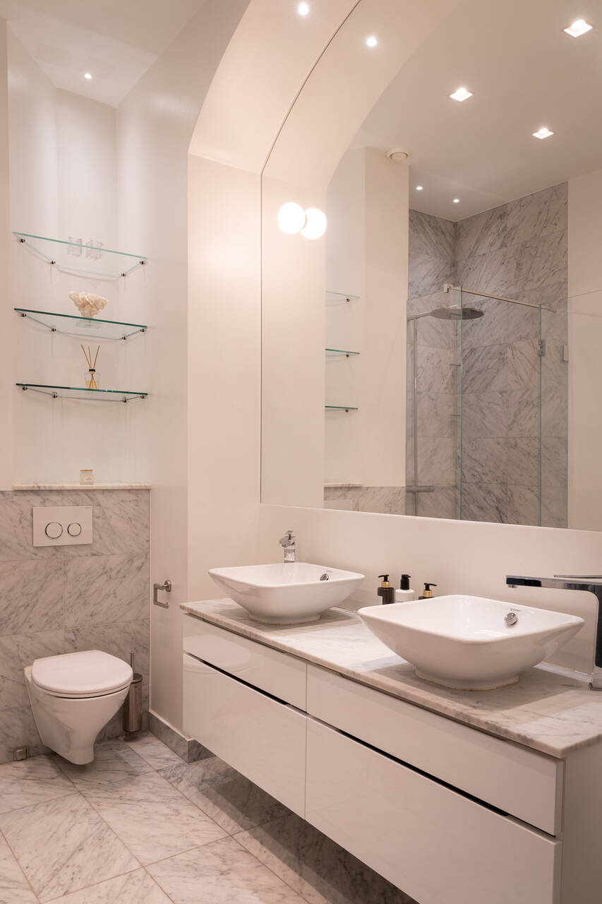 Stort familjebadrum med dubbla handfat på kommod med förvaringslådor i vitt, dusch, vägghängd wc och tvättpelare (Miele) diskret placerad bakom en frostad glasdörr. Golv, duschvägg och kommod-bänkskiva i carrara marmor. Inbyggda lampor från FLOS i stor platsbyggd valvspegel, monterad över kommoden. El-golvvärme.