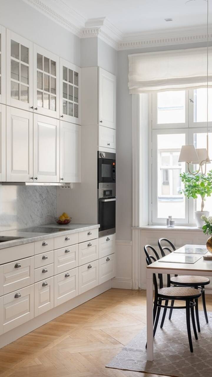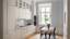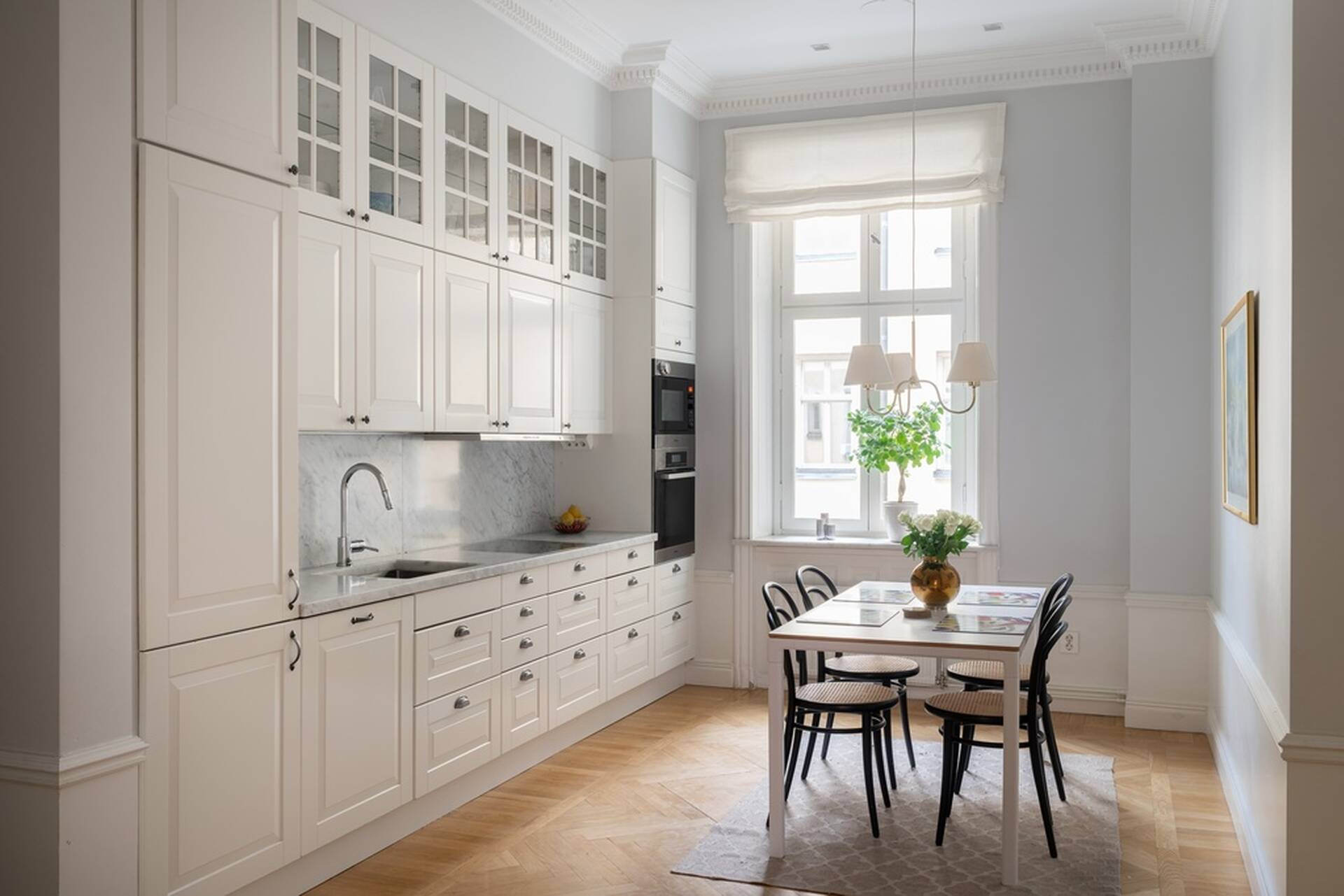 Från den breda hallgången öppnar det trivsamma köket upp sig med en rymlig matplats. Här finns gott om förvaring i flertalet skåp med vita luckor och handtag i rostfritt stål. Arbetsbänk och stänkskydd i carrara marmor. Helintegrerade vitvaror såsom kyl/frys och diskmaskin (Bosch), induktionshäll, kolfilterfläkt, ugn och microvågsugn (Miele).