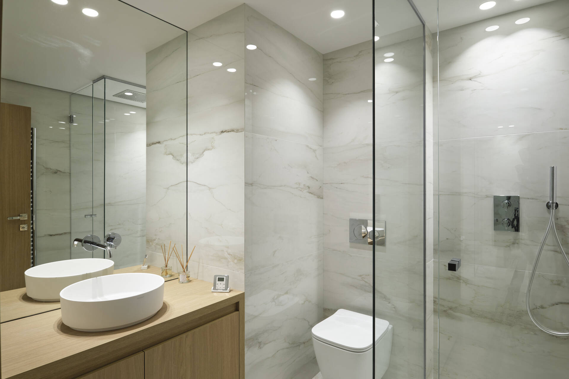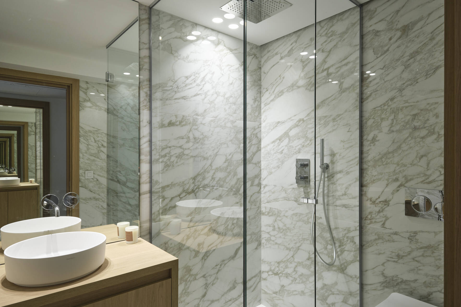 Den rymmer tre sovrum, alla med egna badrum och toaletter, ett separat fullt utrustat kök med balkong, samt ett rymligt vardags- och matrum med utgång till en 16,5 m² stor terrass med söderläge och direkt havsutsikt. Bland ytterligare bekvämligheter finns luftkonditionering, elektriska persienner och gott om förvaringsutrymmen.
