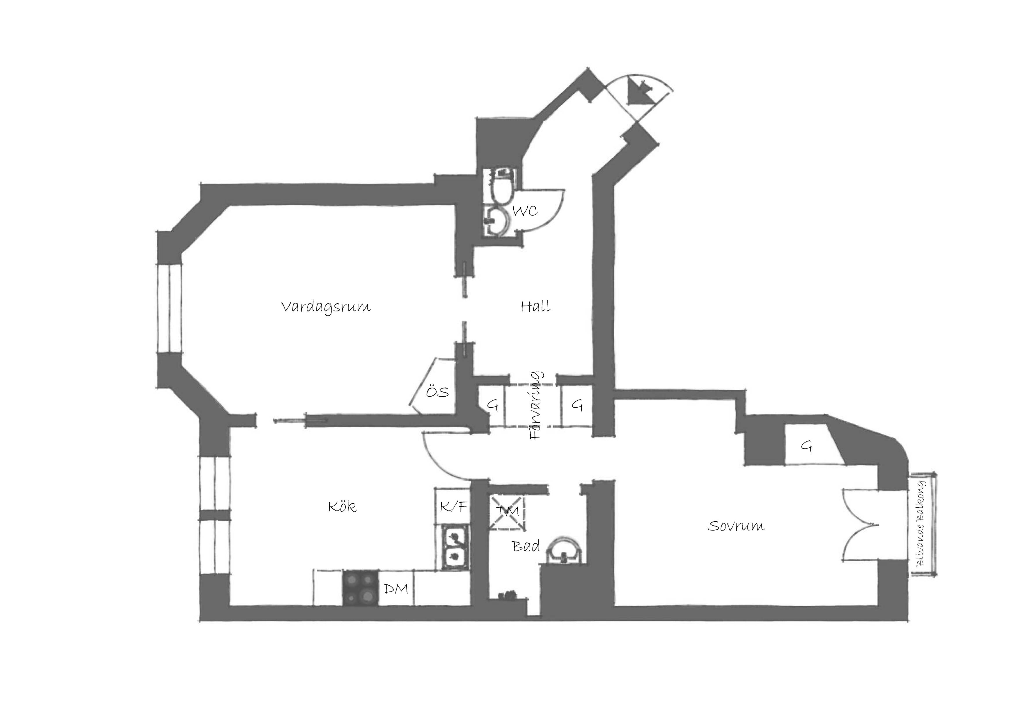 Via fin säkerhetsdörr nås hallen med hyllor och toalett. Skjutdörrar leder in till vackert vardagsrum med öppen spis. Skjutdörr även in till köket, som har två fönster, hällspis från Smeg, fläkt, diskmaskin, kyl och frys och rymlig och trevlig matplats. Liten inre hall med garderob, överskåp och städskåp. Badrum med kakel, takdusch med dörr, golvvärme, handdukstork, spots och Siemens TM. Sovrum mot gården med vitlaserat furugolv, garderob och blivande balkong med byggnation, som påbörjas inom kort.