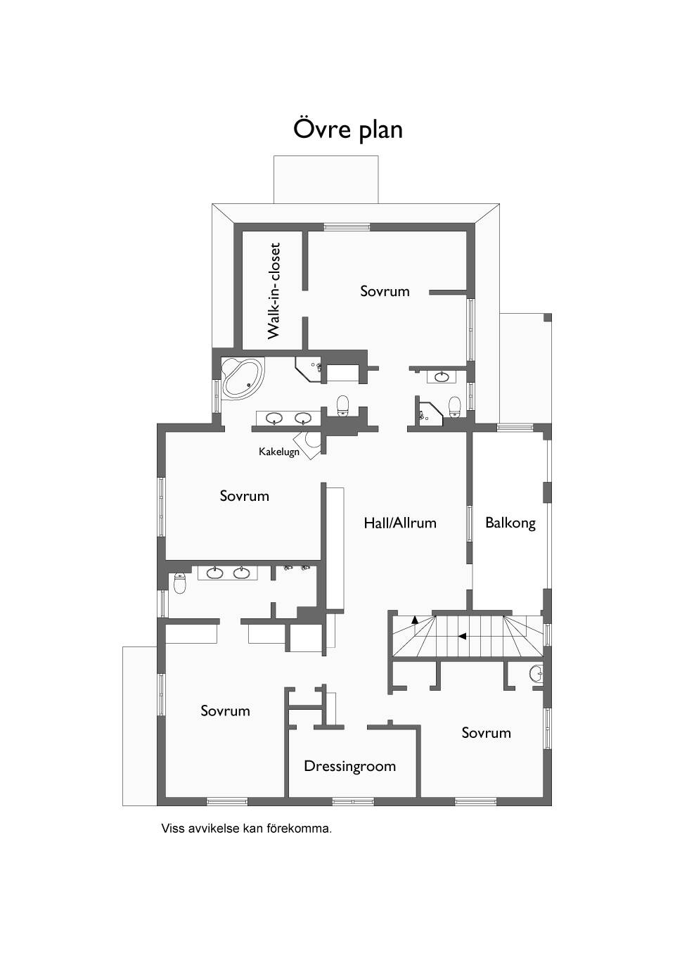 Övre Plan: Allrum/sällskapsrum. Hörnsovrum med tapet från GP & J Baker, Emperors Garden, Songbird Silver Rose. Inbyggda garderober med belysning. Nytt element med nytt platsbyggt elementskydd, ny fönsterbräda. Ensuite duschrum med fönster och vattenburen golvvärme. Dubbla handfat nedsänkta i portugisisk kalksten. Inredd badrumshylla bakom stor spegel. Handdukstork.Vägghängd toalett. Plexiglasdörrar leder in till tandem duschplatser. Liten hall. Skogarderob med nya hyllplan. Nyinrett fint dressingroom i ett f.d sovrum med hyllor och garderober. Flickrum med tapet från Cole & Son, garderober, nytt platsbyggt elementskydd och fönsterbräda. Stort sovrum med tapet från Cole & Son; A Collection of Flowers Humming Birds, vackert brett fönster med ny fönsterbräda och platsbyggt elementskydd samt vit kakelugn. Ensuite stort kakelsatt bad och duschrum med fönster, inredning i turkost och vitt kakel samt Carraramarmor. Dubbla handfat nedsänkta i Carraramarmor. Vägghängd toalett. Elektrisk golvvärme. Handdukstork. Badrummet nås även från hallen och allrummet. På gaveln ligger ytterligare ett fint sovrum med delvis snedtak och med tapet från Designers Guild; Vivienne Westwood. Ensuite walk-in-closet. I den angränsande hallen finns duschrum inrett med carraramarmor och vägghängd toalett.