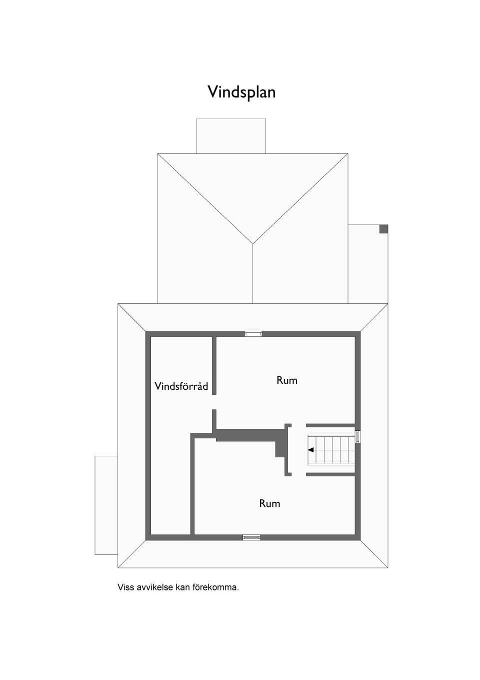 Vindsplan: Trätrappa leder upp till rymligt vindsplan med två inredda rum med takfönster. Rummen kan användas som arbetsrum och sovrum. Innanför arbetsrummet finns en isolerad förvaringsvind. Via lucka nås den övre oisolerade vinden och skorstenen.