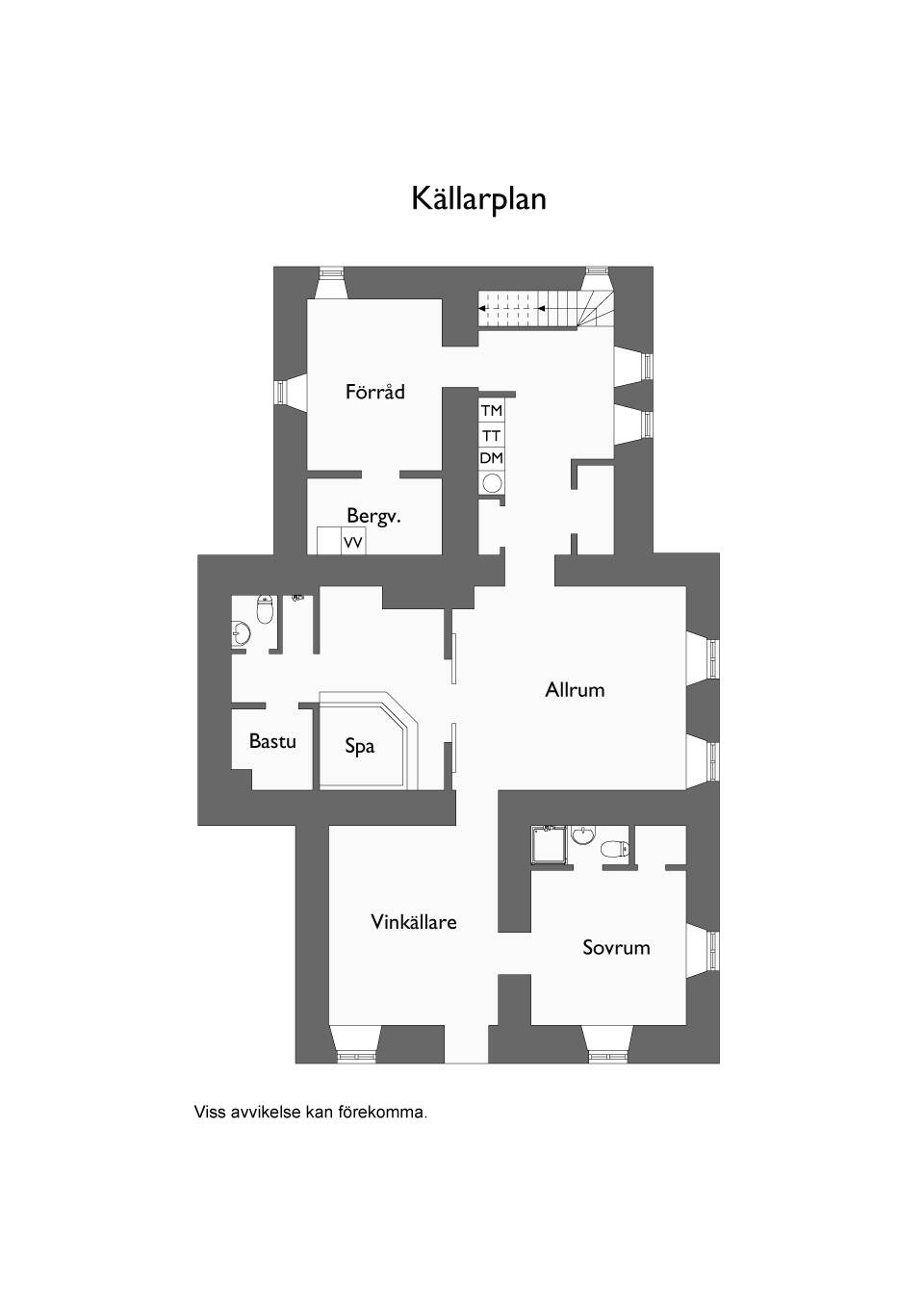 Källarplan:Planet kan nås dels via egen ingång från södra gaveln och dels via trappa från köket. Hela planet renoverades år 2000 med vitslammade väggar och nytt gjutet golv med klinker och vattenburen golvvärme. Stor relaxavdelning med sällskapsrum med bioduk. Vackra fönster. Spa-avdelning med rund pool. Duschplats med glasbetongvägg. Separat wc. Bastu med ångfunktionsaggregat. Vinkällare. Separat rum med angränsande helkaklat duschrum med mosaik och wc, passande som barnflickerum eller som tonårsrum. Avdelning med Miele diskmaskin, tvättmaskin och torktumlare samt rostfri ho. Kyl och frys finns även på detta plan för höjande av kapaciteten. Förrådsrum för matkällare. Pannrum. Denna del har ej golvvärme.