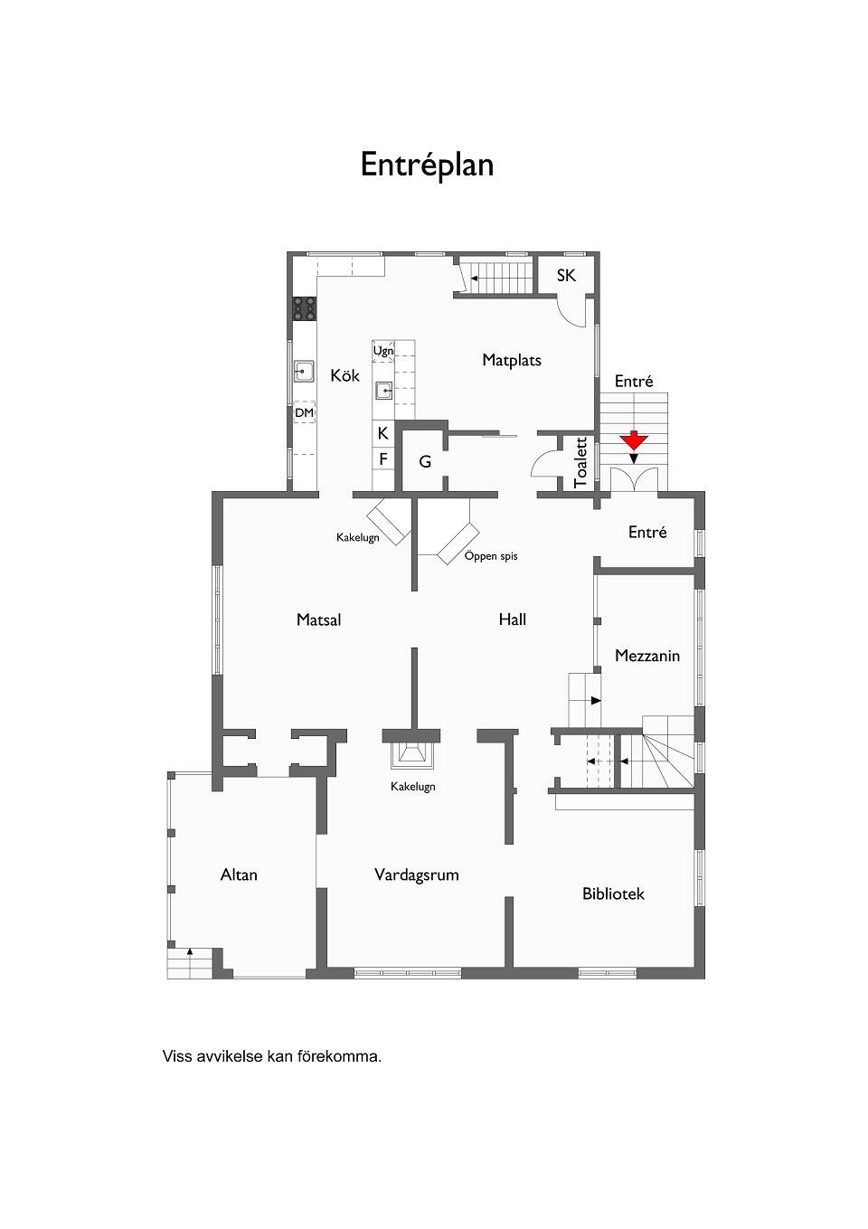 Entréplan: Förhall med nytt golv i svart och vit marmor lagt diagonalt med golvvärme.Generös och inbjudande, möblerbar hall med öppen spis. Mezzanin med platsbyggda nya elementskydd och fönsterbrädor. Valvformade dubbeldörrar leder in till ljus matsal med plats för 20 personer och vacker blåvit kakelugn. Ny dörr har satts in mot utgången till verandan. Ombonat herrum/bibliotek med infälld belysning i taknischen, platsbyggda bokhyllor och skåp, nya fönsterbrädor samt nylagt gediget parkettgolv. Vardagsrum/salong med vit kakelugn. Alla sällskapsrummen har renoverade fönster, nytillverkade elementskydd och specialtillverkade dörrhandtag i massiv mässing. Ny el har på ett fint sätt inspårats i väggarna. Gästtoalett med ekparkett, nytt engelskt handfat, ny engelsk toalett och tapet från Ralph Lauren. Kapprum och förhall har tapeter från Cole & Son, Colefax. Nybyggd klädkammare med tapet från Charles Sandberg och ekparkett.