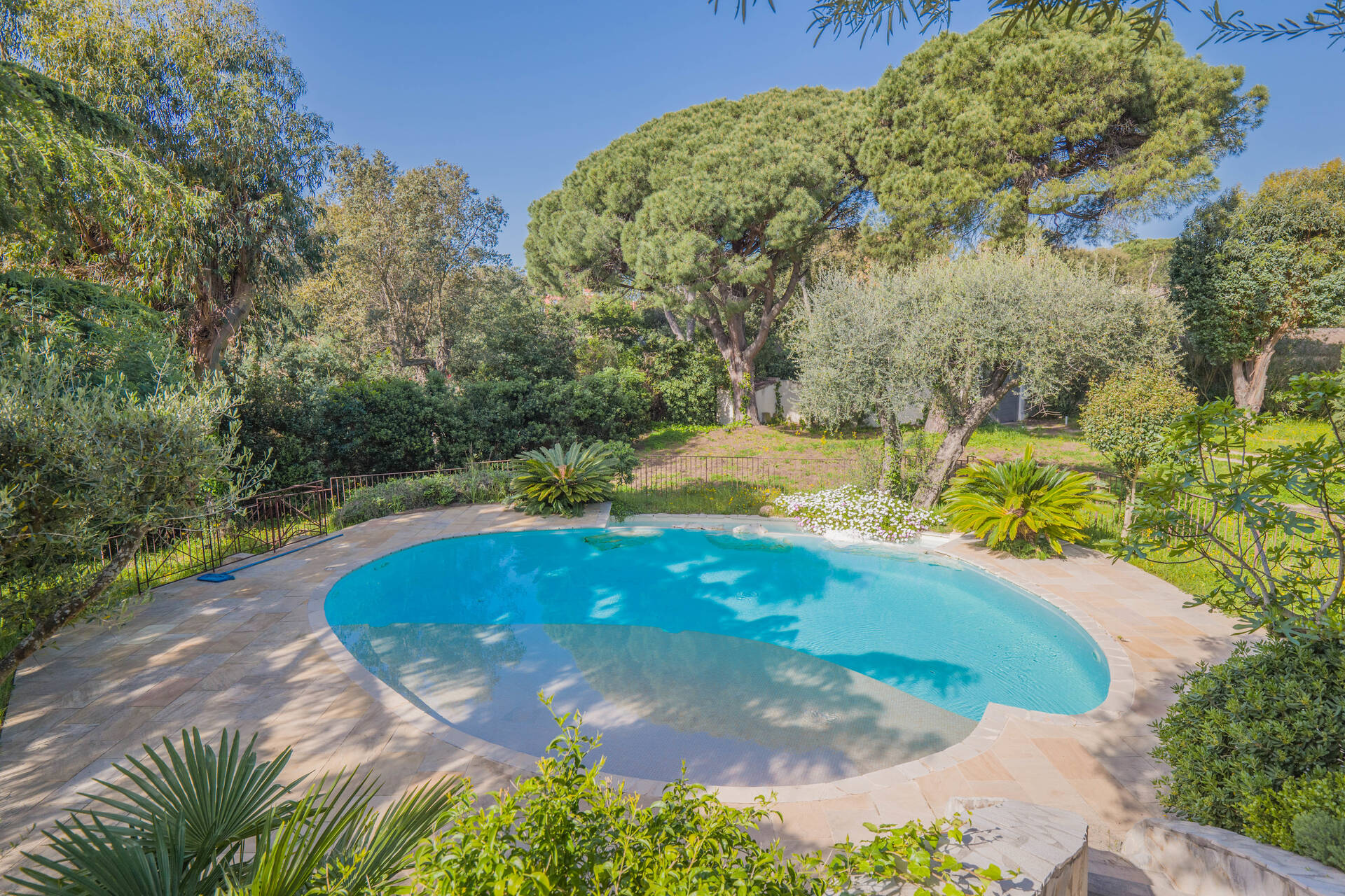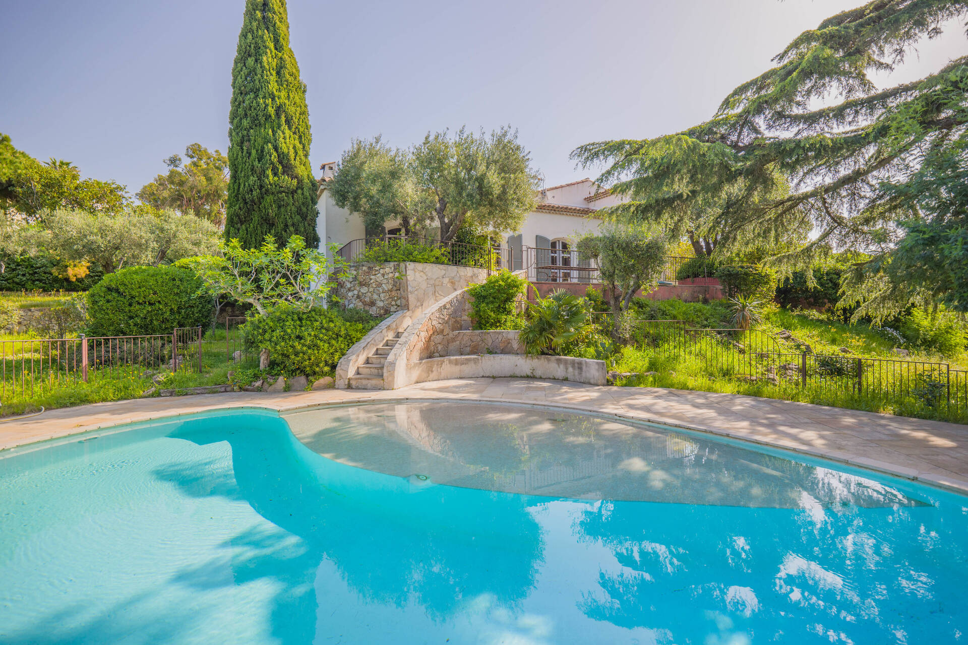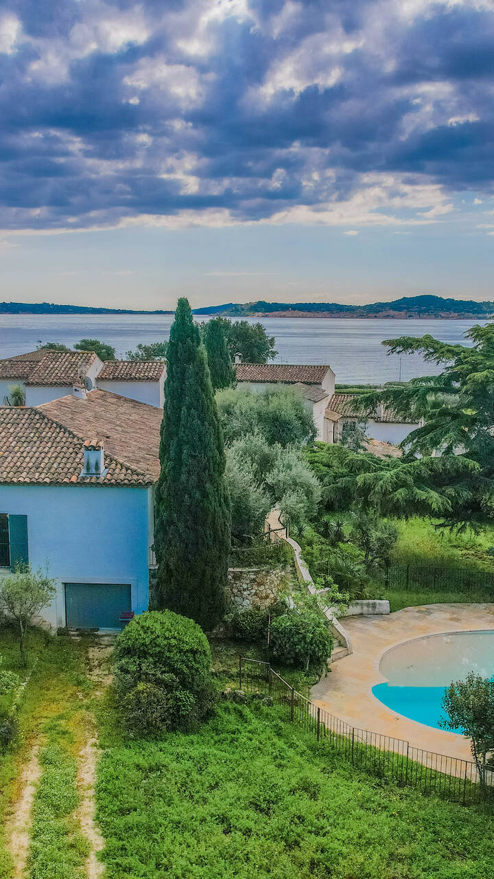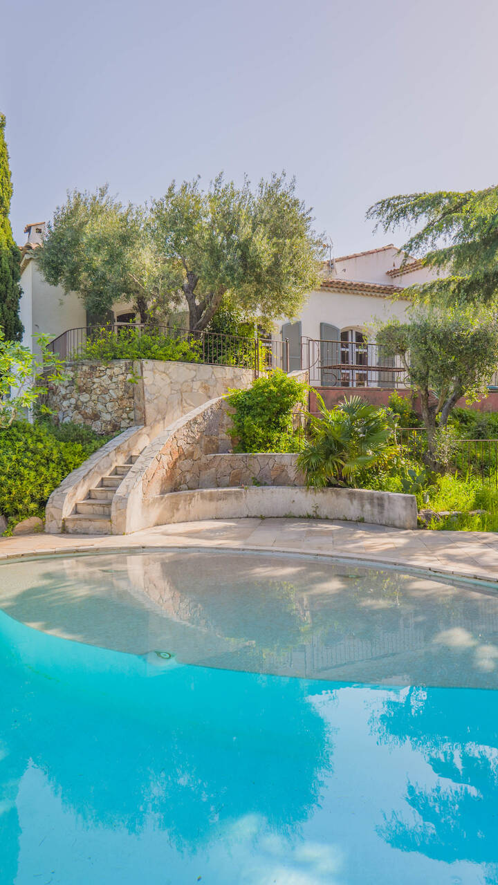 Med ett eftertraktat läge i det lugna och lummiga området intill Beauvallons golfbana, bara ca 200 meter från stranden, ligger denna generösa villa omgiven av en vacker trädgårdstomt på hela 3200 kvm. Här finns gott om utrymme för både familjeliv och gäster, och fastigheten erbjuder dessutom flera möjligheter för den som vill bygga ut eller stycka av.