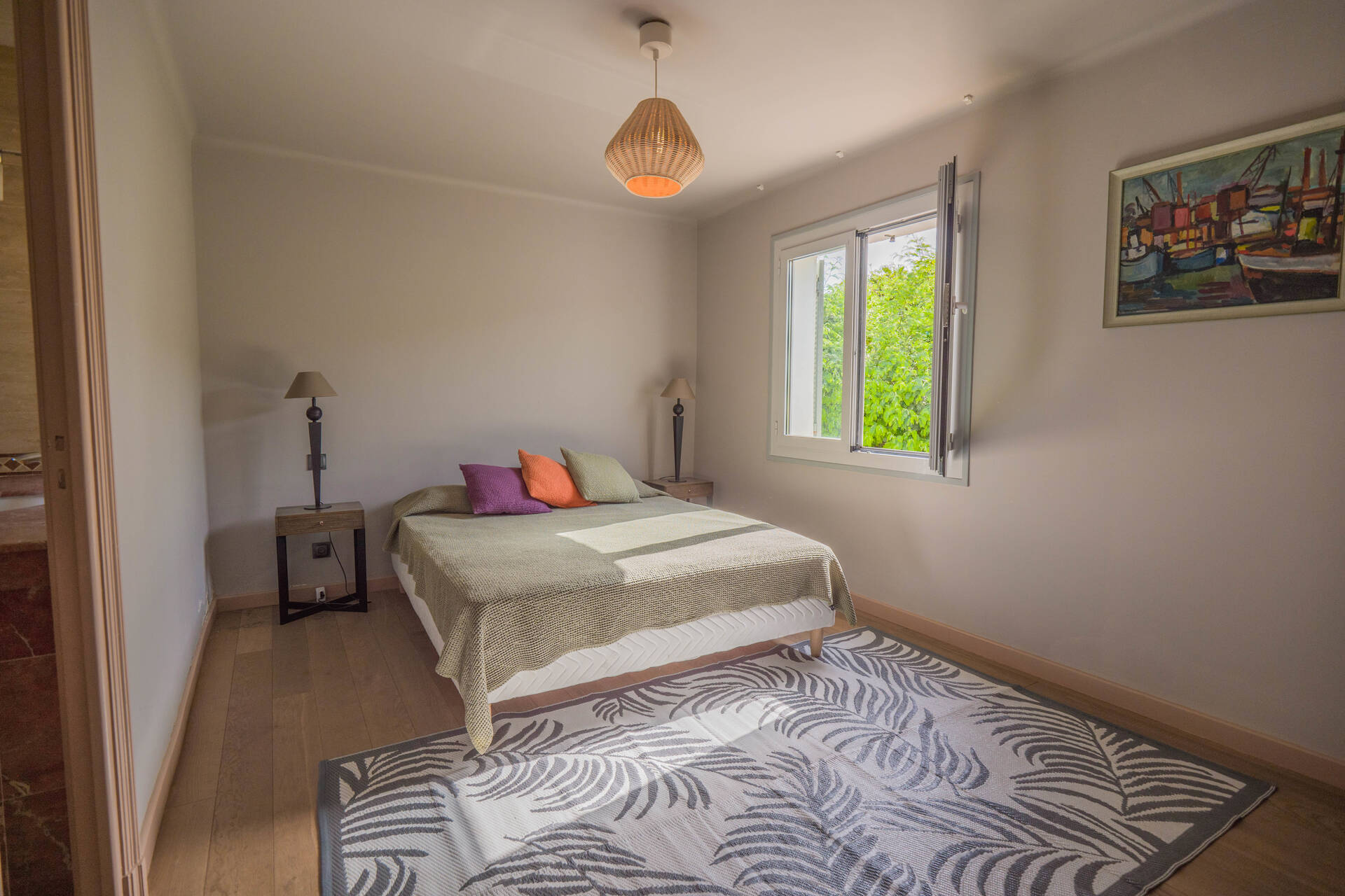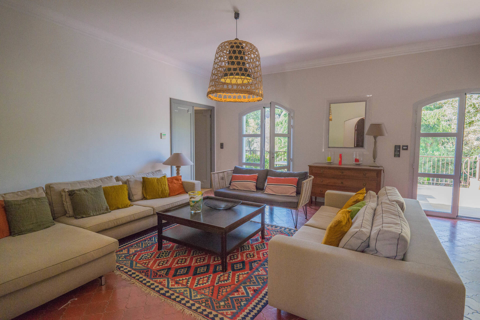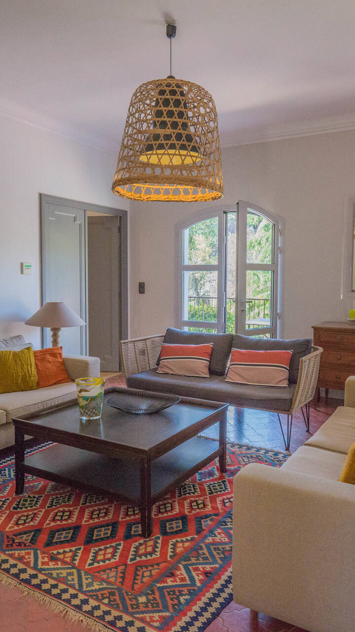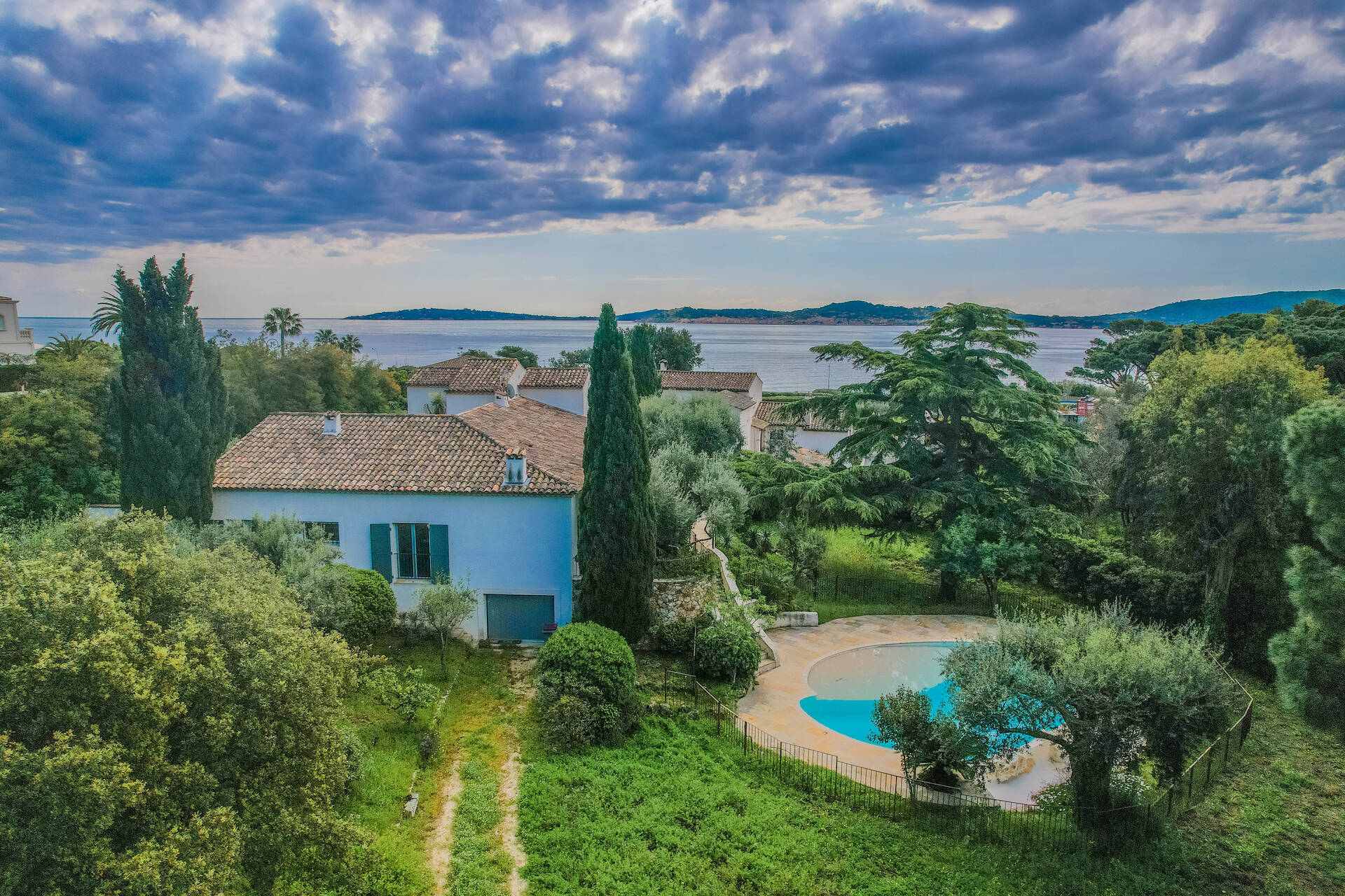 Med ett eftertraktat läge i det lugna och lummiga området intill Beauvallons golfbana, bara ca 200 meter från stranden, ligger denna generösa villa omgiven av en vacker trädgårdstomt på hela 3200 kvm. Här finns gott om utrymme för både familjeliv och gäster, och fastigheten erbjuder dessutom flera möjligheter för den som vill bygga ut eller stycka av.