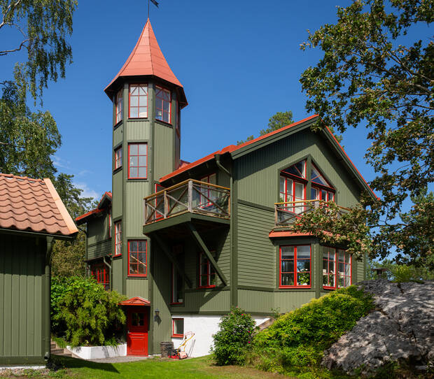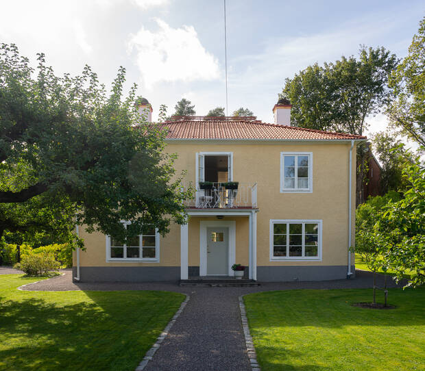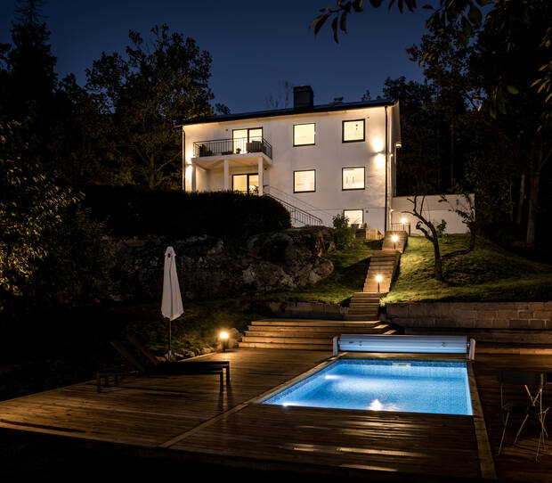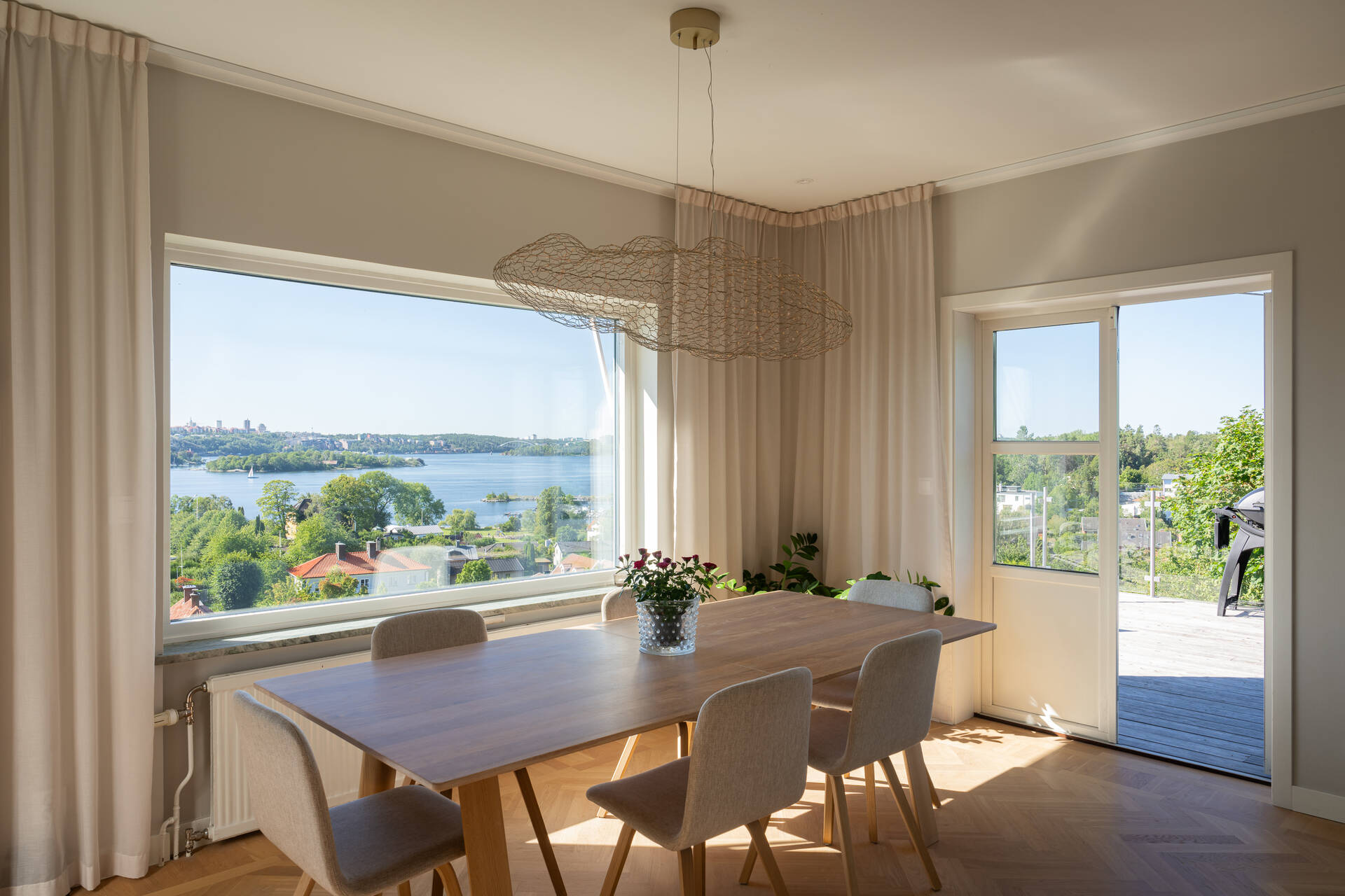 Välkommen till denna stora villa om totalt 345 kvm i Mölna på Lidingö, med ett högt och insynsskyddat läge med panoramautsikt över vattnet. Villan, uppförd 1939, kombinerar klassiska detaljer med moderna tillägg. Här finns flera blyinfattade fönster, fiskbensparkett och burspråk, samtidigt som kök och badrum har renoverats med stilren materialpalett. Fördelat på tre plan finns här fyra sovrum, generösa sällskapsytor och flera uteplatser, perfekt för en stor familj med höga krav.