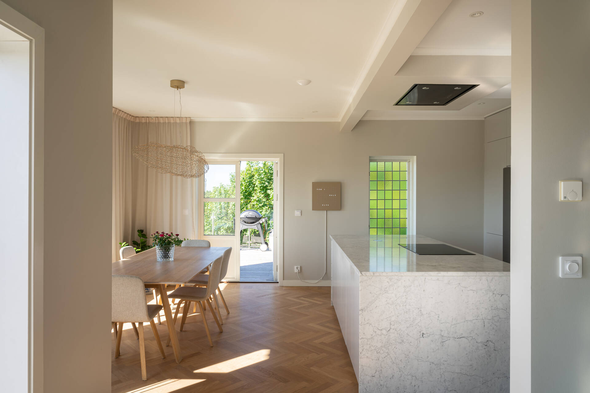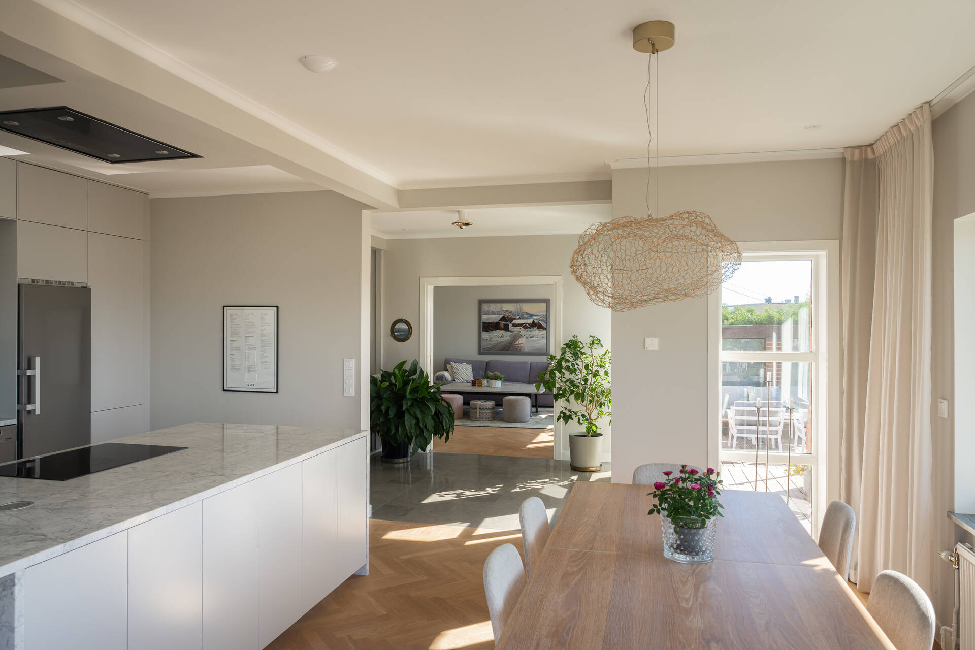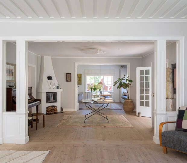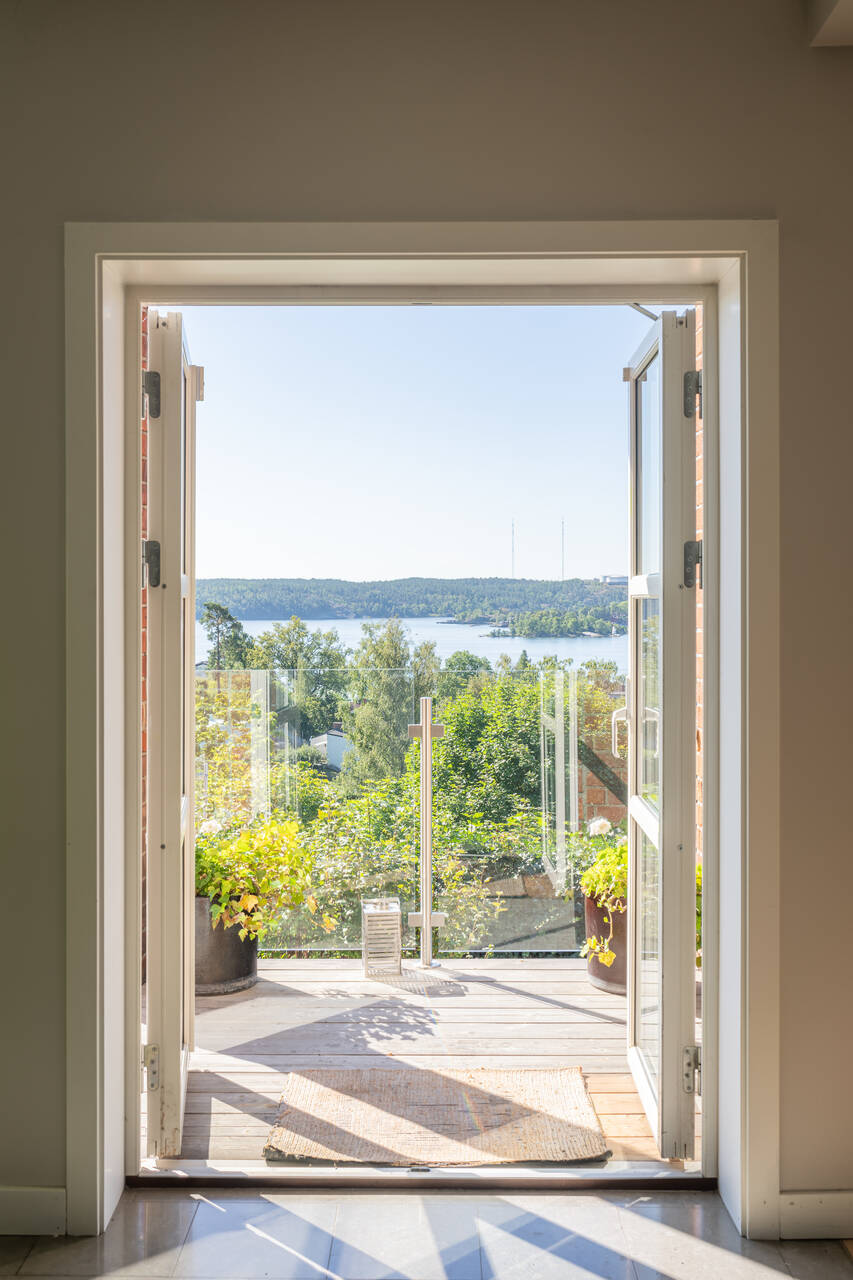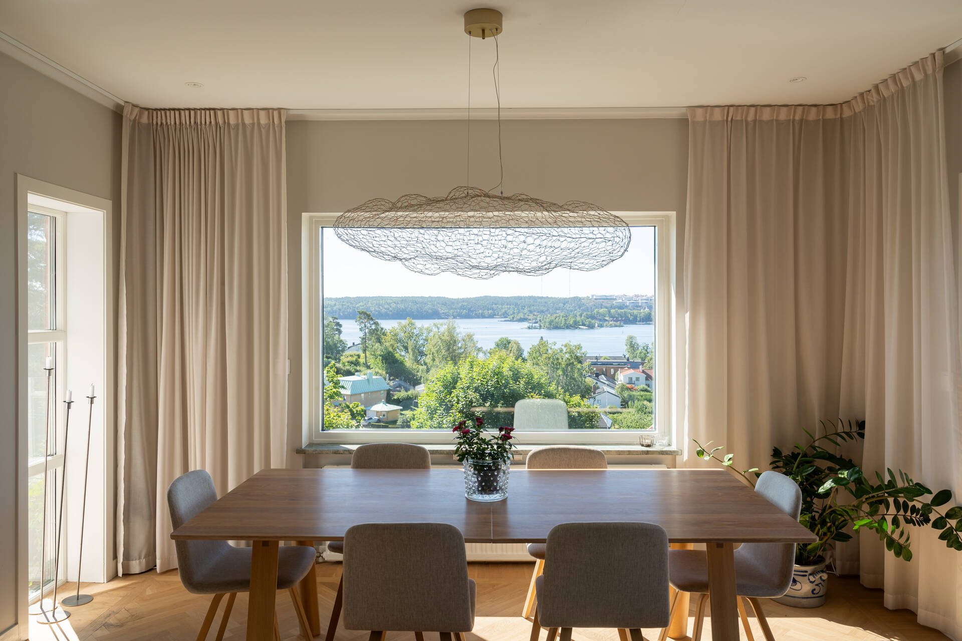 Till vänster från hallen återfinns vardagsrum med platsbyggd bokhylla längs ena väggen, murad öppen spis och vackra fönster. Till höger ligger matsal och kök med ytterligare uteplats med kvällssol som borgar för mysiga grillmiddagar i solnedgången. Köket är smakfullt utformat med grå luckor, Carrara-marmor, rostfria vitvaror, dubbla diskmaskiner och vinkyl. Både vardagsrum och matsal erbjuder stora fönster med storslagen vy mot vattnet.