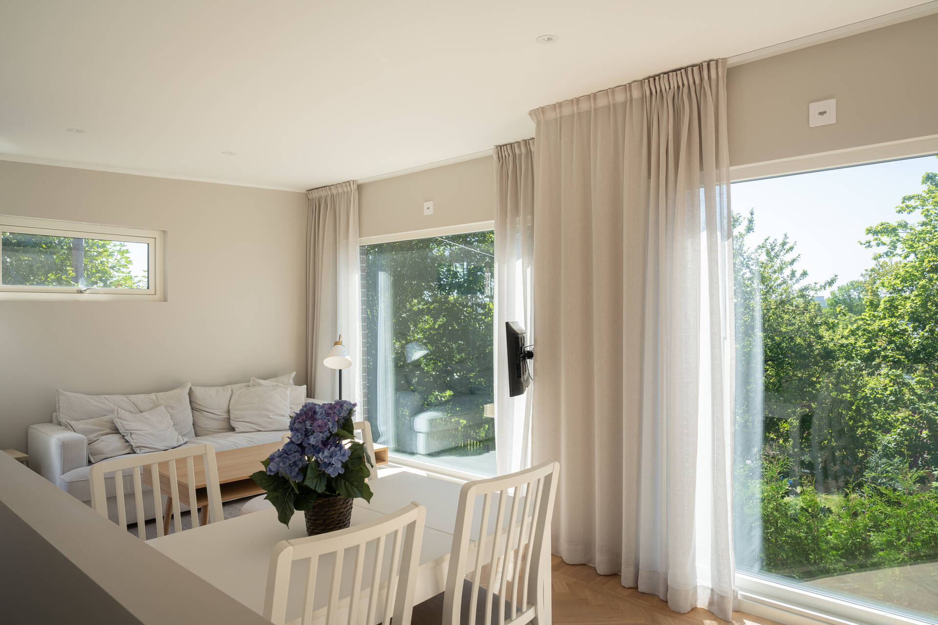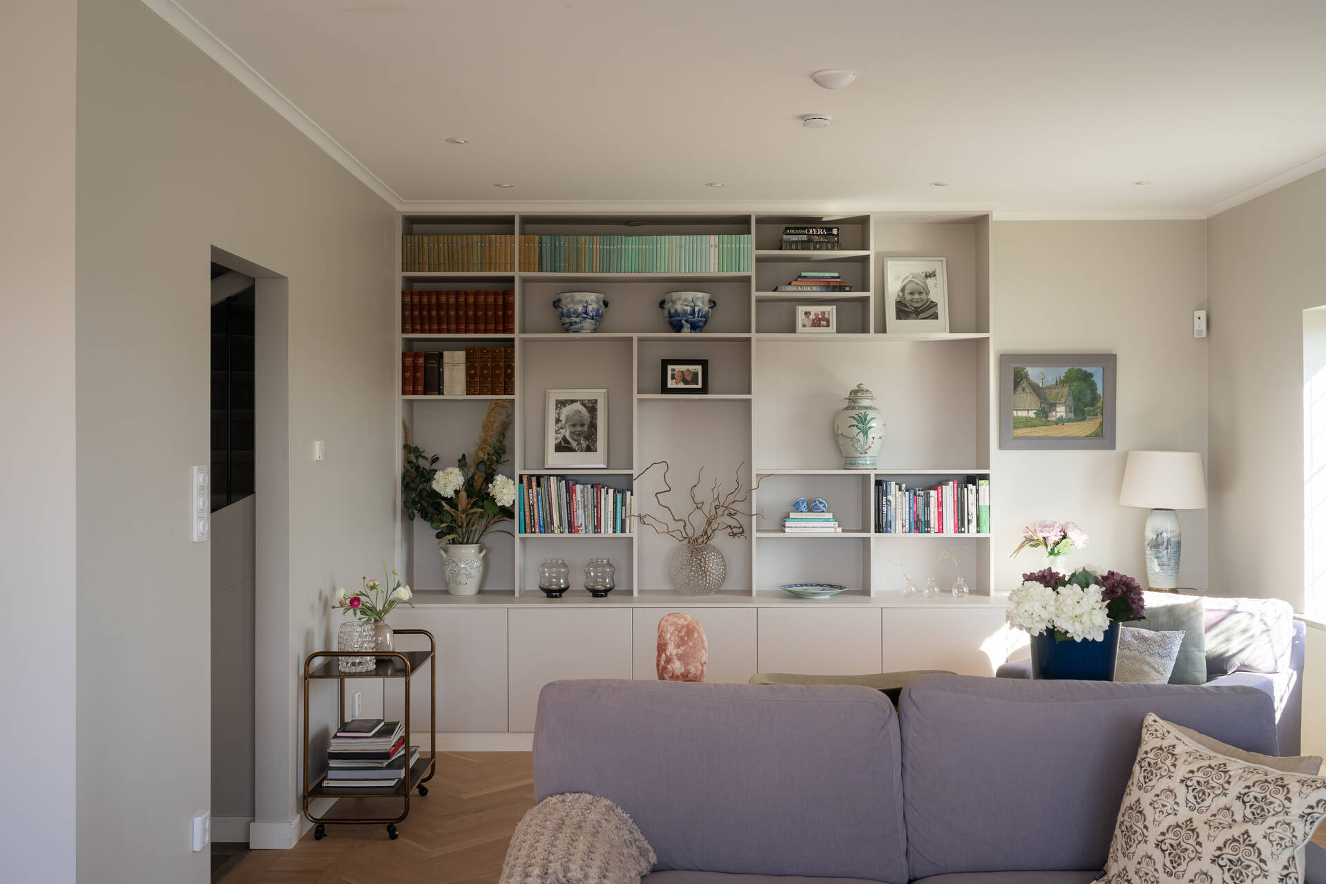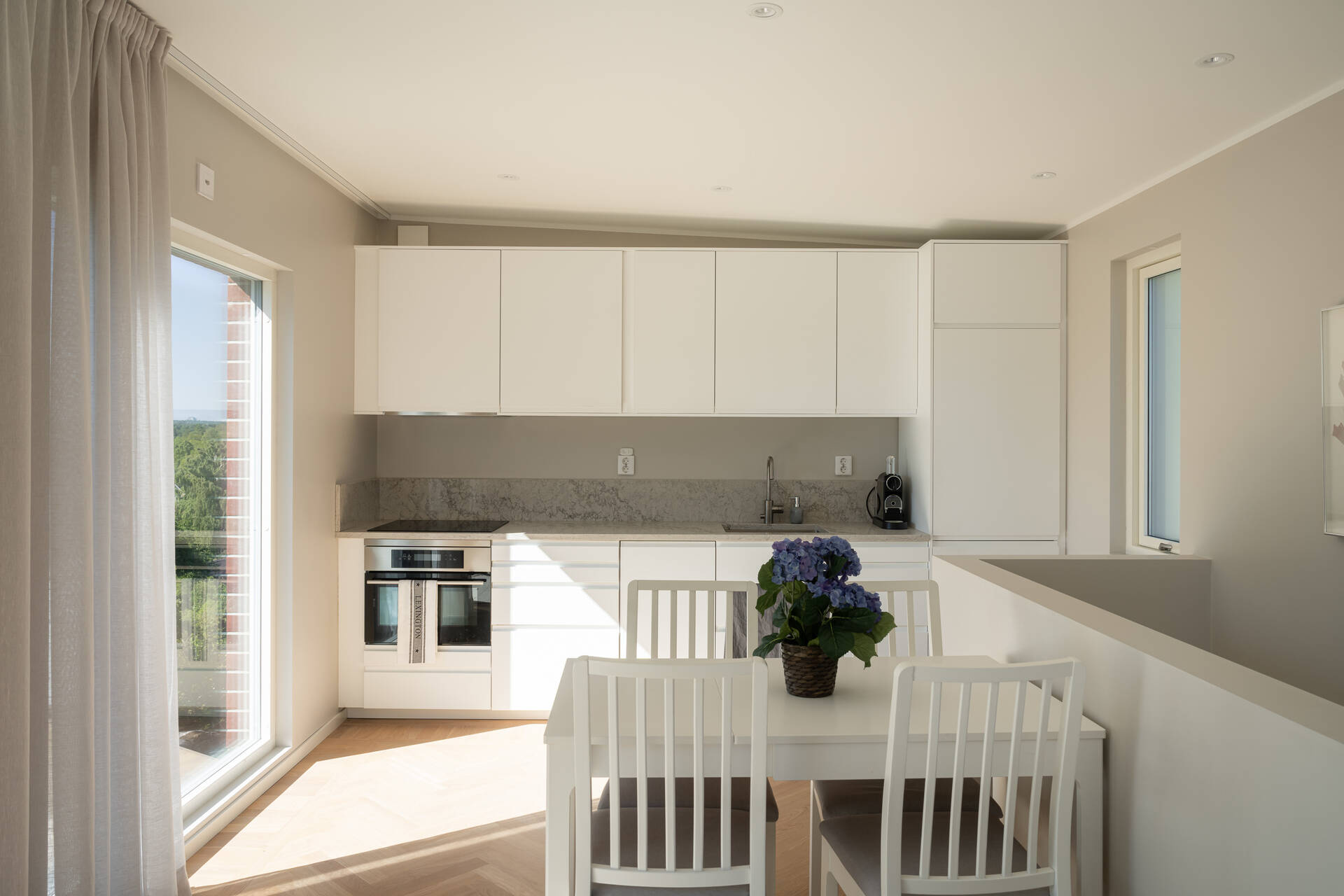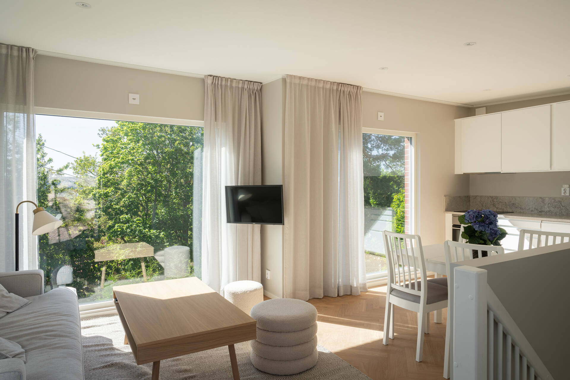 Till vänster från hallen återfinns vardagsrum med platsbyggd bokhylla längs ena väggen, murad öppen spis och vackra fönster. Till höger ligger matsal och kök med ytterligare uteplats med kvällssol som borgar för mysiga grillmiddagar i solnedgången. Köket är smakfullt utformat med grå luckor, Carrara-marmor, rostfria vitvaror, dubbla diskmaskiner och vinkyl. Både vardagsrum och matsal erbjuder stora fönster med storslagen vy mot vattnet.