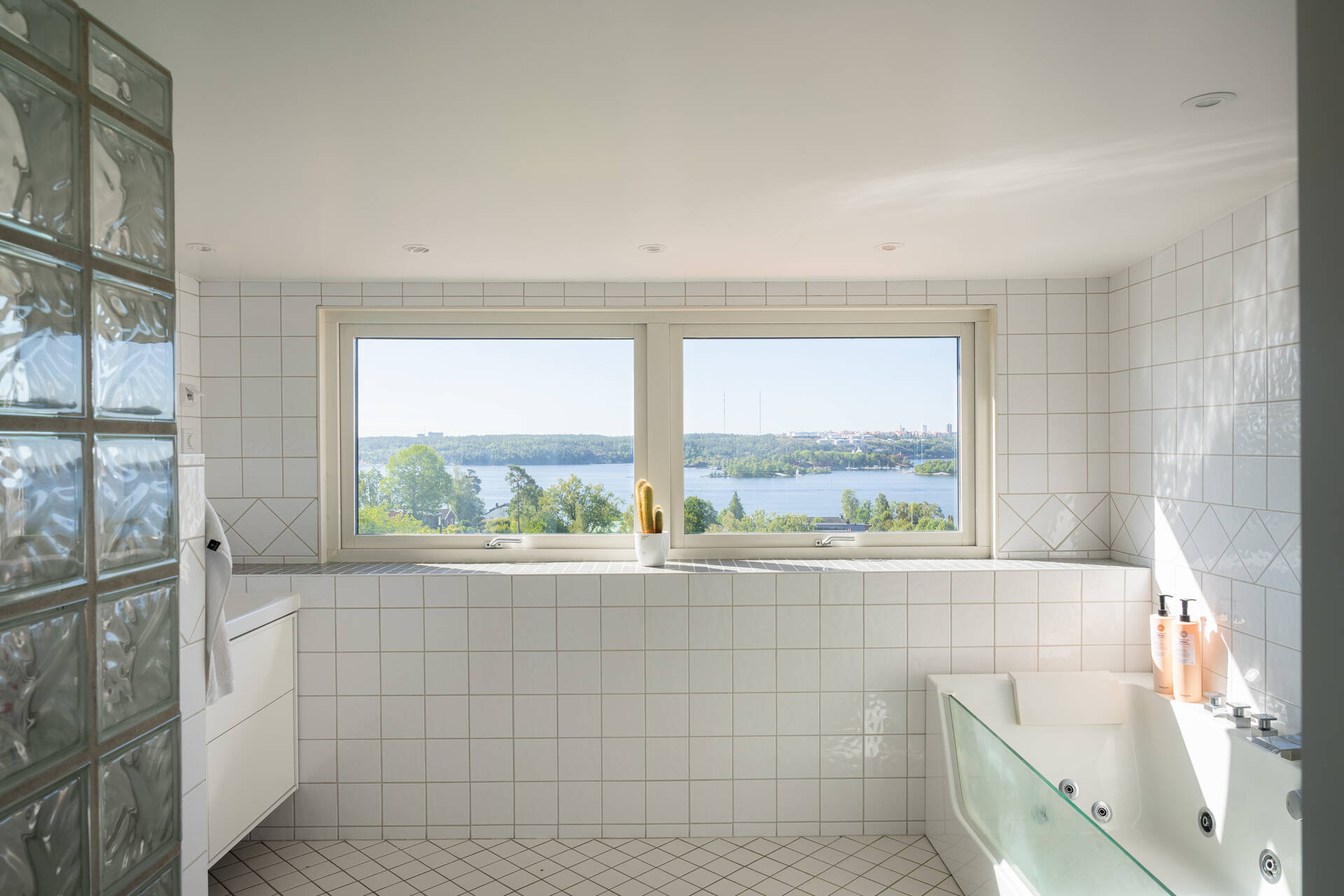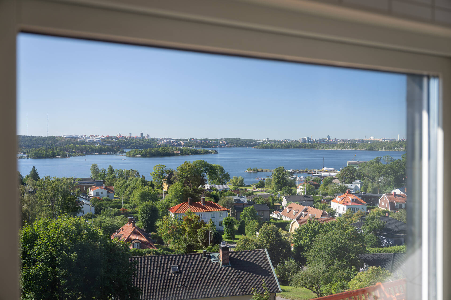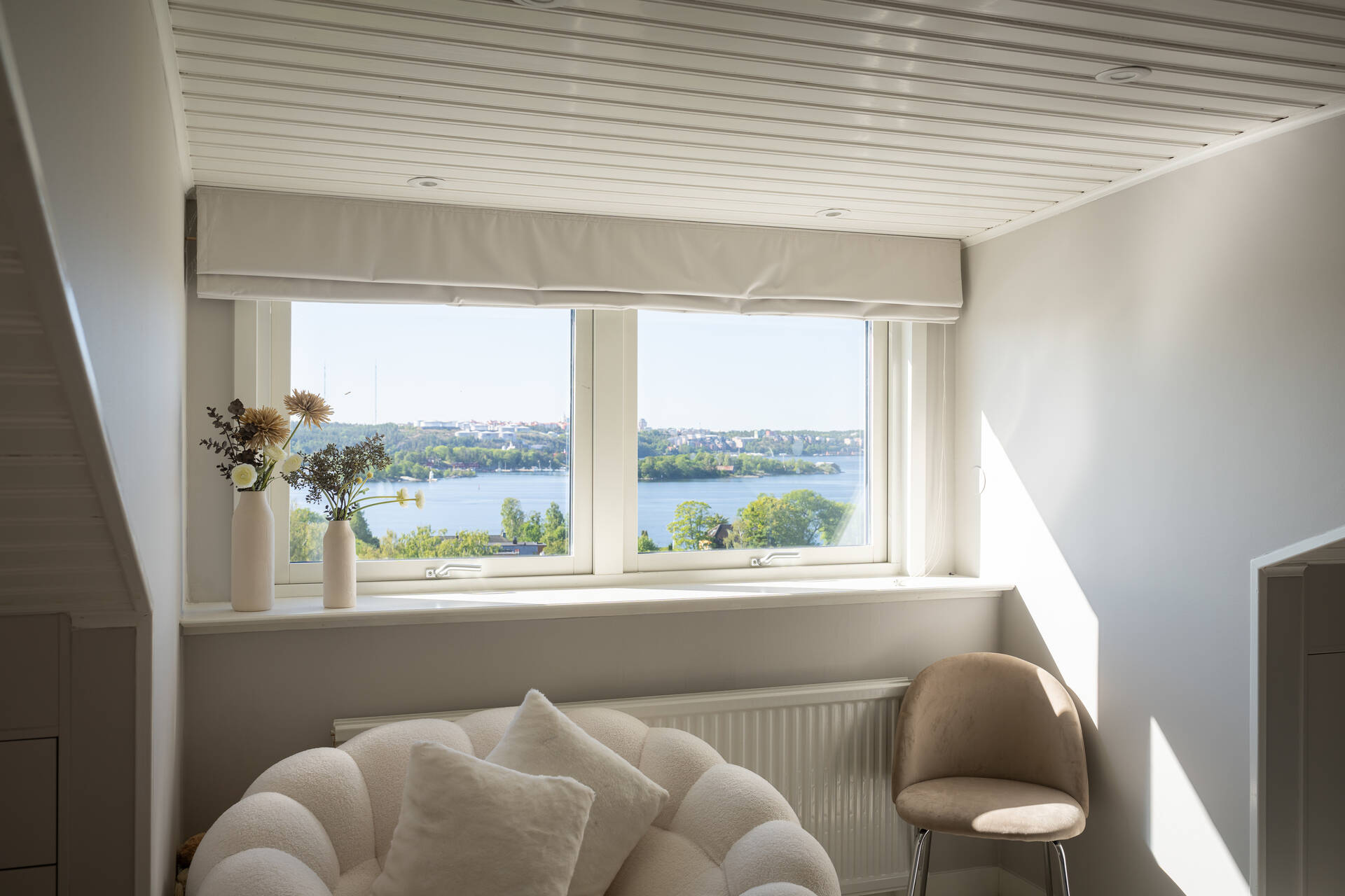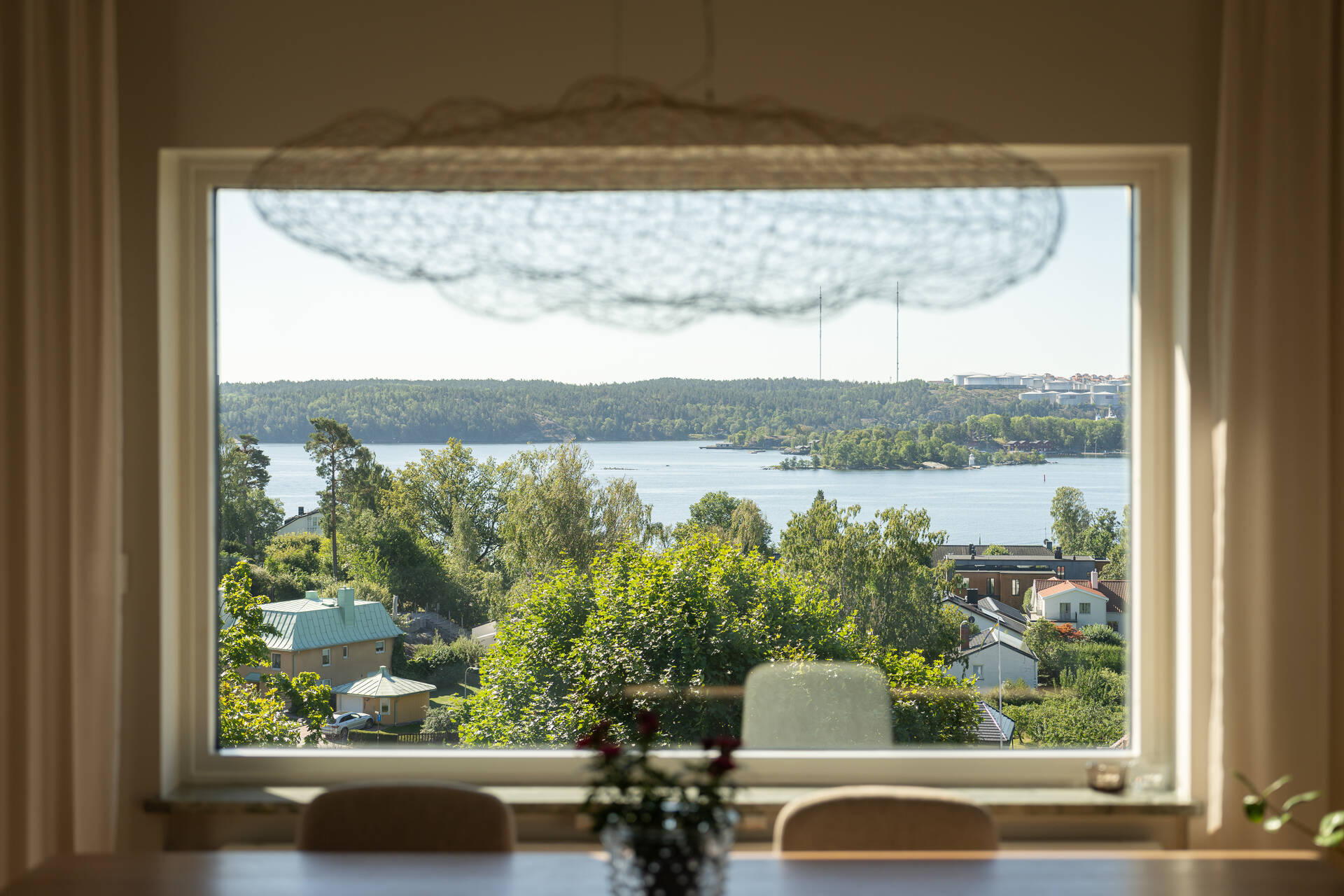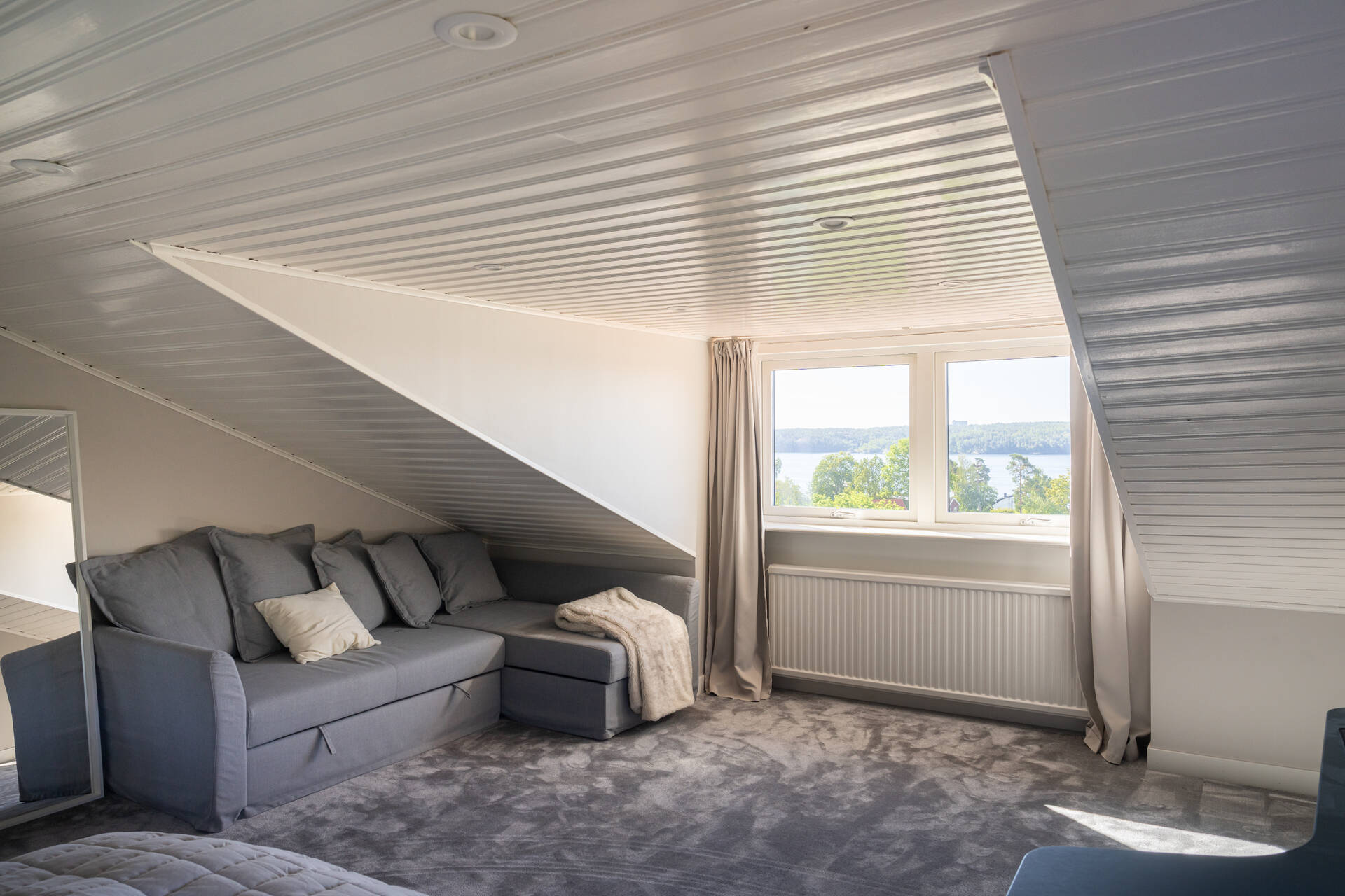 På övre plan finns två sovrum och ett stort badrum med både badkar och dusch. Även här följer utsikten med genom fönsterpartierna, från både badrum och sovrummen. Källarplanet har gillestuga med öppen spis och de välvda fönstren vittnar om byggåret. Bastu, gym, tvättstuga och flera förvaringsrum gör källarplanet komplett.