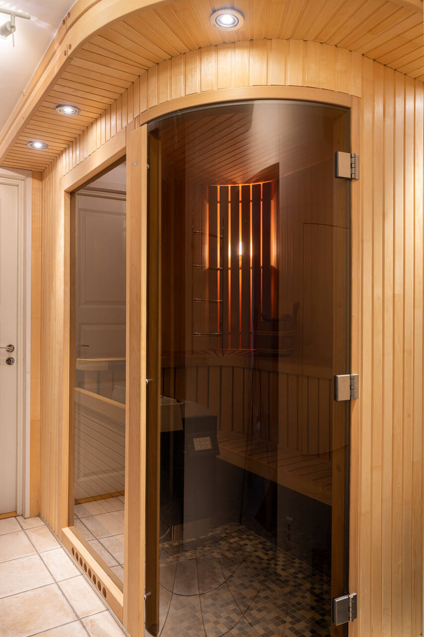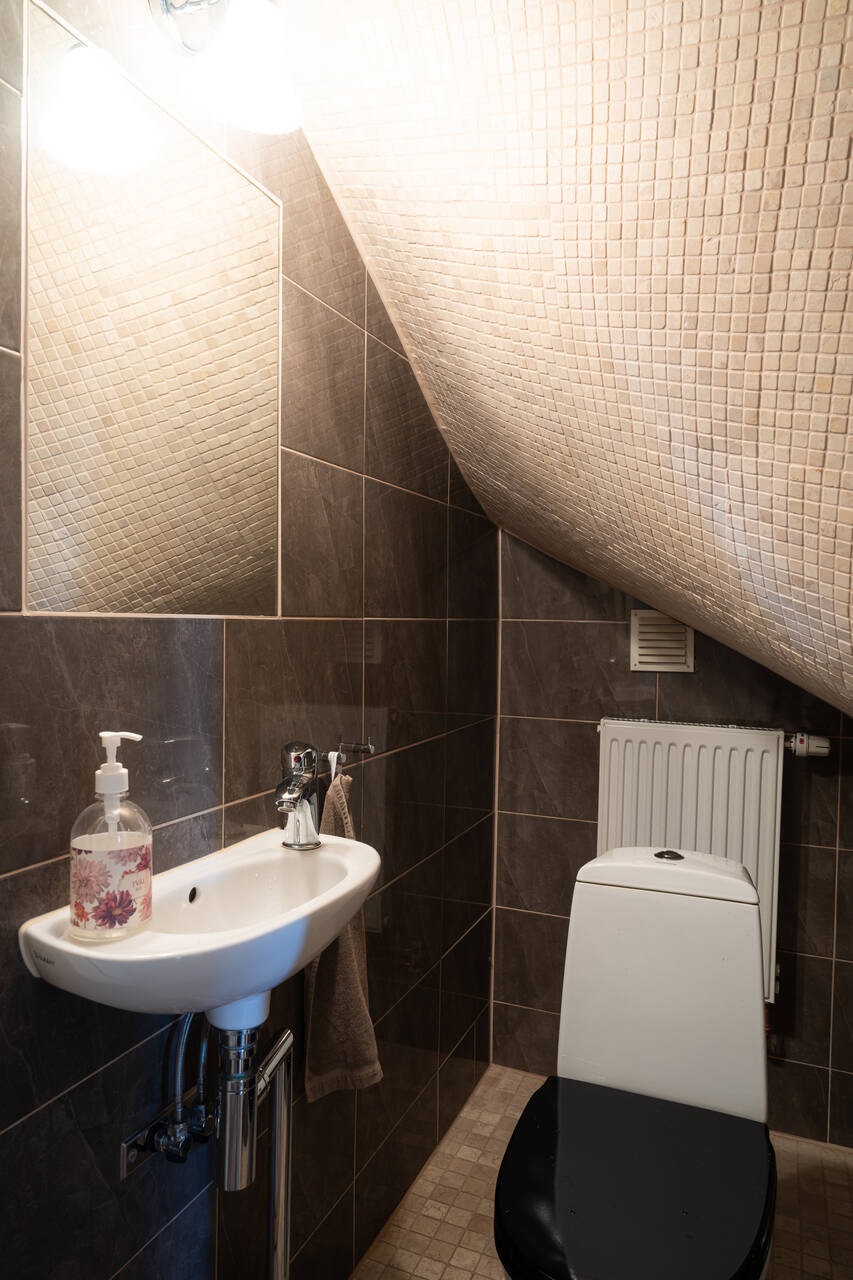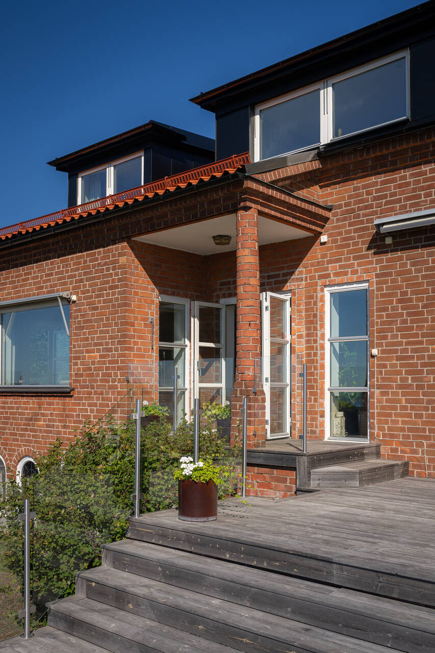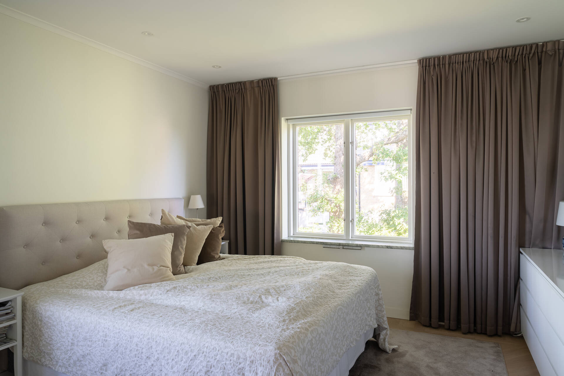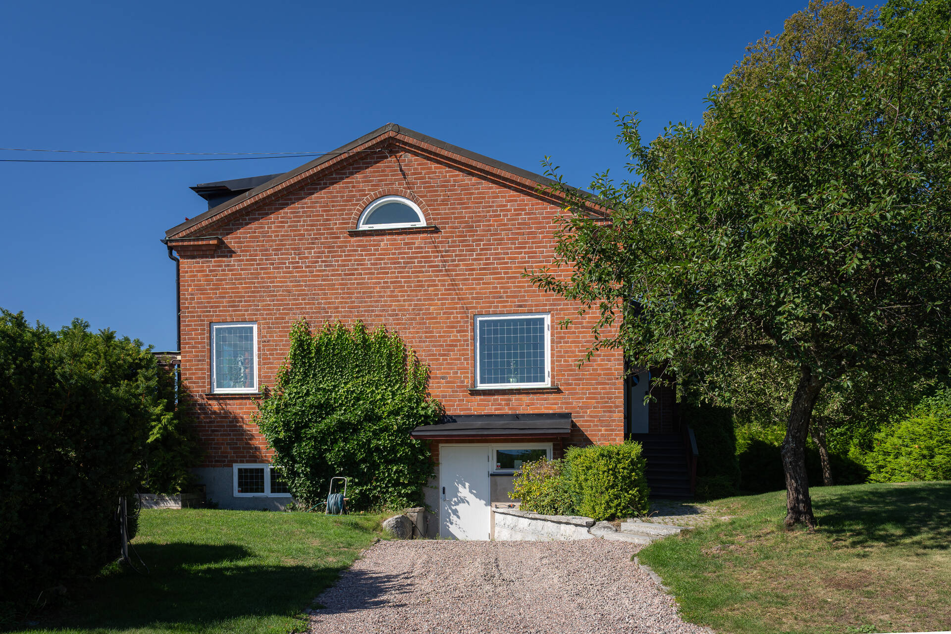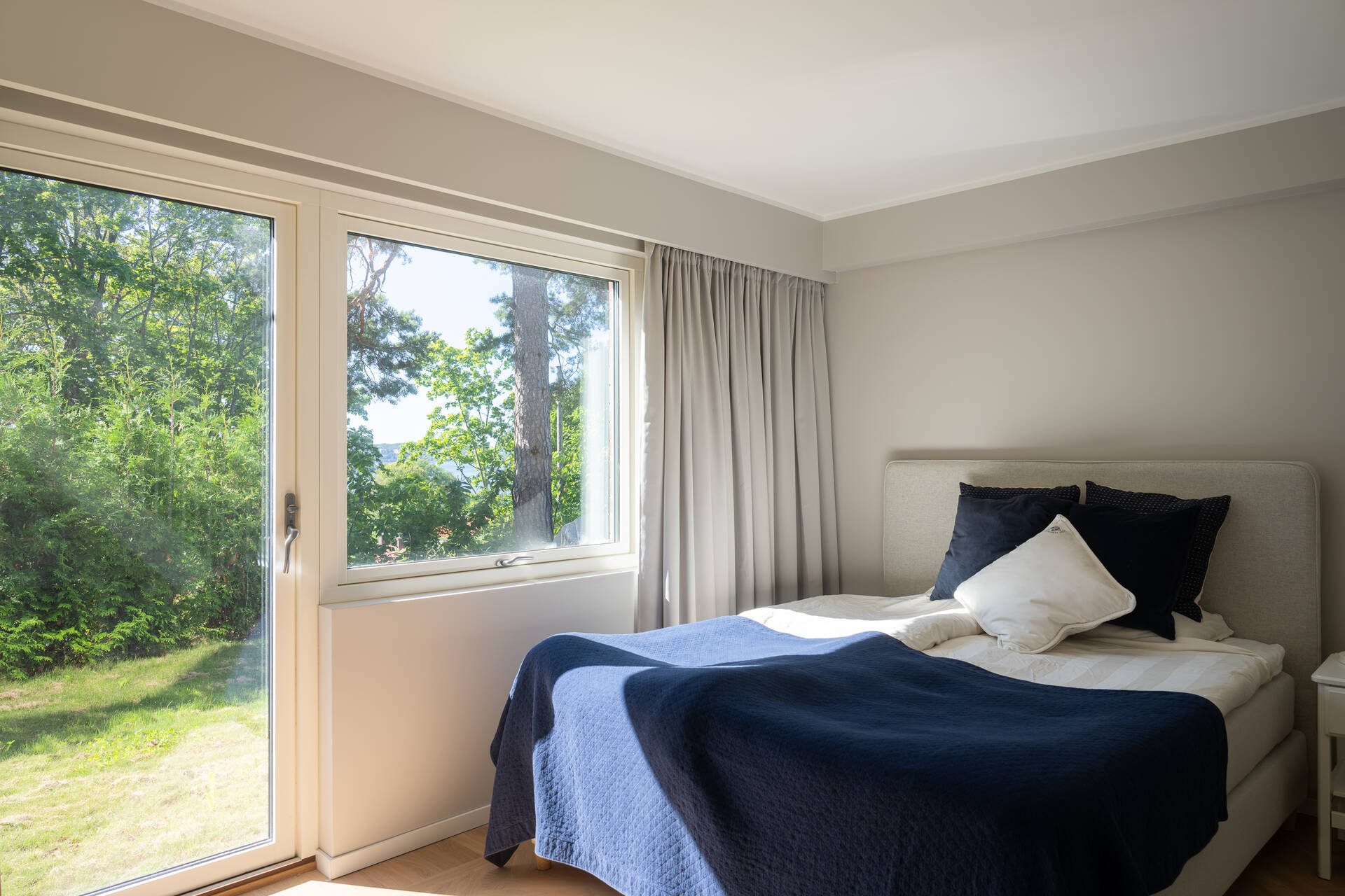 På övre plan finns två sovrum och ett stort badrum med både badkar och dusch. Även här följer utsikten med genom fönsterpartierna, från både badrum och sovrummen. Källarplanet har gillestuga med öppen spis och de välvda fönstren vittnar om byggåret. Bastu, gym, tvättstuga och flera förvaringsrum gör källarplanet komplett.