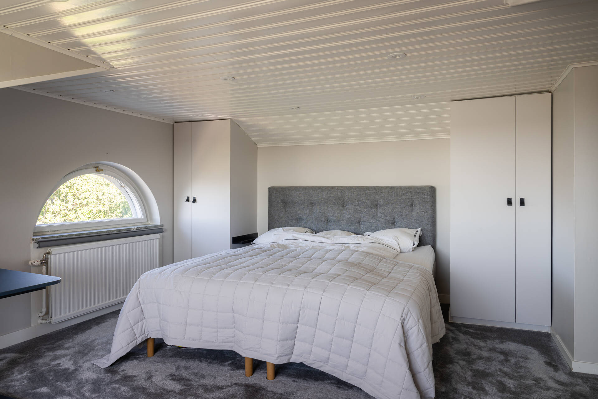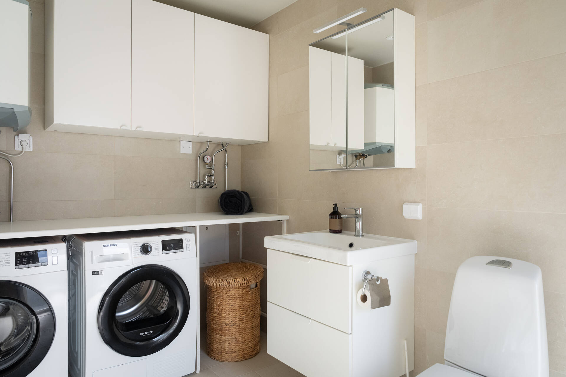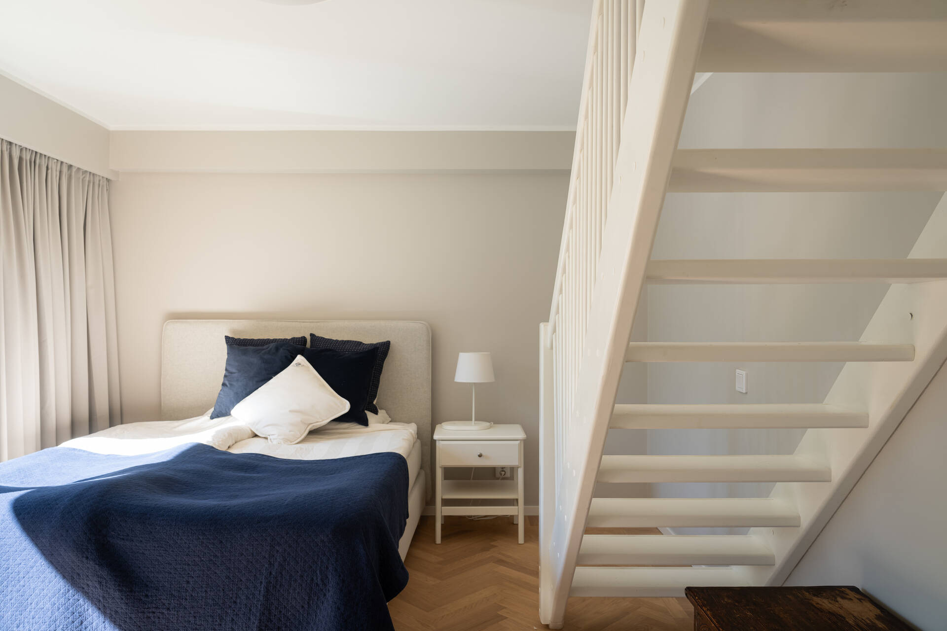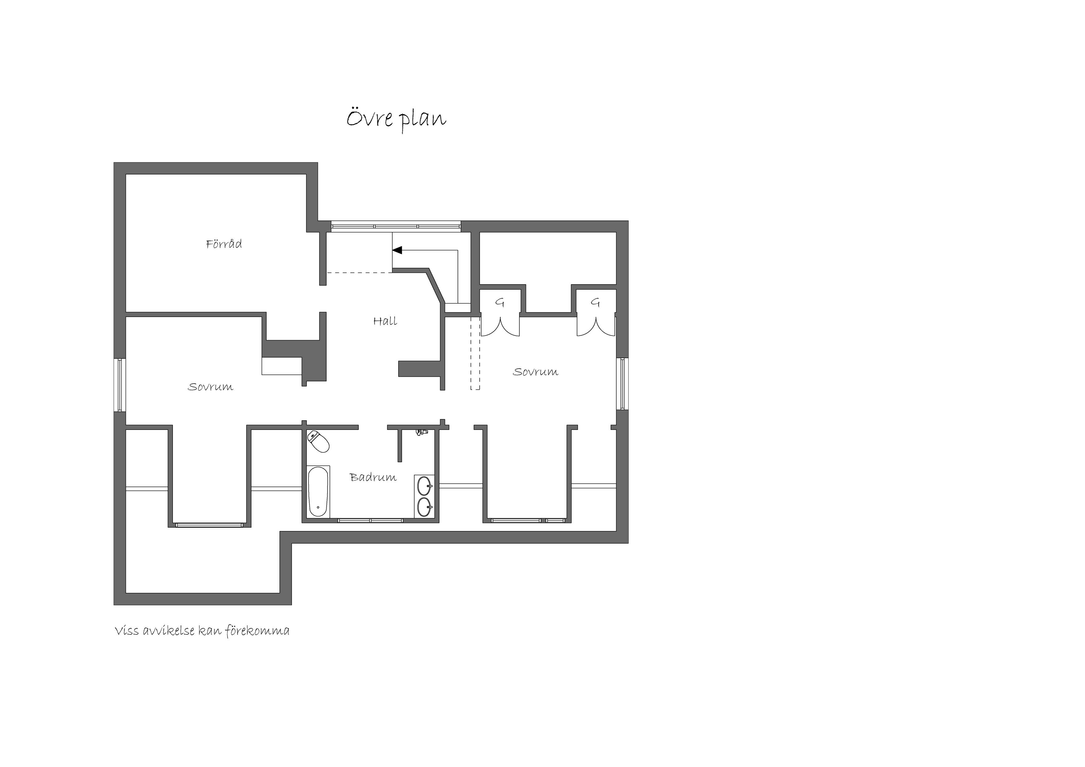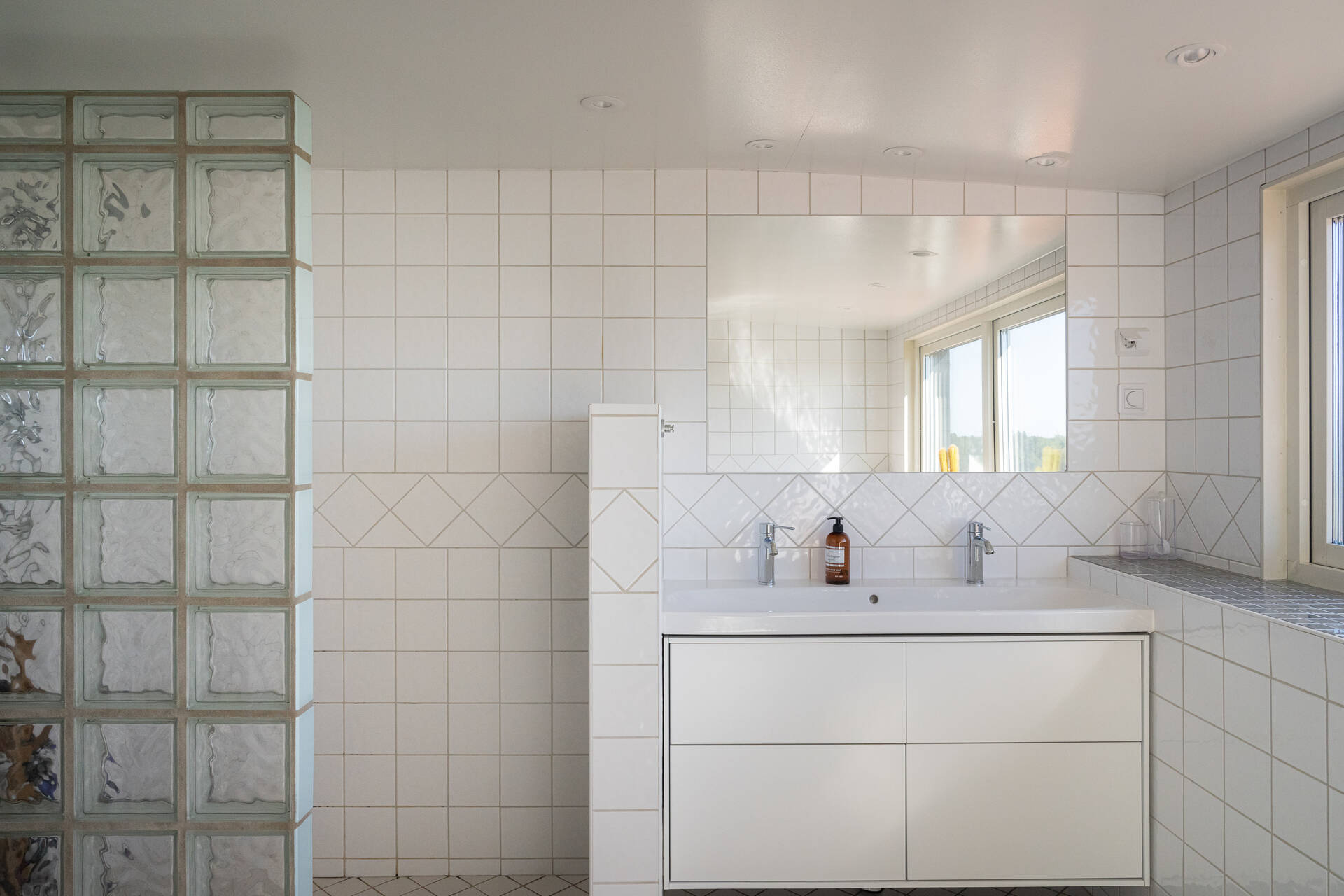 På övre plan finns två sovrum och ett stort badrum med både badkar och dusch. Även här följer utsikten med genom fönsterpartierna, från både badrum och sovrummen. Källarplanet har gillestuga med öppen spis och de välvda fönstren vittnar om byggåret. Bastu, gym, tvättstuga och flera förvaringsrum gör källarplanet komplett.