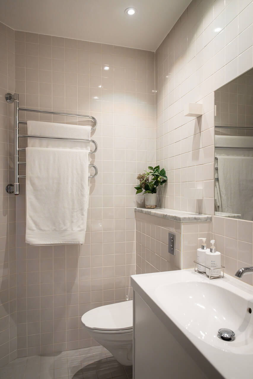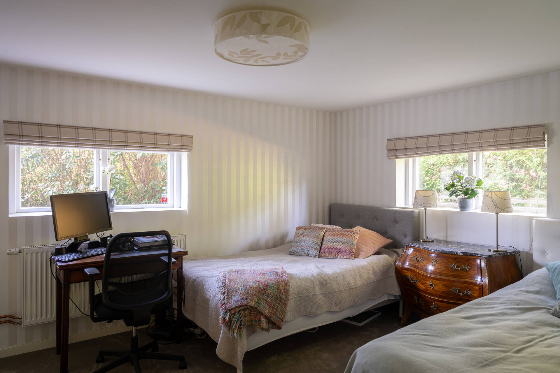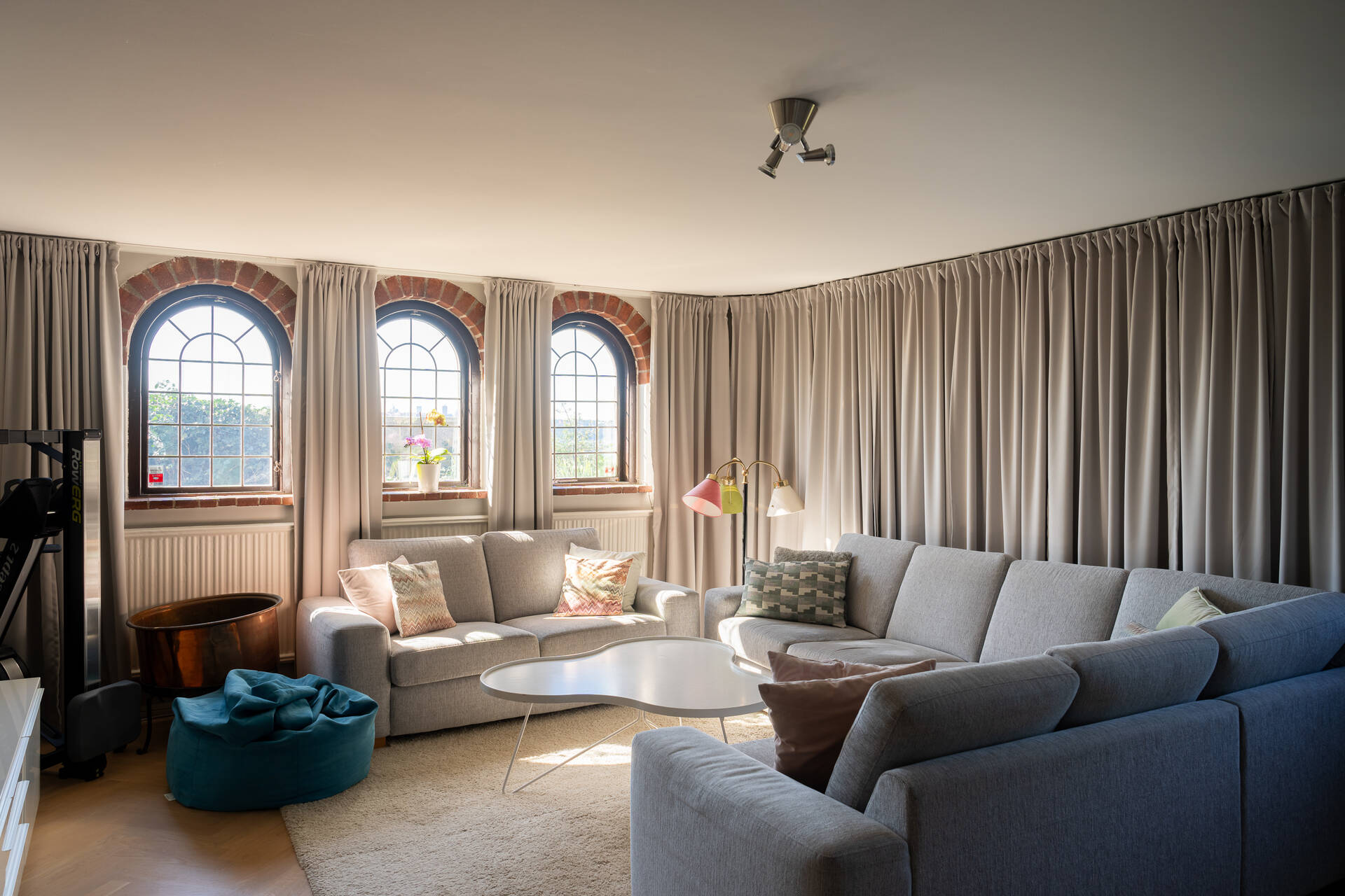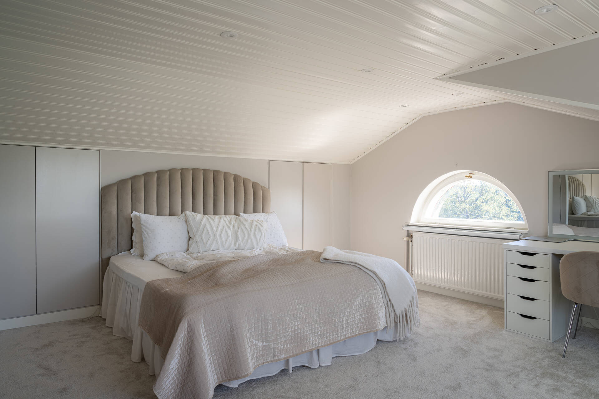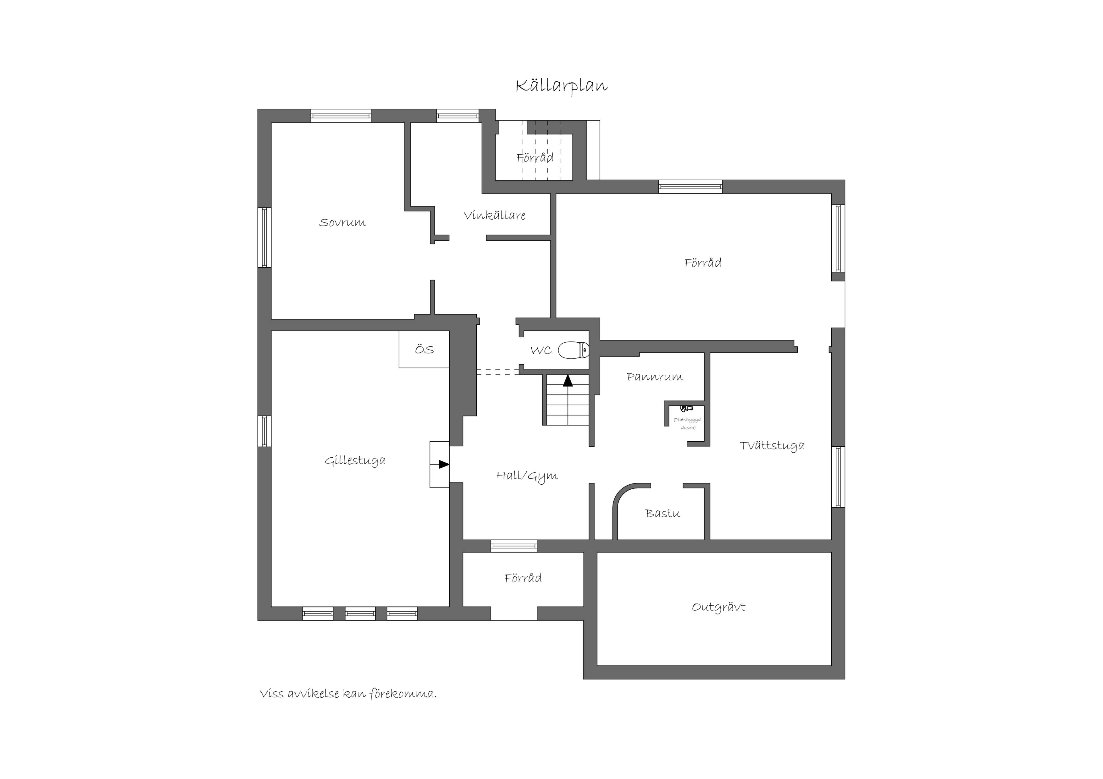 På övre plan finns två sovrum och ett stort badrum med både badkar och dusch. Även här följer utsikten med genom fönsterpartierna, från både badrum och sovrummen. Källarplanet har gillestuga med öppen spis och de välvda fönstren vittnar om byggåret. Bastu, gym, tvättstuga och flera förvaringsrum gör källarplanet komplett.