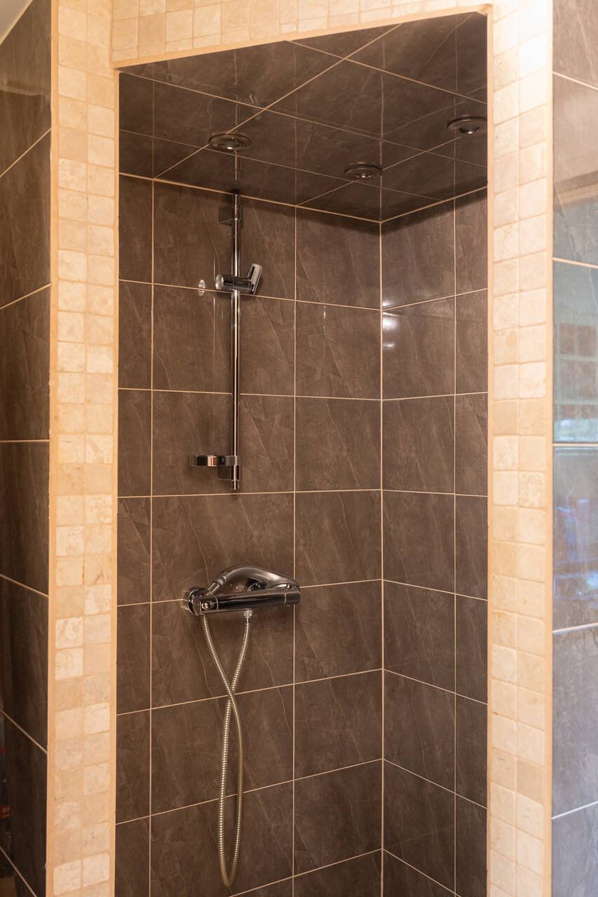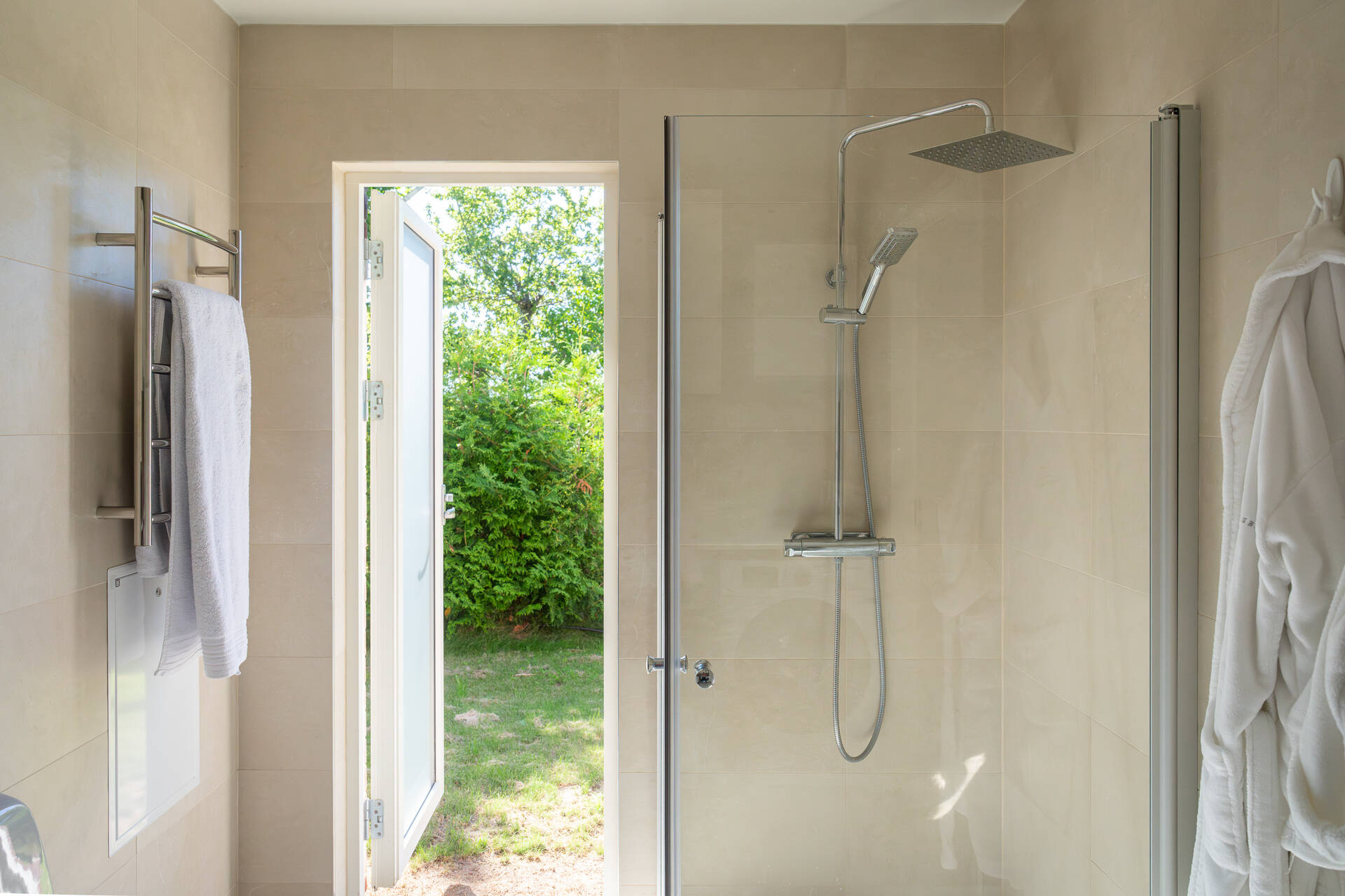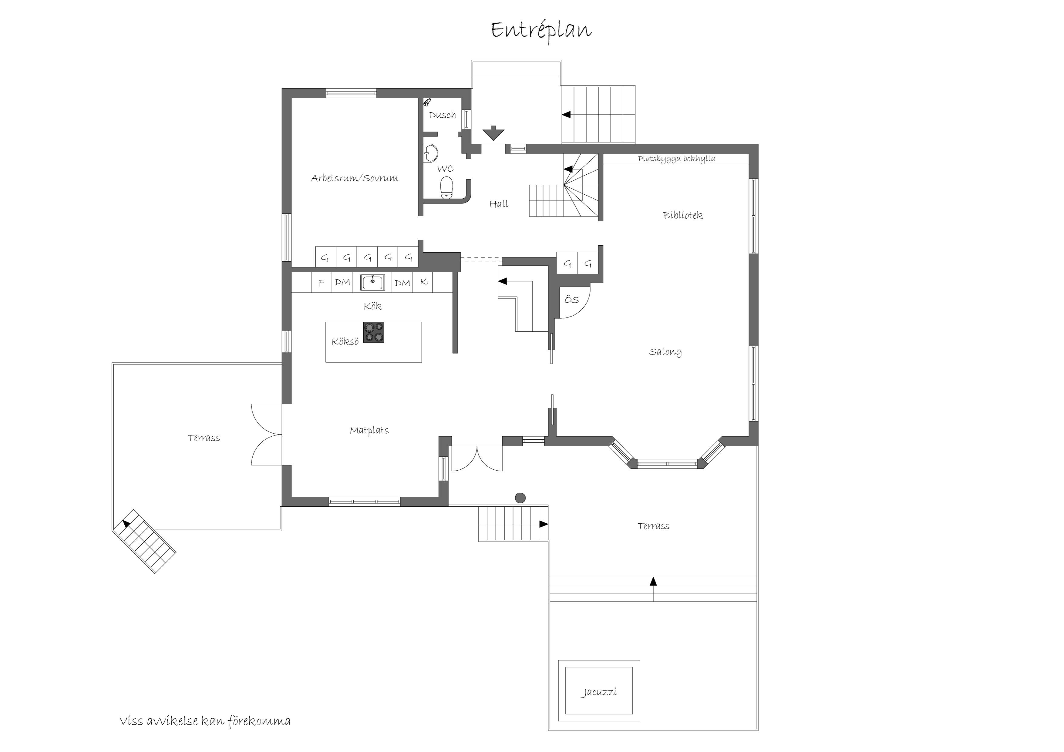 Entréhallen med kalkstensgolv leder genom hela huset och mynnar ut i en pardörr ut mot uteplatsen i söderläge. Trätrallen i olika nivåer erbjuder flera uteplatser i olika väderstreck och några trappsteg ner finns en nedsänkt jacuzzi och plats för solstolar.