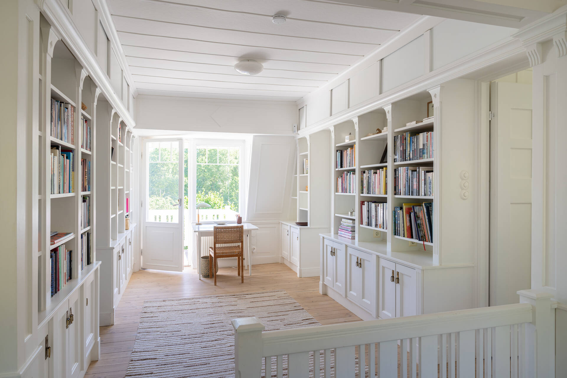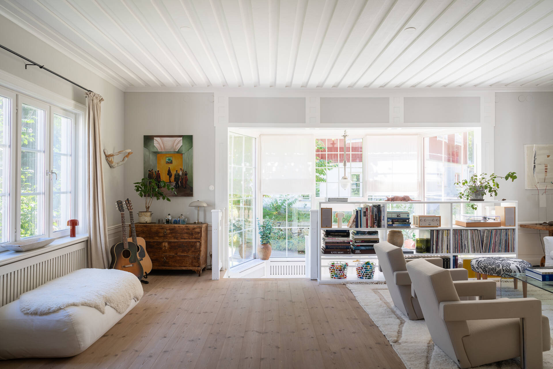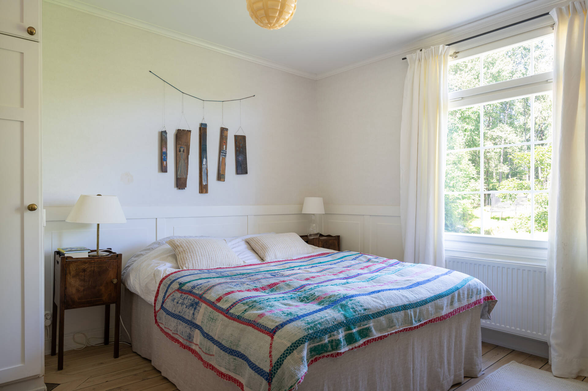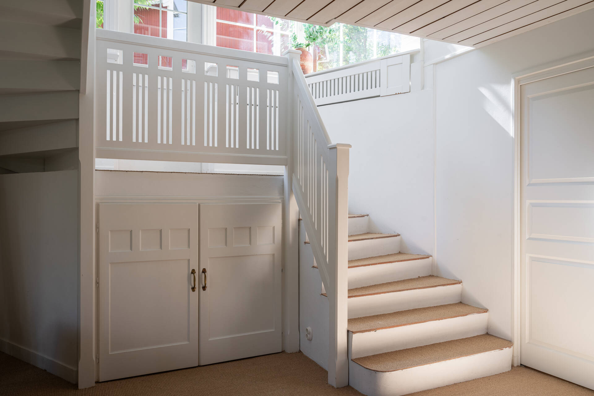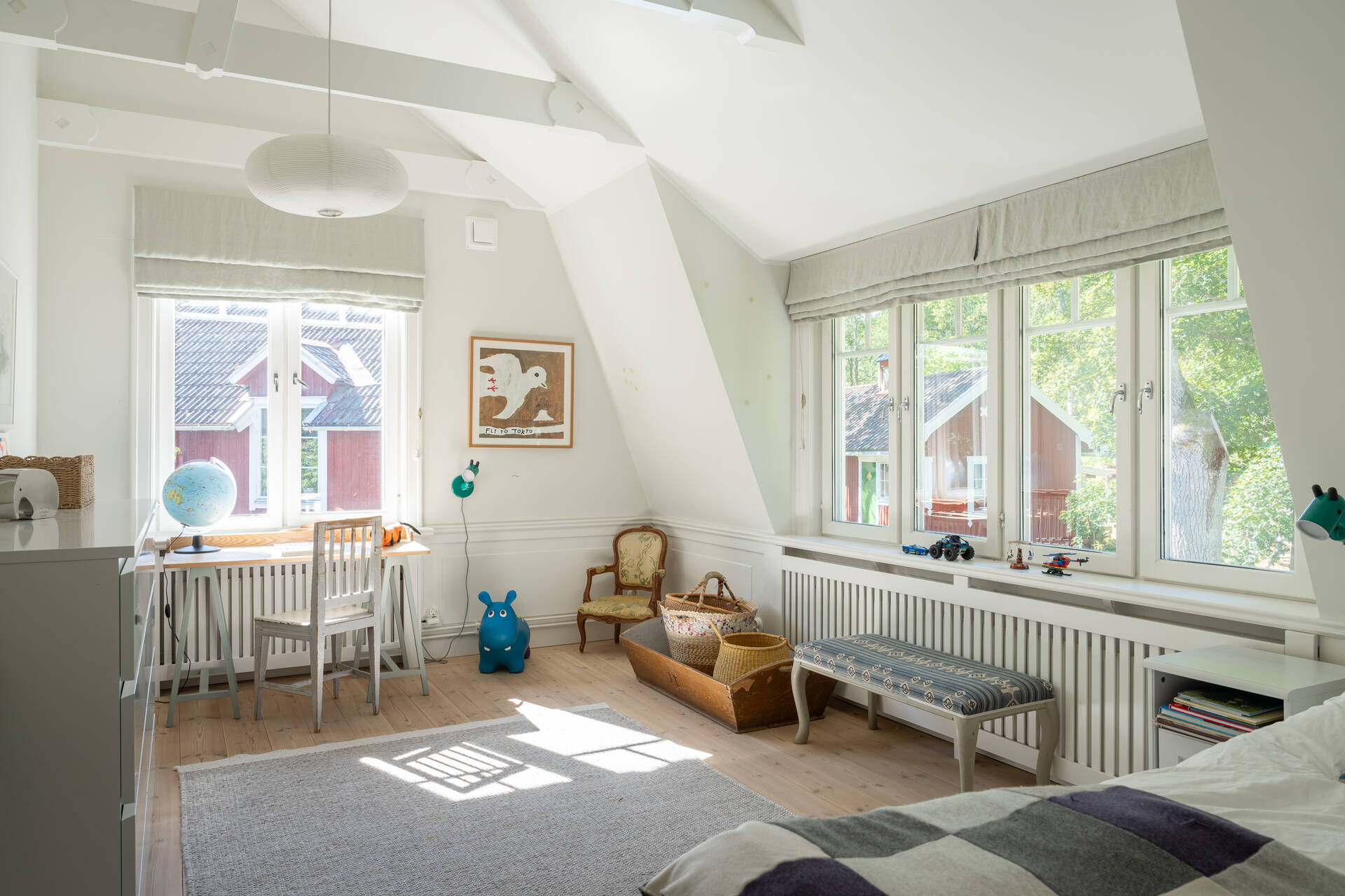 Köket är strategiskt placerat mellan matsal och köksentré och kombinerar funktionalitet med närhet till utemiljöer. På övre plan möts man av ett platsbyggt bibliotek med utgång till balkong mot trädgårdens grönska. Två sovrum med vackra exponerade takbjälkar samt ytterligare ett rymligt sovrum. Stilrent badrum med dubbelhandfat kompletterar våningsplanet. Källarplan erbjuder tvättstuga, badrum, gott om förvaringsutrymmen och egen ingång som kan omdisponeras till en egen lägenhet praktiskt för en au-pair eller uthyrningsmöjlighet. Gott om extra förvaring i förrådet som också inhyser en fin vedeldad bastu.